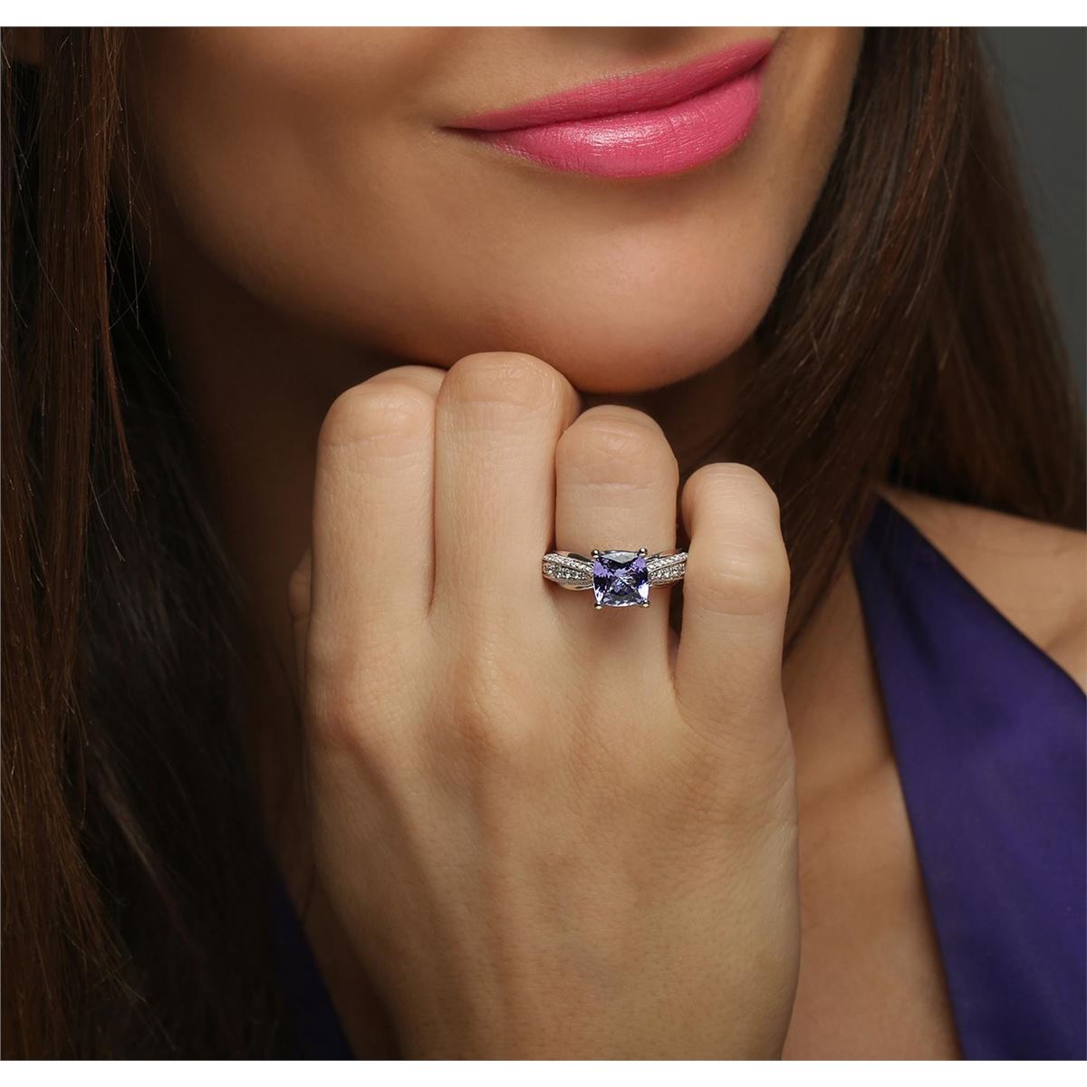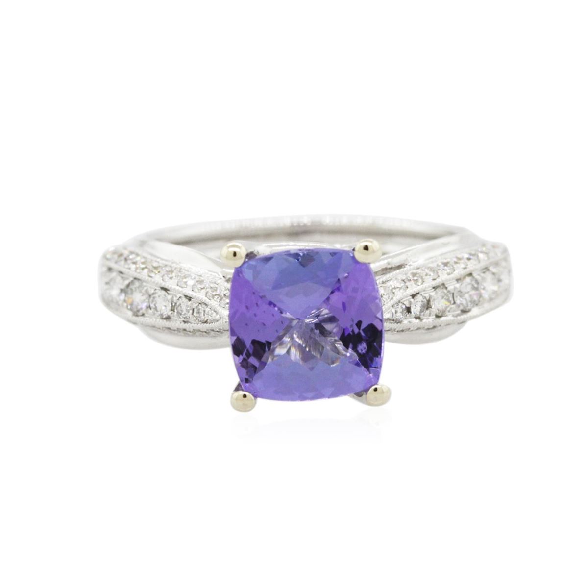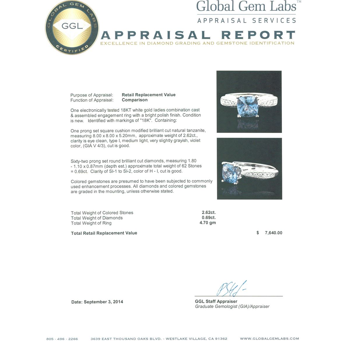 One electronically tested 18KT white gold ladies combination cast & assembled engagement ring with a bright polish finish. Identified with markings of "18K". Condition is new. Containing: One prong set square cushion modified brilliant cut natural tanzanite, measuring 8.00 x 8.00 x 5.20mm, approximate weight of 2.62ct., clarity is eye clean, type I, medium light, very slightly grayish, violet color, (GIA V 4/3), cut is good. Sixty-Two prong set round brilliant cut diamonds, measuring 1.80 - 1.10 x 0.87mm (depth est.) approximate total weight of 62 Stones = 0.69ct. Clarity: SI-1 to SI-2. Color: H - I, Cut is Good. Colored gemstones are presumed to have been subjected to commonly used enhancement processes. All diamonds and colored gemstones are graded in the mounting, unless otherwise stated. Total Weight of Colored Stones 2.62ct. Total Weight of Diamonds 0.69ct. Total Weight of Ring 4.70 grams. GGL Appraised at $7,640.00.