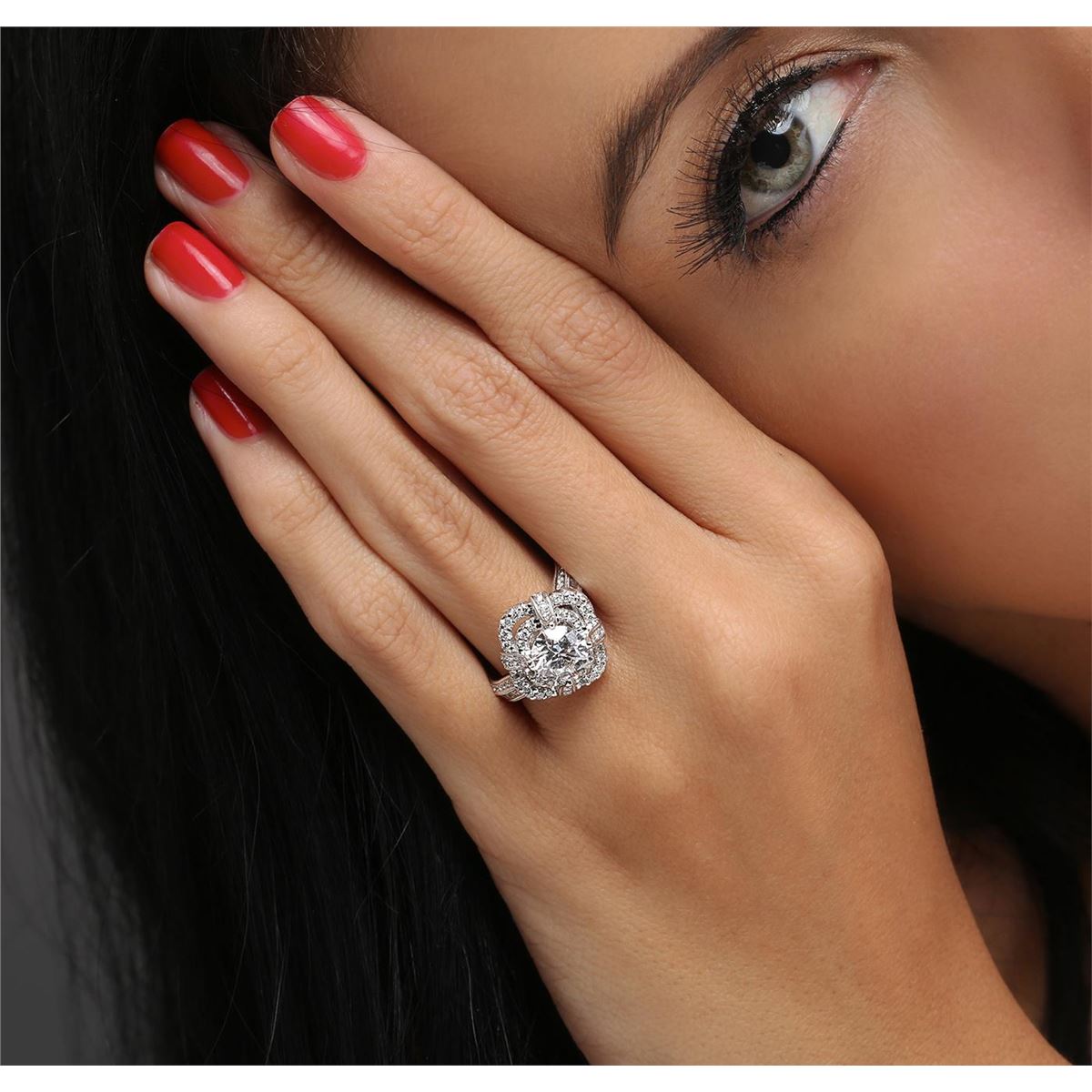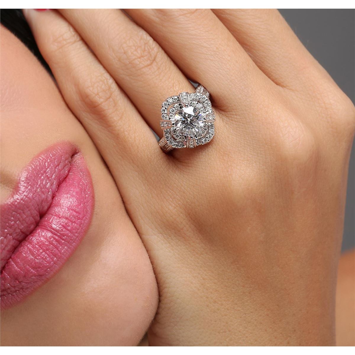 One electronically tested 18KT white gold ladies cast diamond unity ring. The featured diamond is set within a stylized tiered diamond bezel supported by diamond set shoulders, completed by a three millimeter wide band. Bright polish finish with milgrain detailing. Identified with markings of "18K 750". Condition is new, good workmanship. Containing: One prong set round brilliant cut diamond, measuring 7.25 - 7.22 x 4.50mm (depth est.) approximate weight of 1.53ct with a medium blue fluorescence. Graded in the setting. Clarity: I-1. Color: 62.2%. Table 56.7%. Ninety-Six prong set round brilliant cut diamonds, measuring 1.50 - 1.10 x 0.78mm (depth est.) approximate total weight of 96 Stones = 0.86ct. Graded in the setting. Clarity: VS-2 to SI-2. Color: G - I Twelve channel set baguette cut diamonds, measuring from 2.10 x 1.20 x 0.84mm (depth est.) to 2.20 x 1.30 x 0.91mm (depth est.) approximate total weight of 12 Stones = 0.25ct. Graded in the setting. Clarity: VVS-1 to VVS-2 Color G - H. Total Weight of Diamonds 2.64ct. Total Weight of Ring 9.09 grams. AIG Appraised at $27,550.00.