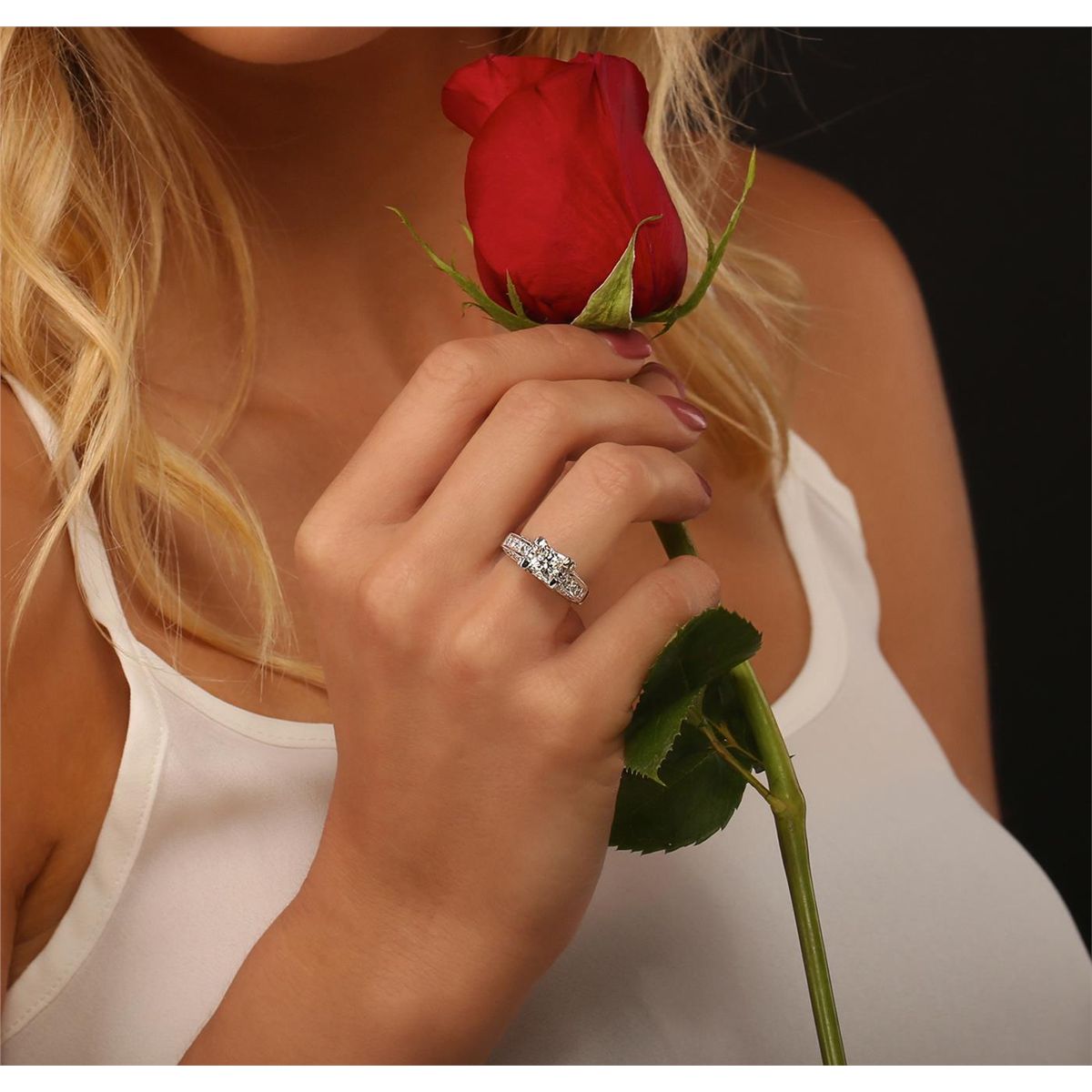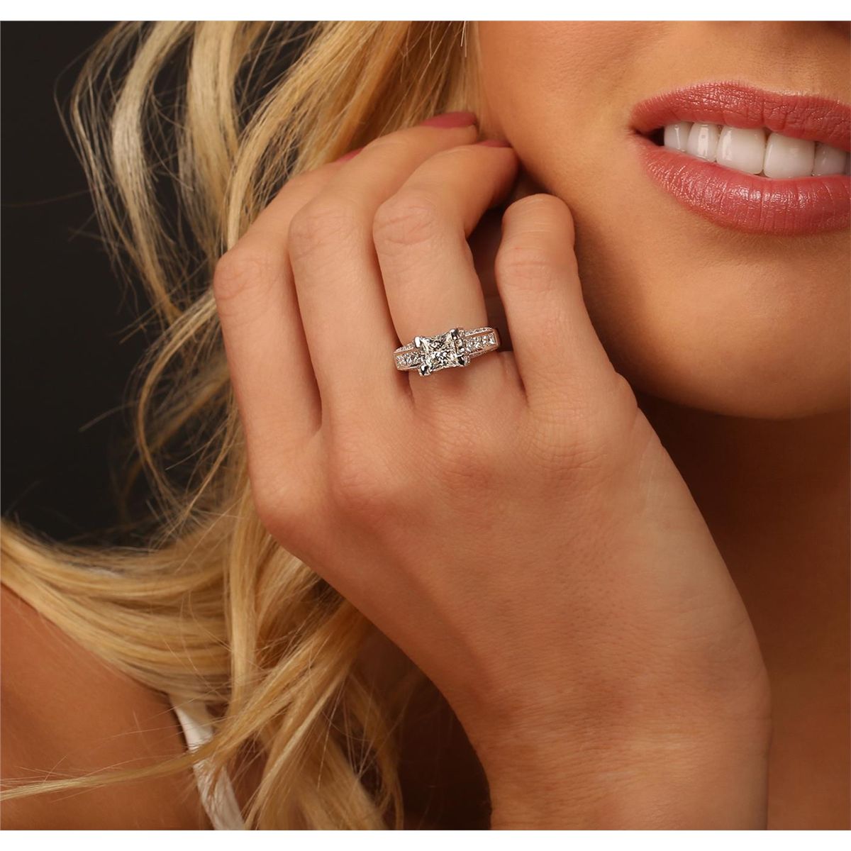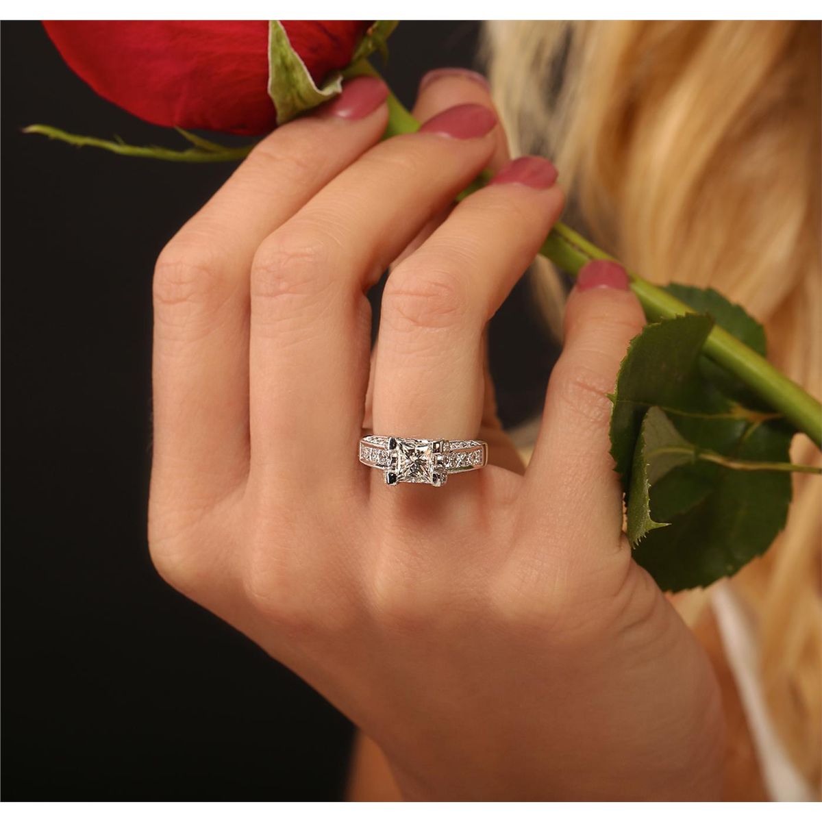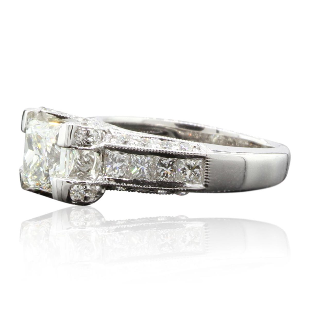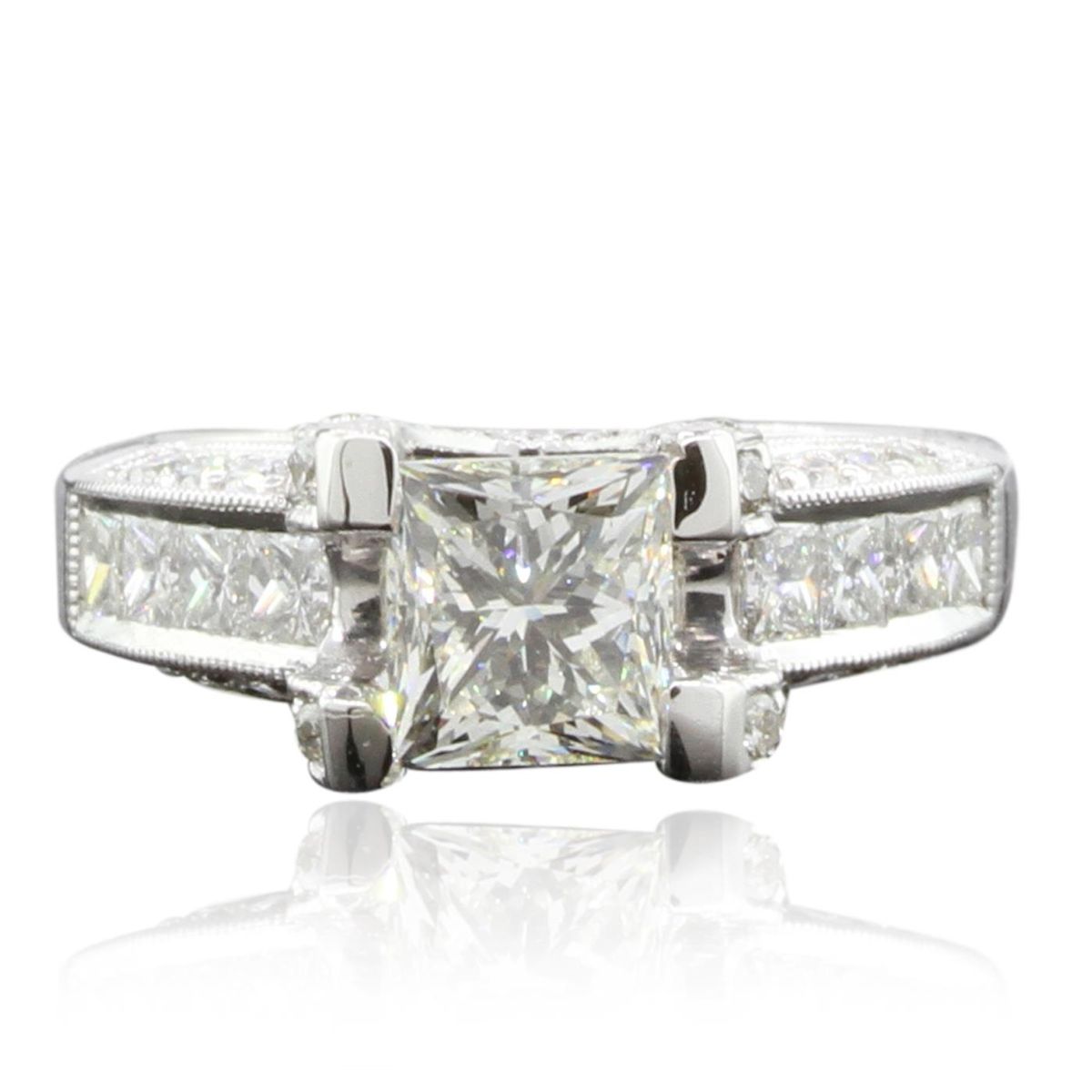 One electronically tested 18KT white gold Ladies combination cast & assembled engagement ring with a bright polish finish. Identified with markings of "18K". Condition is excellent. Containing: One prong set princess cut diamond, measuring 6.00 x 5.50 x 4.60mm (depth est.) approximate weight of 1.38ct. Clarity of VS-1, Color of L, Cut is Very Good. Eight channel set princess cut diamonds, measuring 2.50 x 2.50 x 1.89mm (depth est.) approximate total weight of 8 Stones = 0.93ct. Clarity of VS-1, Color of H - I, Cut is Very Good. Thirty-Four bead set round brilliant cut diamonds, measuring 1.50 - 1.20 x 0.81mm (depth est.) approximate total weight of 34 Stones = 0.35ct. Clarity of VS-2 to SI-1, Color of H - I, Cut is Very Good. Total Weight of Diamonds 2.66ct. Total Weight of Ring 5.40gm. GGL Appraised at $18,650.00.
