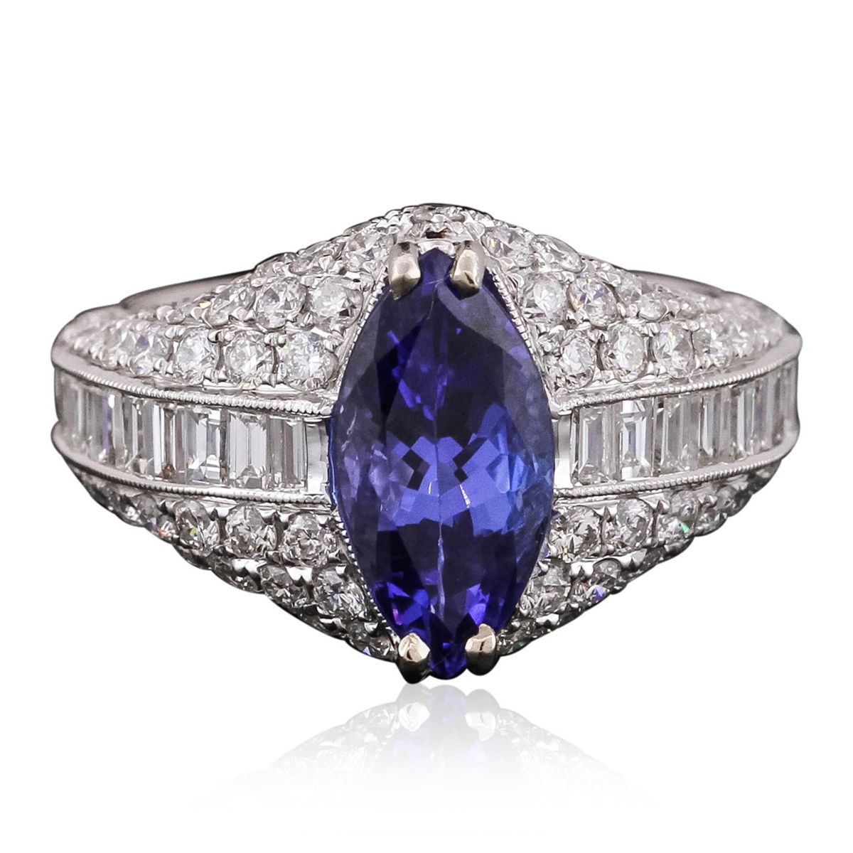 One electronically tested 18KT white gold ladies combination cast & assembled prong set ring with a bright polish finish. Identified with markings of "750". Condition is new. Containing: One prong set marquise modified brilliant cut natural tanzanite, measuring 12.66 x 7.23 x 4.70mm, approximate weight of 2.74ct., clarity is eye clean, type I, medium dark, moderately strong, bluish violet color, (GIA bV 6/4), cut is good. Ninety-Four prong set round brilliant cut diamonds, measuring 1.60 - 1.60 x 0.96mm (depth est.) approximate total weight of 94 Stones = 1.54ct. Clarity: SI-1. Color: I, Cut is Good. Twenty-Two channel set baguette cut diamonds, measuring 2.00 x 1.50 x 1.28mm (depth est.) approximate total weight of 22 Stones = 0.92ct. Clarity: VS-2. Color: I, Cut is Good. Colored gemstones are presumed to have been subjected to commonly used enhancement processes. All diamonds and colored gemstones are graded in the mounting, unless otherwise stated. Total Weight of Colored Stones 2.74ct. Total Weight of Diamonds 2.46ct. Total Weight of Ring 7.20 grams. GGL Appraised at $12,940.00.