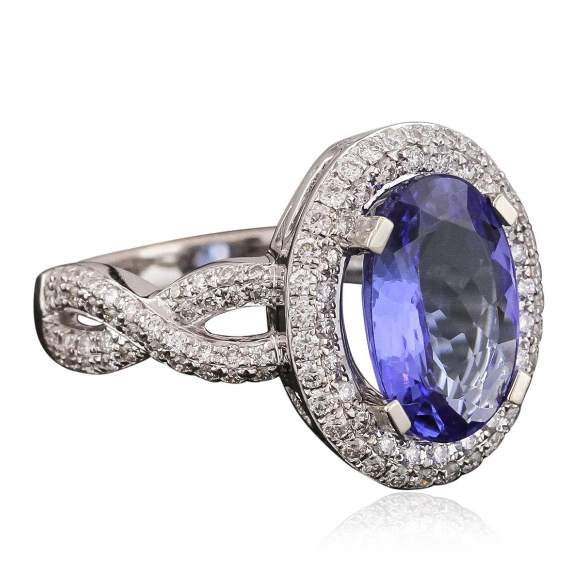 One electronically tested 18KT white gold ladies combination cast & assembled prong set ring with a split shank with a bright polish finish. Identified with markings of "750 18K". Condition is new. Containing: One prong set oval modified brilliant cut natural tanzanite, measuring 11.81 x 7.80 x 4.33mm, approximate weight of 2.79ct., clarity is eye clean, type I, medium light, very slightly grayish, violet color, (GIA V 4/3), cut is good. One Hundred Thirty-Five bead set round brilliant cut diamonds, measuring 1.00 - 1.00 x 0.60mm (depth est.) approximate total weight of 135 Stones = 0.59ct. Clarity: I-1 to I-2. Color: H - I, Cut is Good. All diamonds are graded in the mounting, unless otherwise stated, Colored gemstones are presumed to have been subjected to commonly used enhancement processes. Total Weight of Colored Stones 2.79ct. Total Weight of Diamonds 0.59ct. Total Weight of Ring 6.30 grams. GGL Appraised at $8,480.00.