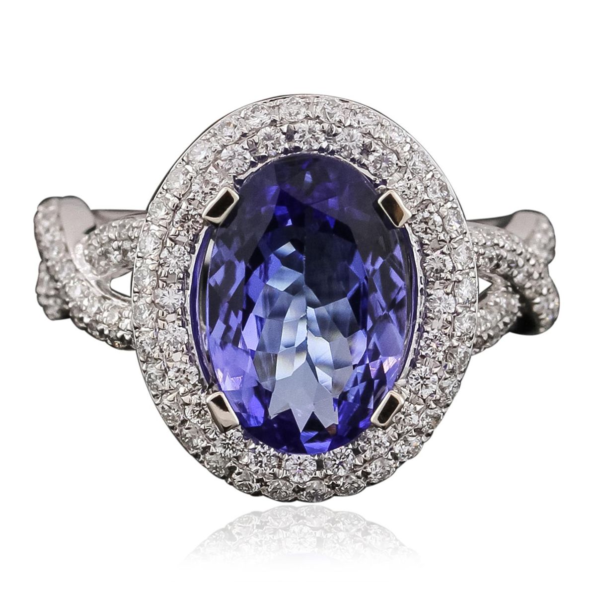 One electronically tested 18KT white gold ladies combination cast & assembled prong set ring with a split shank with a bright polish finish. Identified with markings of "750 18K". Condition is new. Containing: One prong set oval modified brilliant cut natural tanzanite, measuring 11.81 x 7.80 x 4.33mm, approximate weight of 2.79ct., clarity is eye clean, type I, medium light, very slightly grayish, violet color, (GIA V 4/3), cut is good. One Hundred Thirty-Five bead set round brilliant cut diamonds, measuring 1.00 - 1.00 x 0.60mm (depth est.) approximate total weight of 135 Stones = 0.59ct. Clarity: I-1 to I-2. Color: H - I, Cut is Good. All diamonds are graded in the mounting, unless otherwise stated, Colored gemstones are presumed to have been subjected to commonly used enhancement processes. Total Weight of Colored Stones 2.79ct. Total Weight of Diamonds 0.59ct. Total Weight of Ring 6.30 grams. GGL Appraised at $8,480.00.