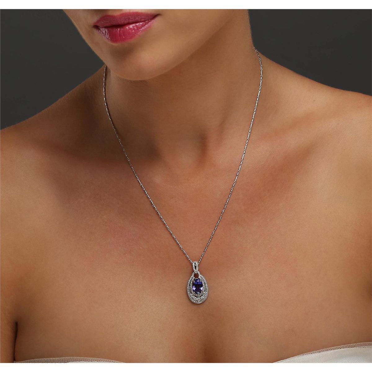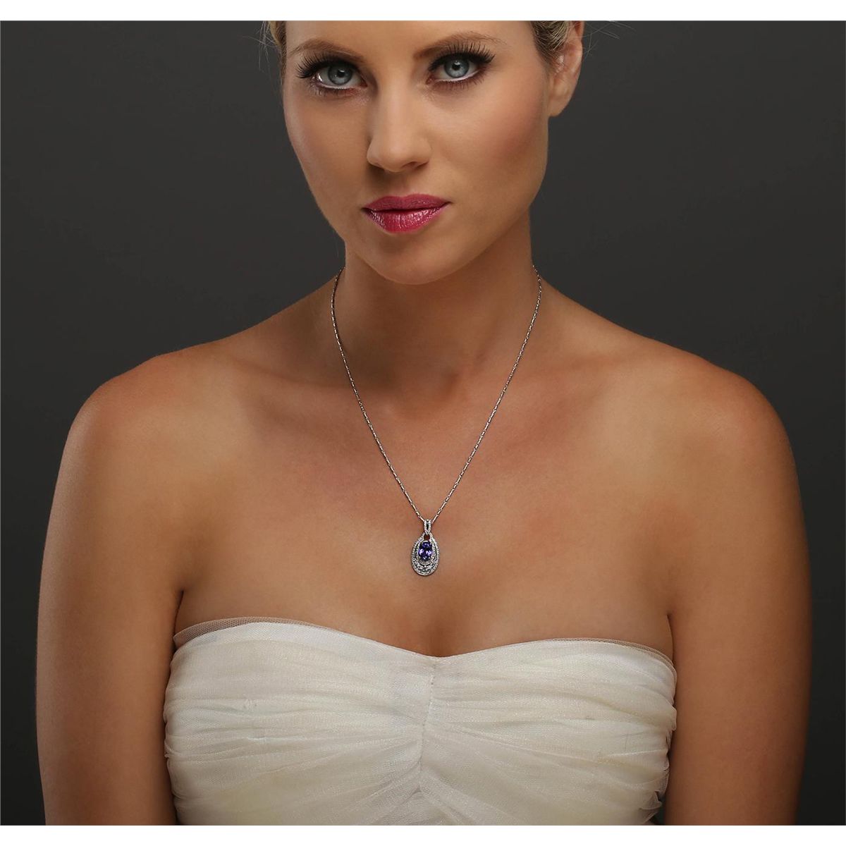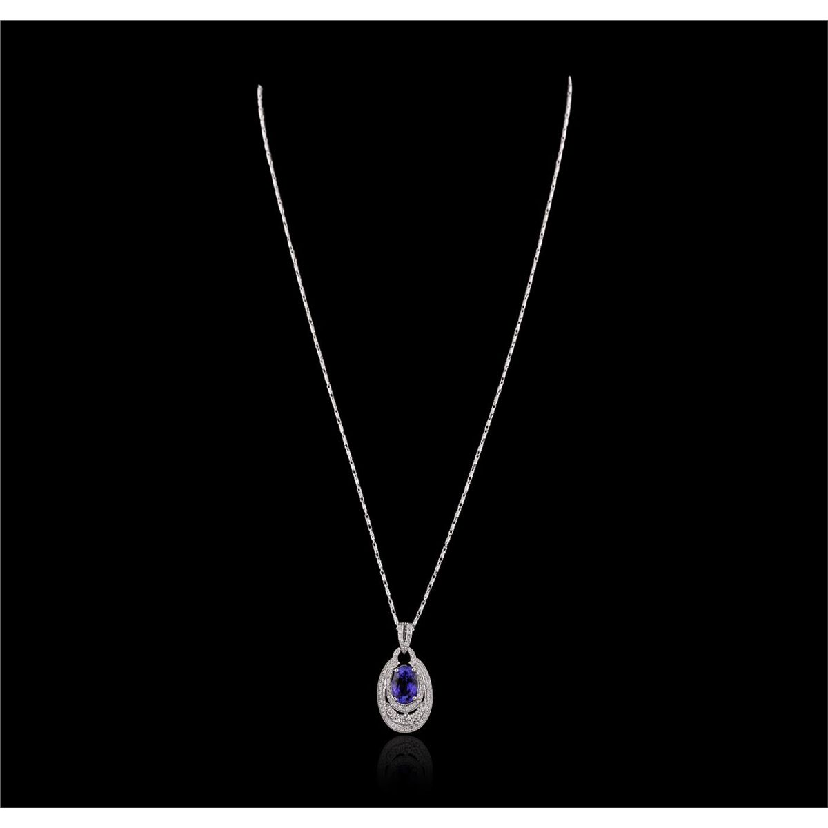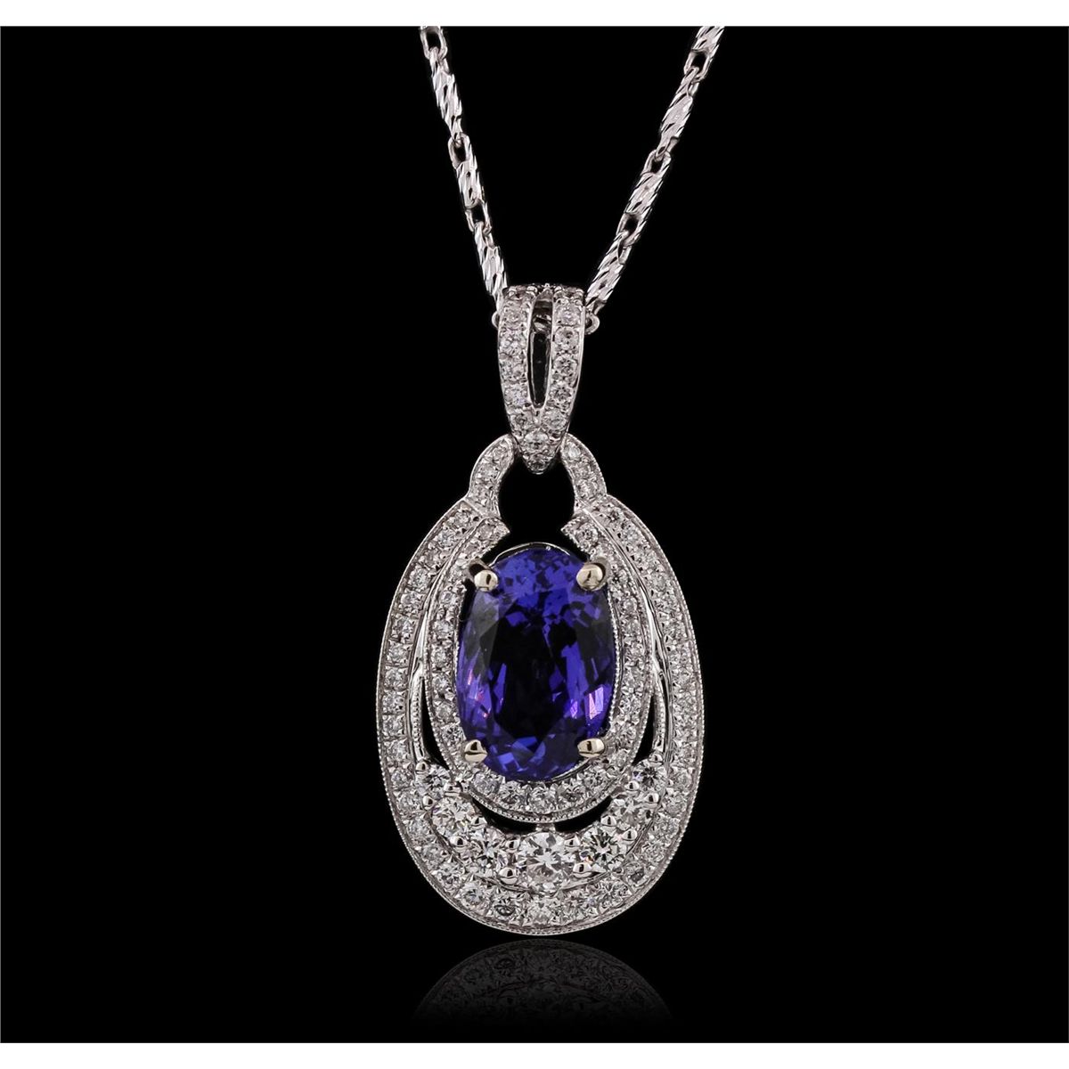 One electronically tested 18KT White Gold ladies cast & assembled tanzanite and diamond pendant with chain. The pendant features a tanzanite set within an elaborate diamond gallery, completed by a diamond set bail. The pendant is supported by an eighteen inch length 14KT White Gold designer style chain, terminating in a lobster claw clasp. Bright polish finish with milgrain detailing. Identified with markings of "750". Condition is new, good workmanship. Containing: One prong set oval brilliant cut natural tanzanite, measuring 10.10 x 6.90 x 5.35mm, 8% bulge factor, approximate weight of 2.80ct., clarity is eye clean, type I, dark, very slightly grayish, violetish blue color, (GIA vB 7/3), cut is good. Transmitting light with no distortion, transparent. Graded in the setting. Tanzanite is a very rare gemstone that is only found in the country of Tanzania. Originally discovered in 1967. Tiffany & Company, named the stone Tanzanite. It is found in the Usumburu Mountains that border the Umba Valley of northern Tanzania. Tanzanite occurs in gray, brown, violet, blue, reddish-purple, & green. The gem is interesting because of its exceptional pleochroism. Rotated in different directions a tanzanite will exhibit multiple changes of color. Tanzanite has a low tolerance to ultrasonic cleaning, and should not be cleaned using this method. Ninety-One prong set round brilliant cut diamonds approximate total weight of 91 Stones = 0.66ct. Graded in the setting. Clarity: VS-1 to SI-1. Color: G - I. Total Weight of Colored Stones 2.80ct. Total Weight of Diamonds 0.66ct. Total Weight of Pendant With Chain 7.38 grams. AIG Appraised at $10,635.00.