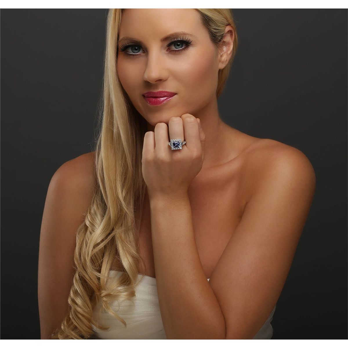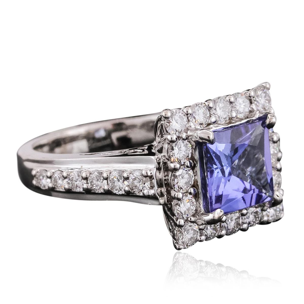 One electronically tested 18KT White Gold ladies cast & assembled tanzanite and diamond ring with a bright polish finish. The featured tanzanite is set within a diamond bezel supported by diamond set shoulders, completed by a three millimeter wide band. Identified with markings of "18K". Condition is new, good workmanship. Containing: One prong set square brilliant cut natural tanzanite, measuring 8.02 x 8.00 x 4.85mm, 8% bulge factor, approximate weight of 2.81ct., clarity is eye clean, type I, medium dark, very slightly grayish, bluish violet color, (GIA bV 6/3), cut is good. Transmitting light with no distortion, transparent. Graded in the setting. Tanzanite is a very rare gemstone that is only found in the country of Tanzania. Originally discovered in 1967. Tiffany & Company, named the stone Tanzanite. It is found in the Usumburu Mountains that border the Umba Valley of northern Tanzania. Tanzanite occurs in gray, brown, violet, blue, reddish-purple, & green. The gem is interesting because of its exceptional pleochroism. Rotated in different directions a tanzanite will exhibit multiple changes of color. Tanzanite has a low tolerance to ultrasonic cleaning, and should not be cleaned using this method. Twenty-Eight prong set round brilliant cut diamonds approximate total weight of 28 Stones = 1.44ct. Graded in the setting. Clarity: SI-1 to SI-2. Color: G - I. Total Weight of Colored Stones 2.81ct. Total Weight of Diamonds 1.44ct. Total Weight of Ring 10.30 grams. AIG Appraised at $12,750.00.