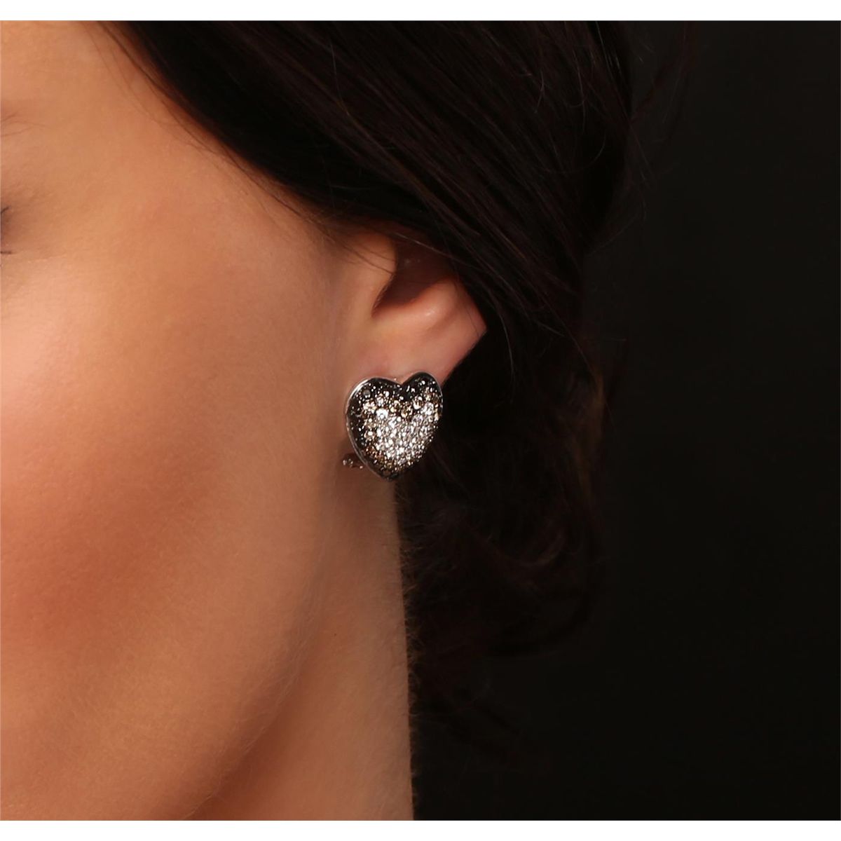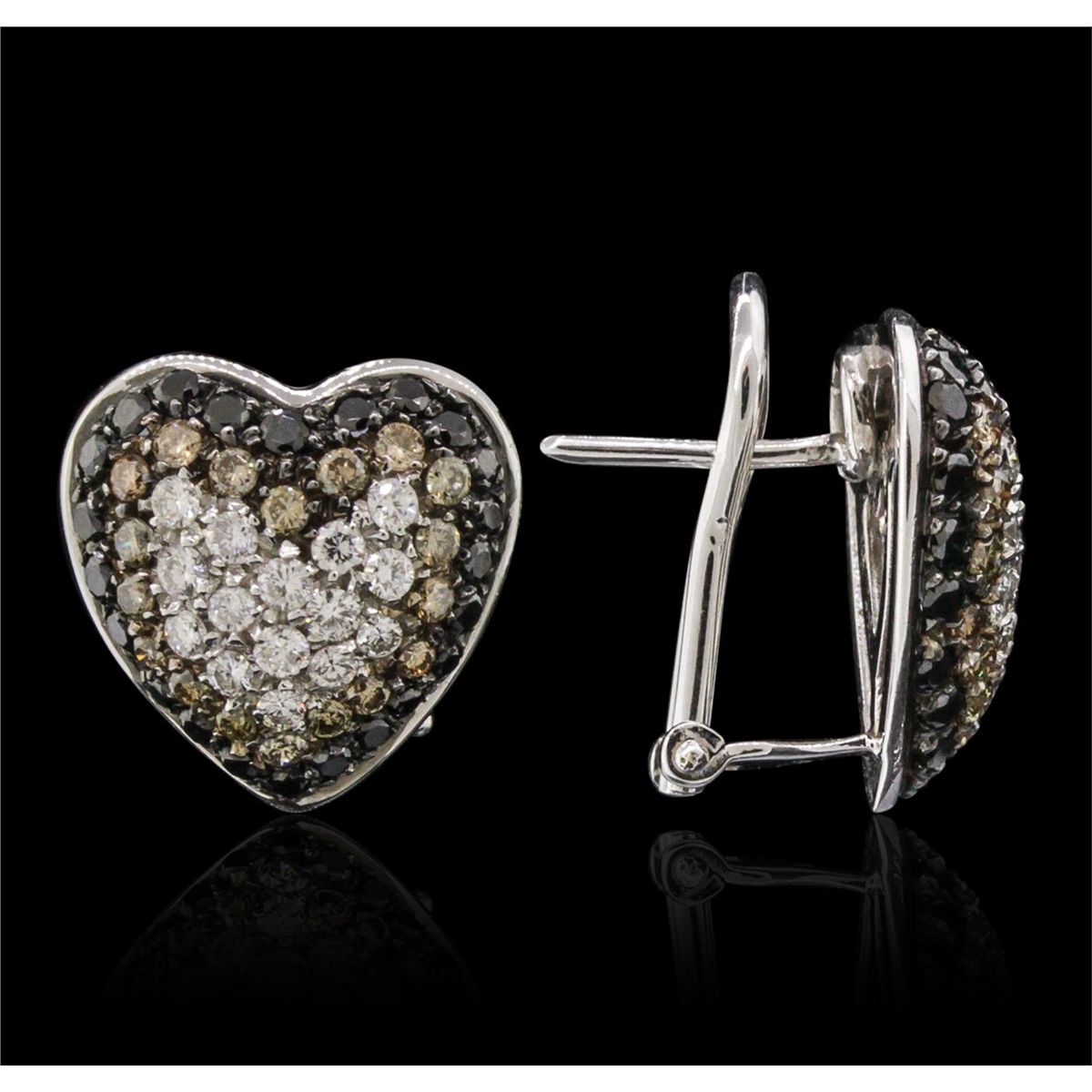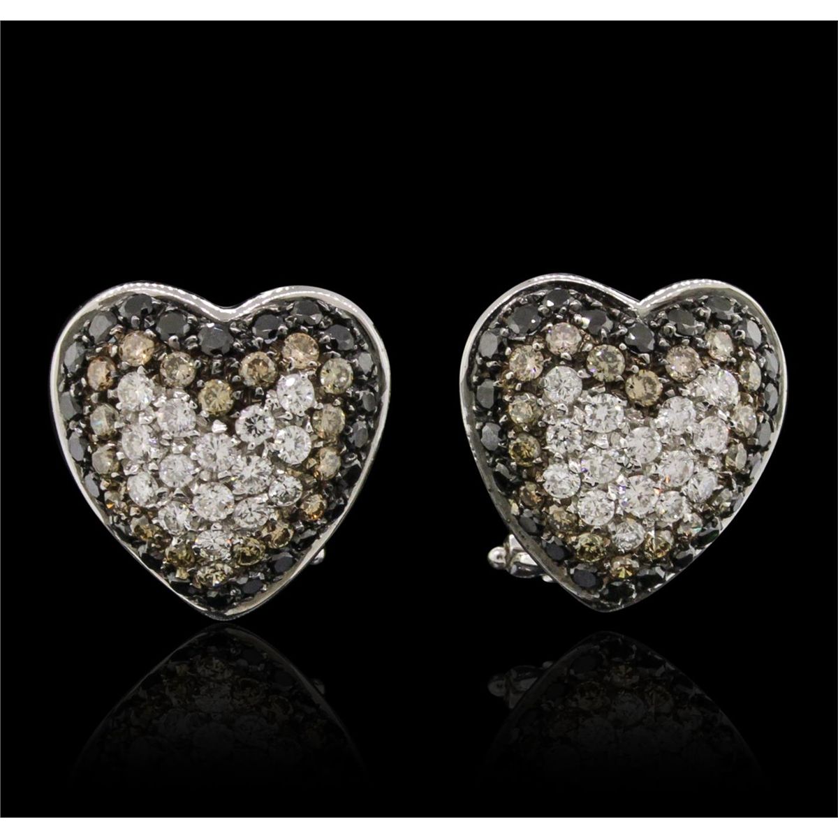 One pair electronically tested 18KT white gold ladies cast & assembled diamond heart earrings with omega backs. Condition is new, good workmanship. Bright and anodized finish. Identified with markings of "750". Containing: Thirty prong set round brilliant cut diamonds, measuring 1.90 - 1.80 x 1.11mm (depth est.) approximate. Total Weight of 30 Stones = 0.79ct. Graded in the setting. Clarity: VVS-2 to VS-1. Color: G - H Thirty-Six prong set round brilliant cut diamonds, measuring 1.90 - 1.80 x 1.11mm (depth est.) approximate. Total Weight of 36 Stones = 0.93ct. Color grade is an average for the group. Graded in the setting. Clarity: VS-1 to VS-2 Forty-Six prong set round brilliant cut diamonds, measuring 1.90 - 1.80 x 1.11mm (depth est.) approximate. Total Weight of 46 Stones = 1.16ct. Indications of multiple laboratory enhancements. The specific gravity of black diamond is 3.120 to 3.165. Diamond tester results are non-reactive. Graded in the setting. Clarity Déclassé‚. Color: Fancy Black; Irradiated. Total Weight of Diamonds 2.88ct. Total Weight of Earrings 9.11 grams. AIG Appraised at $8,610.00.
