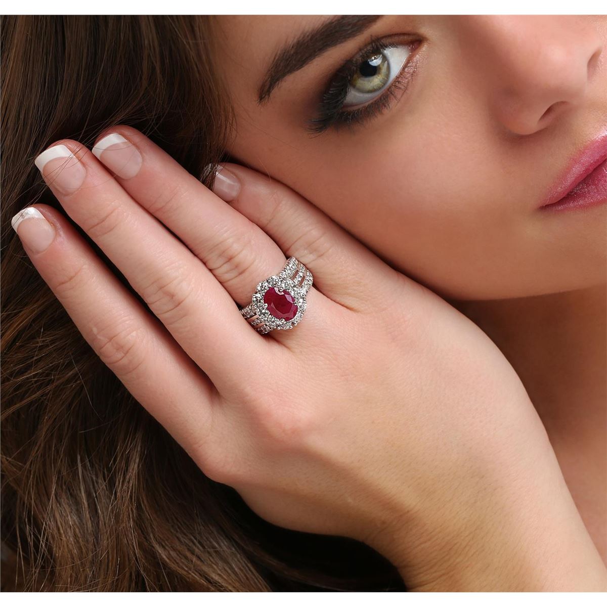 One electronically tested 18KT white gold ladies cast ruby and diamond ring with a bright polish finish.   Identified with markings of "18K". Condition is new, good workmanship. Containing: One prong set oval mixed cut natural ruby, measuring 10.30 x 7.05 x 4.55mm, 6% bulge factor, approximate weight of 2.90ct., clarity is heavily included, type II, dark, very slightly brownish, red color, (GIA R 7/3), cut is good. Transmitting light somewhat diffusely, transparent to translucent. Naturally occurring internal & external characteristics are present. Indications of laboratory high temperature heat treatment, with flux additives. Graded in the setting. Ruby has a low tolerance to rhodium plating, repolishing the surface, & ultrasonic cleaning. Ten prong set round brilliant cut diamonds, measuring 3.40 - 3.30 x 2.01mm (depth est.) approximate total weight of 10 Stones = 1.47ct.  Graded in the setting. Clarity SI-1 to SI-2. Color H - J. Thirty prong and channel set round brilliant cut diamonds, measuring 2.30 - 2.00 x 1.29mm (depth est.) approximate total weight of 30 Stones = 1.19ct.  Graded in the setting. Clarity I-1 to I-2. Color G - I. Total Weight of Colored Stones 2.90ct. Total Weight of Diamonds 2.66ct. Total Weight of Ring 10.57 grams. AIG Appraised at $10,310.00.
