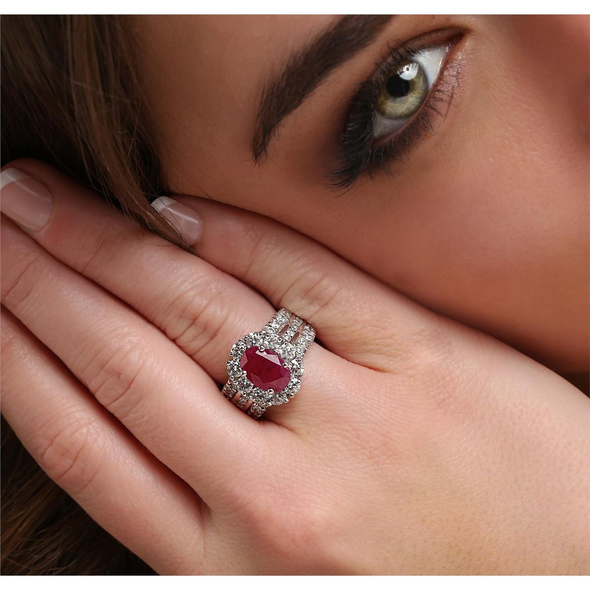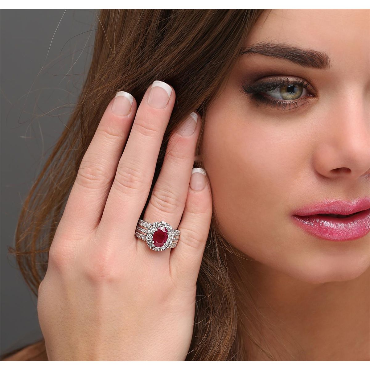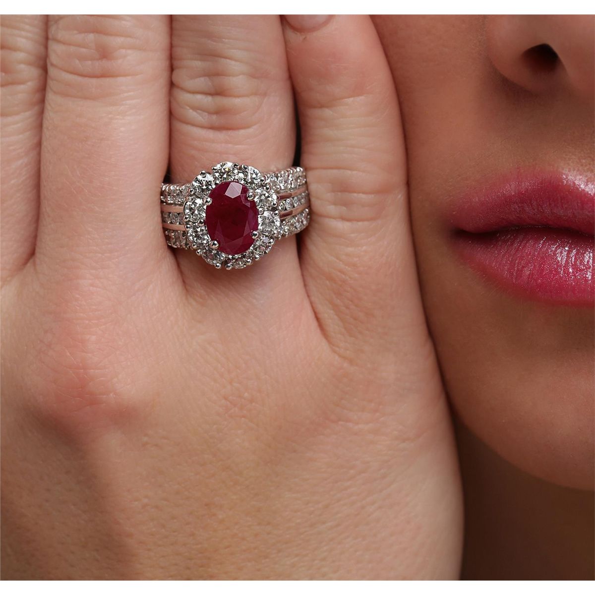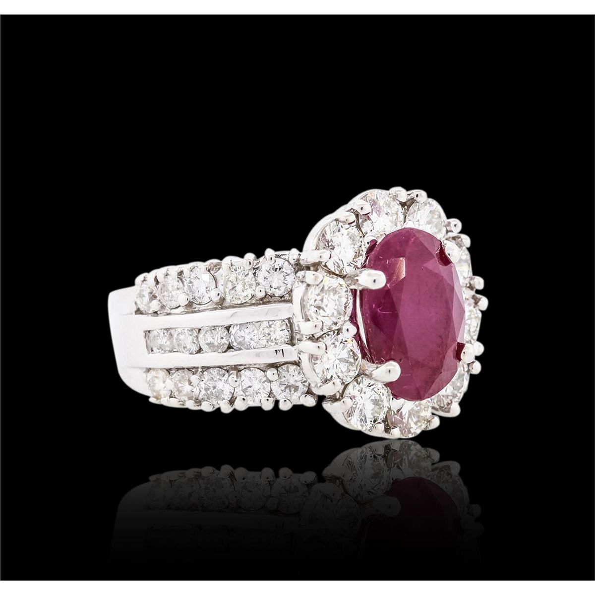 One electronically tested 18KT white gold ladies cast ruby and diamond ring with a bright polish finish.   Identified with markings of "18K". Condition is new, good workmanship. Containing: One prong set oval mixed cut natural ruby, measuring 10.30 x 7.05 x 4.55mm, 6% bulge factor, approximate weight of 2.90ct., clarity is heavily included, type II, dark, very slightly brownish, red color, (GIA R 7/3), cut is good. Transmitting light somewhat diffusely, transparent to translucent. Naturally occurring internal & external characteristics are present. Indications of laboratory high temperature heat treatment, with flux additives. Graded in the setting. Ruby has a low tolerance to rhodium plating, repolishing the surface, & ultrasonic cleaning. Ten prong set round brilliant cut diamonds, measuring 3.40 - 3.30 x 2.01mm (depth est.) approximate total weight of 10 Stones = 1.47ct.  Graded in the setting. Clarity SI-1 to SI-2. Color H - J. Thirty prong and channel set round brilliant cut diamonds, measuring 2.30 - 2.00 x 1.29mm (depth est.) approximate total weight of 30 Stones = 1.19ct.  Graded in the setting. Clarity I-1 to I-2. Color G - I. Total Weight of Colored Stones 2.90ct. Total Weight of Diamonds 2.66ct. Total Weight of Ring 10.57 grams. AIG Appraised at $10,310.00.