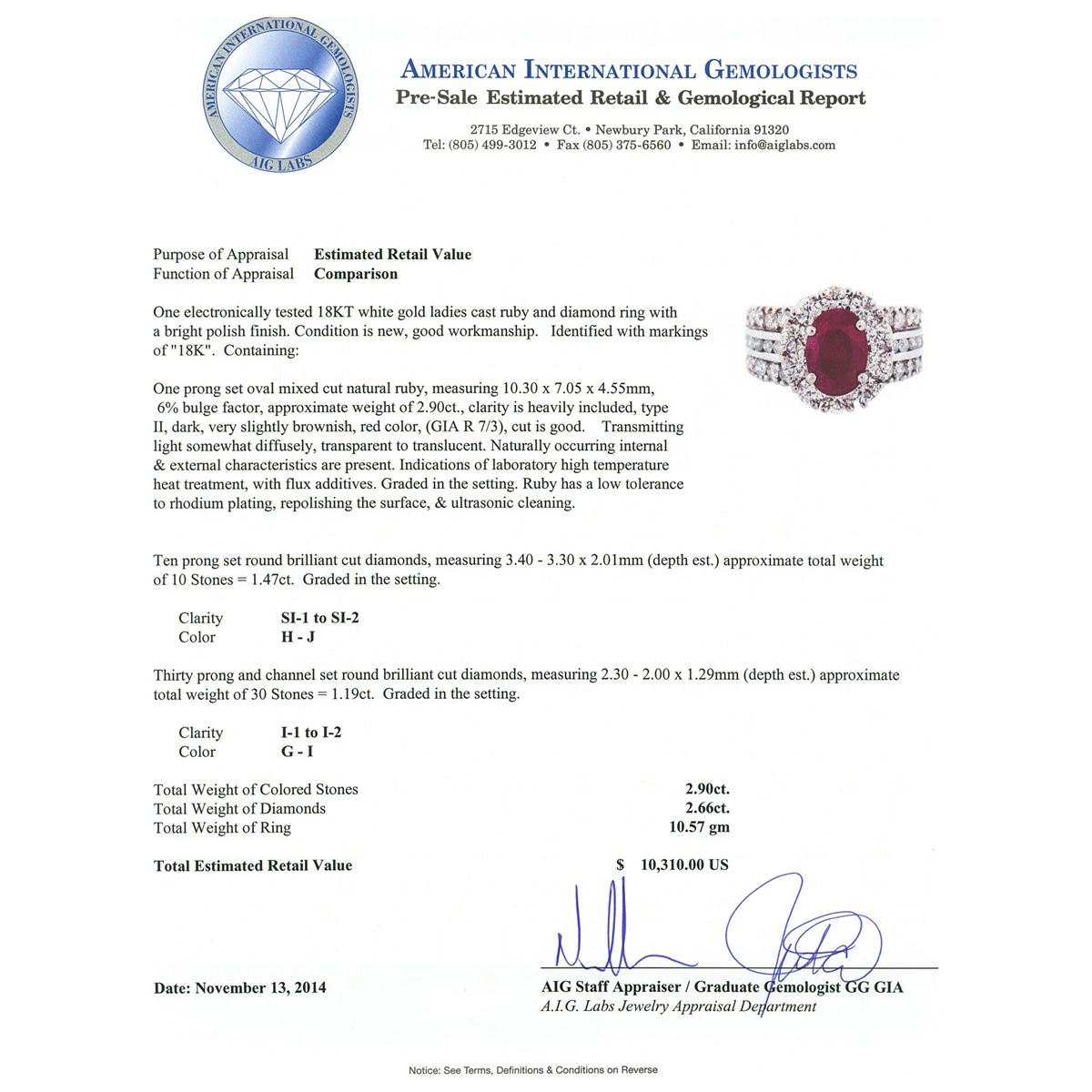 One electronically tested 18KT white gold ladies cast ruby and diamond ring with a bright polish finish. Identified with markings of "18K". Condition is new, good workmanship. Containing: One prong set oval mixed cut natural ruby, measuring 10.30 x 7.05 x 4.55mm, 6% bulge factor, approximate weight of 2.90ct., clarity is heavily included, type II, dark, very slightly brownish, red color, (GIA R 7/3), cut is good. Transmitting light somewhat diffusely, transparent to translucent. Naturally occurring internal & external characteristics are present. Indications of laboratory high temperature heat treatment, with flux additives. Graded in the setting. Ruby has a low tolerance to rhodium plating, repolishing the surface, & ultrasonic cleaning. Ten prong set round brilliant cut diamonds, measuring 3.40 - 3.30 x 2.01mm (depth est.) approximate total weight of 10 Stones = 1.47ct. Graded in the setting. Clarity SI-1 to SI-2. Color H - J. Thirty prong and channel set round brilliant cut diamonds, measuring 2.30 - 2.00 x 1.29mm (depth est.) approximate total weight of 30 Stones = 1.19ct. Graded in the setting. Clarity I-1 to I-2. Color G - I. Total Weight of Colored Stones 2.90ct. Total Weight of Diamonds 2.66ct. Total Weight of Ring 10.57 grams. AIG Appraised at $10,310.00.