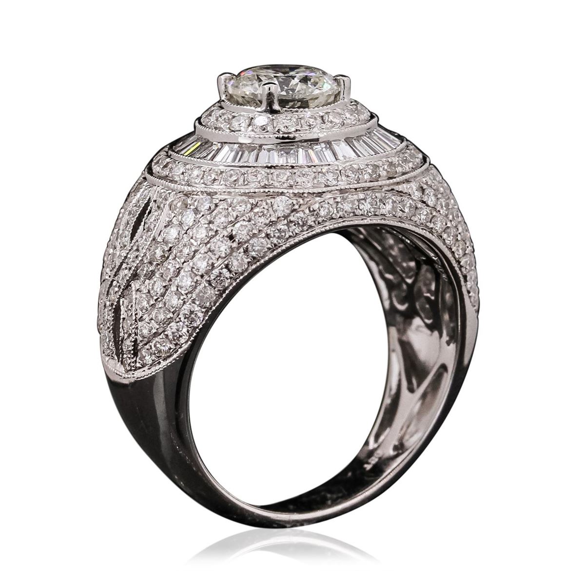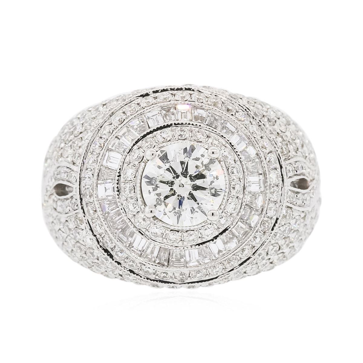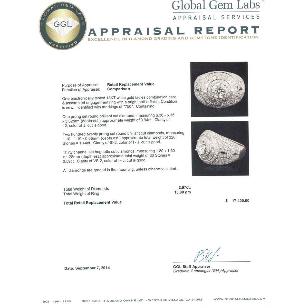 One electronically tested 18KT white gold ladies combination cast & assembled engagement ring with a bright polish finish. Identified with markings of "750". Condition is new. Containing: One prong set round brilliant cut diamond, measuring 6.38 - 6.35 x 3.82mm (depth est.) approximate weight of 0.94ct. Clarity: I-2. Color: J, Cut is Good. Two Hundred Twenty prong set round brilliant cut diamonds, measuring 1.10 - 1.10 x 0.66mm (depth est.) approximate total weight of 220 Stones = 1.44ct. Clarity: SI-2. Color: I - J, Cut is Good. Thirty channel set baguette cut diamonds, measuring 1.80 x 1.50 x 1.28mm (depth est.) approximate total weight of 30 Stones = 0.59ct. Clarity: VS-2. Color: I - J, Cut is Good. All diamonds are graded in the mounting, unless otherwise stated. Total Weight of Diamonds 2.97ct. Total Weight of Ring 10.80 grams. GGL Appraised at $17,400.00.
