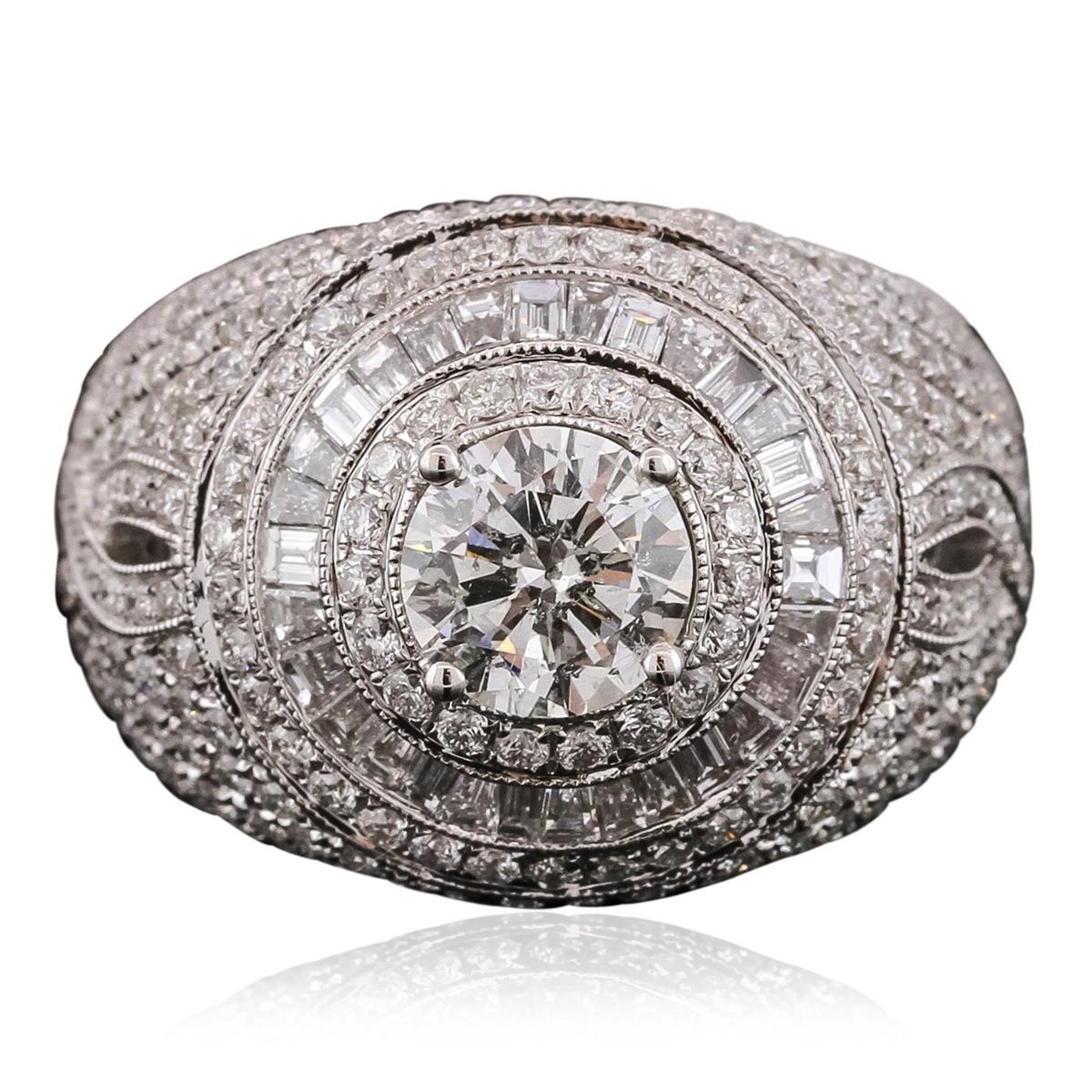 One electronically tested 18KT white gold ladies combination cast & assembled engagement ring with a bright polish finish. Identified with markings of "750". Condition is new. Containing: One prong set round brilliant cut diamond, measuring 6.38 - 6.35 x 3.82mm (depth est.) approximate weight of 0.94ct. Clarity: I-2. Color: J, Cut is Good. Two Hundred Twenty prong set round brilliant cut diamonds, measuring 1.10 - 1.10 x 0.66mm (depth est.) approximate total weight of 220 Stones = 1.44ct. Clarity: SI-2. Color: I - J, Cut is Good. Thirty channel set baguette cut diamonds, measuring 1.80 x 1.50 x 1.28mm (depth est.) approximate total weight of 30 Stones = 0.59ct. Clarity: VS-2. Color: I - J, Cut is Good. All diamonds are graded in the mounting, unless otherwise stated. Total Weight of Diamonds 2.97ct. Total Weight of Ring 10.80 grams. GGL Appraised at $17,400.00.