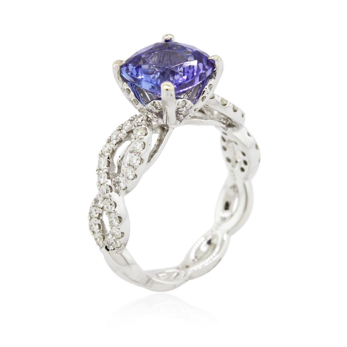 One electronically tested 18KT white gold ladies combination cast & assembled engagement ring with a bright polish finish. Identified with markings of "18K". Condition is new. Containing: One prong set square cushion modified brilliant cut natural tanzanite, measuring 8.32 x 8.39 x 5.43mm, approximate weight of 2.98ct., clarity is eye clean, type I, medium light, moderately strong, bluish violet color, (GIA bV 4/4), cut is good. Sixty-Four prong set round brilliant cut diamonds, measuring 1.50 - 1.50 x 0.90mm (depth est.) approximate total weight of 64 Stones = 0.79ct. Clarity: SI-2 to I-1. Color: I - J, Cut is Good. Colored gemstones are presumed to have been subjected to commonly used enhancement processes. All diamonds and colored gemstones are graded in the mounting, unless otherwise stated. Total Weight of Colored Stones 2.98ct. Total Weight of Diamonds 0.79ct. Total Weight of Ring 5.50 grams. GGL Appraised at $8,380.00.