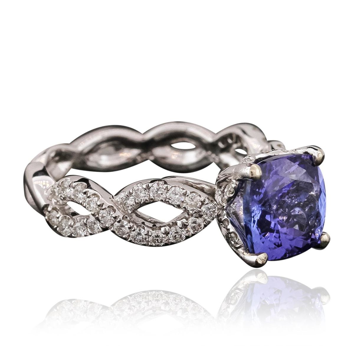 One electronically tested 18KT white gold ladies combination cast & assembled engagement ring with a bright polish finish. Identified with markings of "18K". Condition is new. Containing: One prong set square cushion modified brilliant cut natural tanzanite, measuring 8.32 x 8.39 x 5.43mm, approximate weight of 2.98ct., clarity is eye clean, type I, medium light, moderately strong, bluish violet color, (GIA bV 4/4), cut is good. Sixty-Four prong set round brilliant cut diamonds, measuring 1.50 - 1.50 x 0.90mm (depth est.) approximate total weight of 64 Stones = 0.79ct. Clarity: SI-2 to I-1. Color: I - J, Cut is Good. Colored gemstones are presumed to have been subjected to commonly used enhancement processes. All diamonds and colored gemstones are graded in the mounting, unless otherwise stated. Total Weight of Colored Stones 2.98ct. Total Weight of Diamonds 0.79ct. Total Weight of Ring 5.50 grams. GGL Appraised at $8,380.00.
