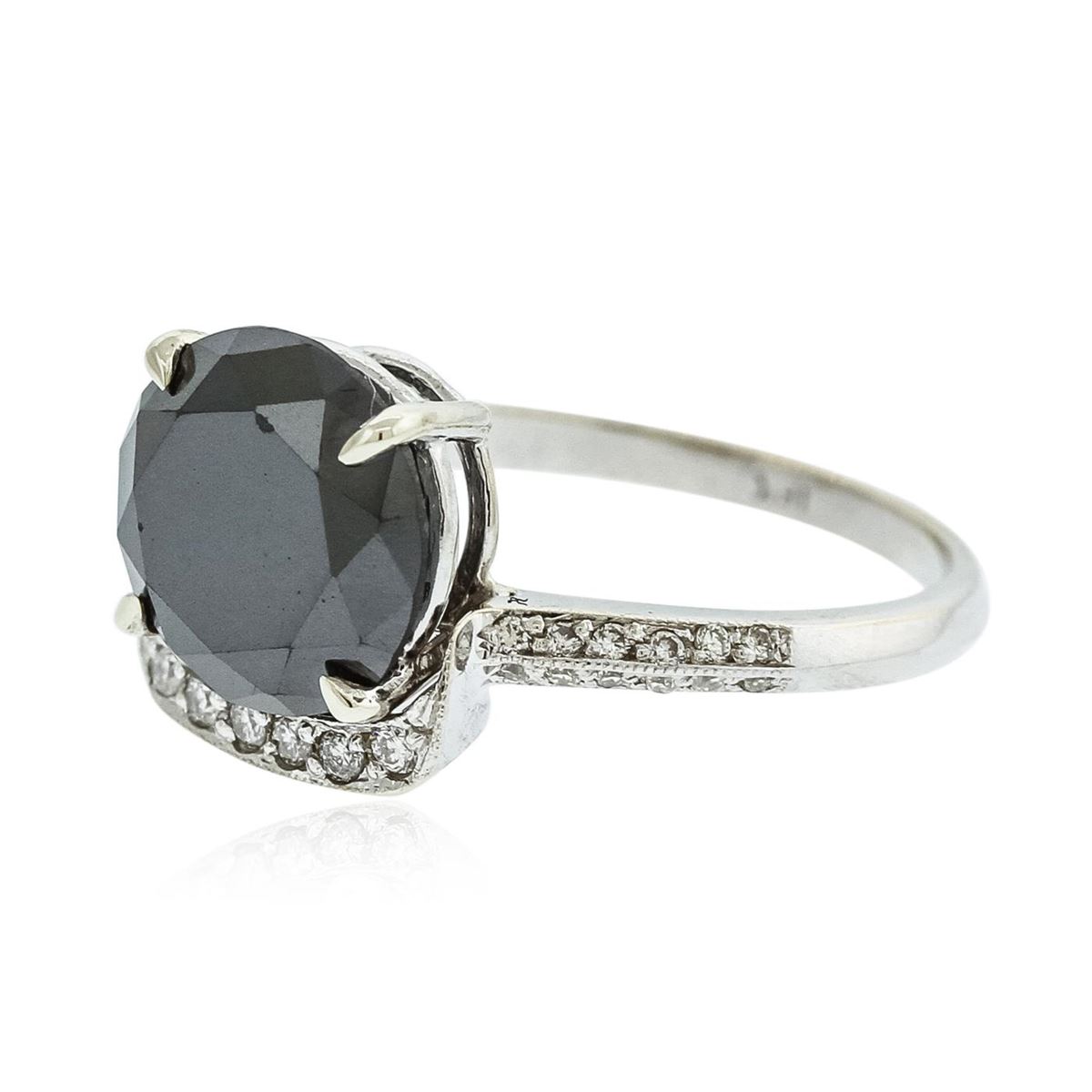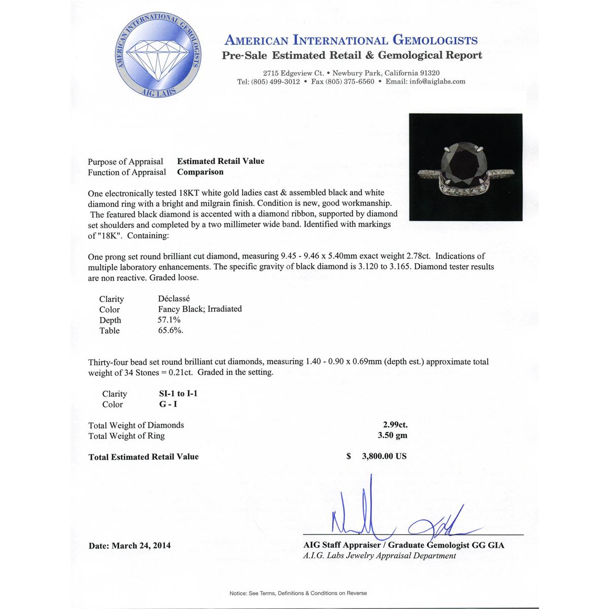 One electronically tested 18KT white gold ladies cast & assembled black and white diamond ring with a bright and milgrain finish. Condition is new, good workmanship. The featured black diamond is accented with a diamond ribbon, supported by diamond set shoulders and completed by a two millimeter wide band. Identified with markings of ""18K"". Containing: One prong set round brilliant cut diamond, measuring 9.45 - 9.46 x 5.40mm exact weight 2.78ct. Indications of multiple laboratory enhancements. The specific gravity of black diamond is 3.120 to 3.165. Diamond tester results are non reactive. Graded loose. Clarity Déclassé‚ Color Fancy Black; Irradiated Depth 57.1% Table 65.6%. Thirty-Four bead set round brilliant cut diamonds, measuring 1.40 - 0.90 x 0.69mm (depth est.) approximate total weight of 34 Stones = 0.21ct. Graded in the setting. Clarity SI-1 to I-1 Color G - I. Total Weight of Diamonds 2.99 ct. Total Weight of Ring 3.50 grams. AIG Appraised at $3,800.00.