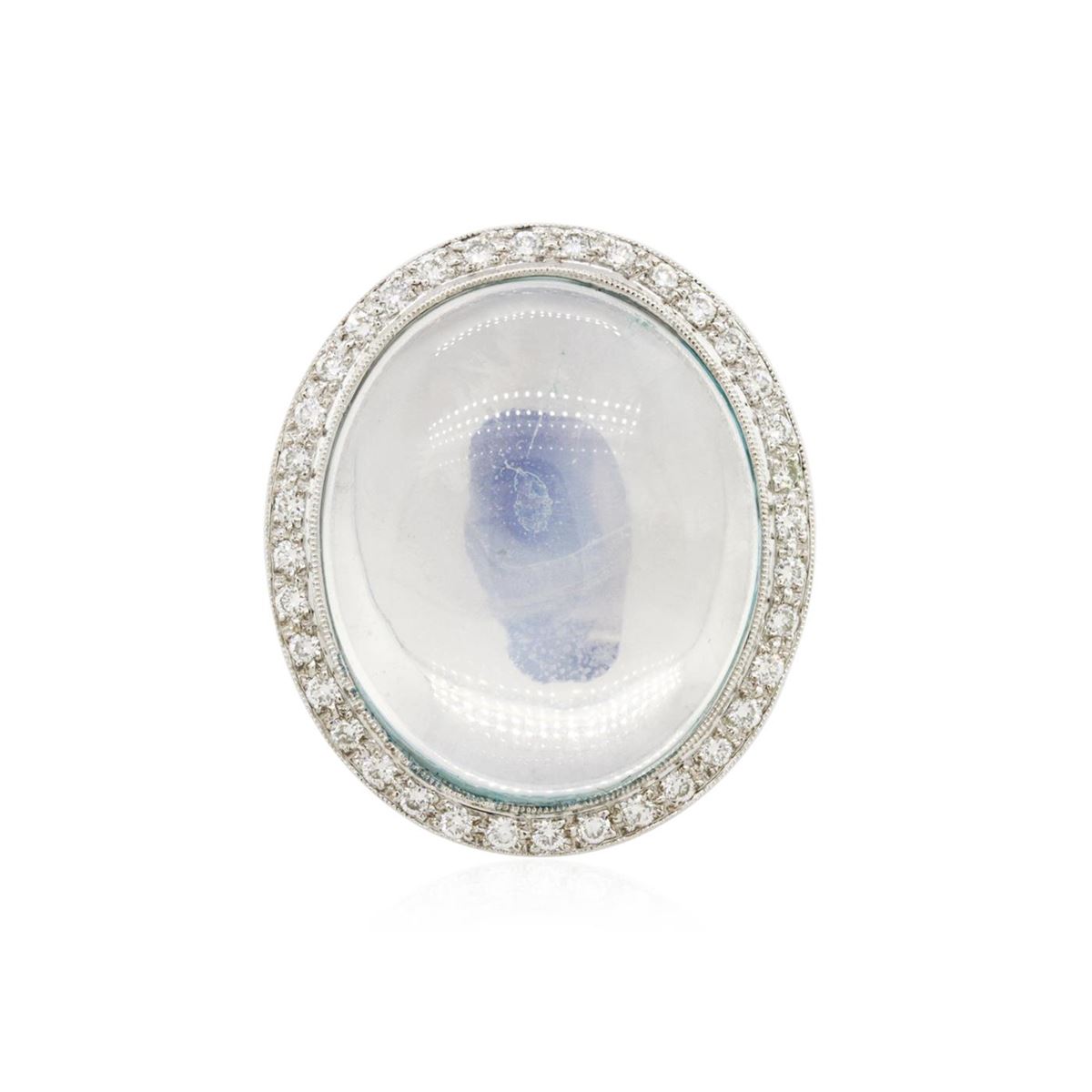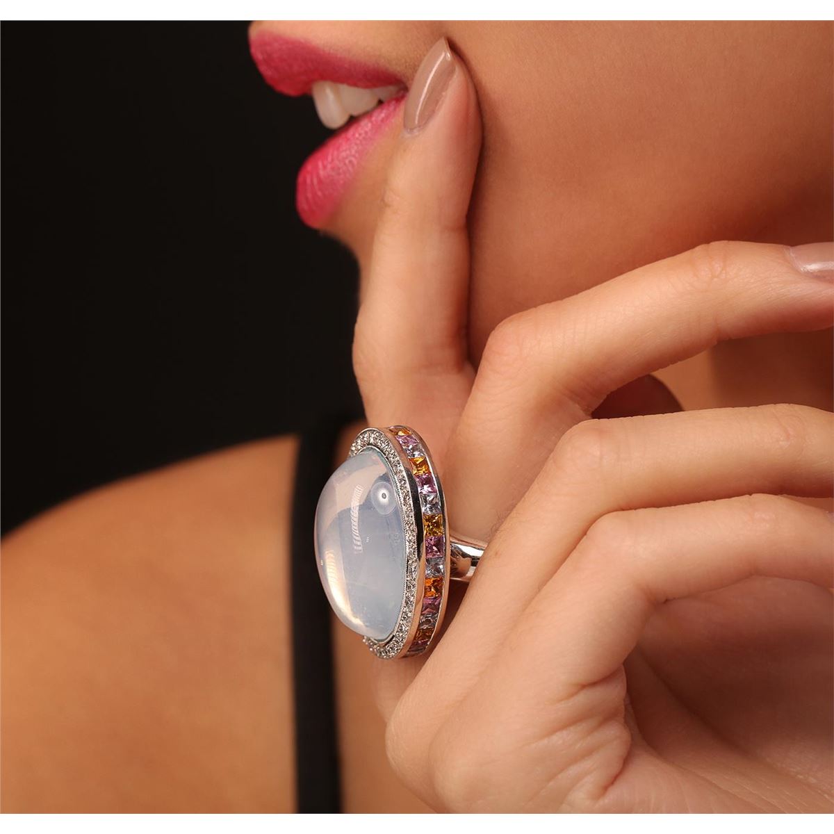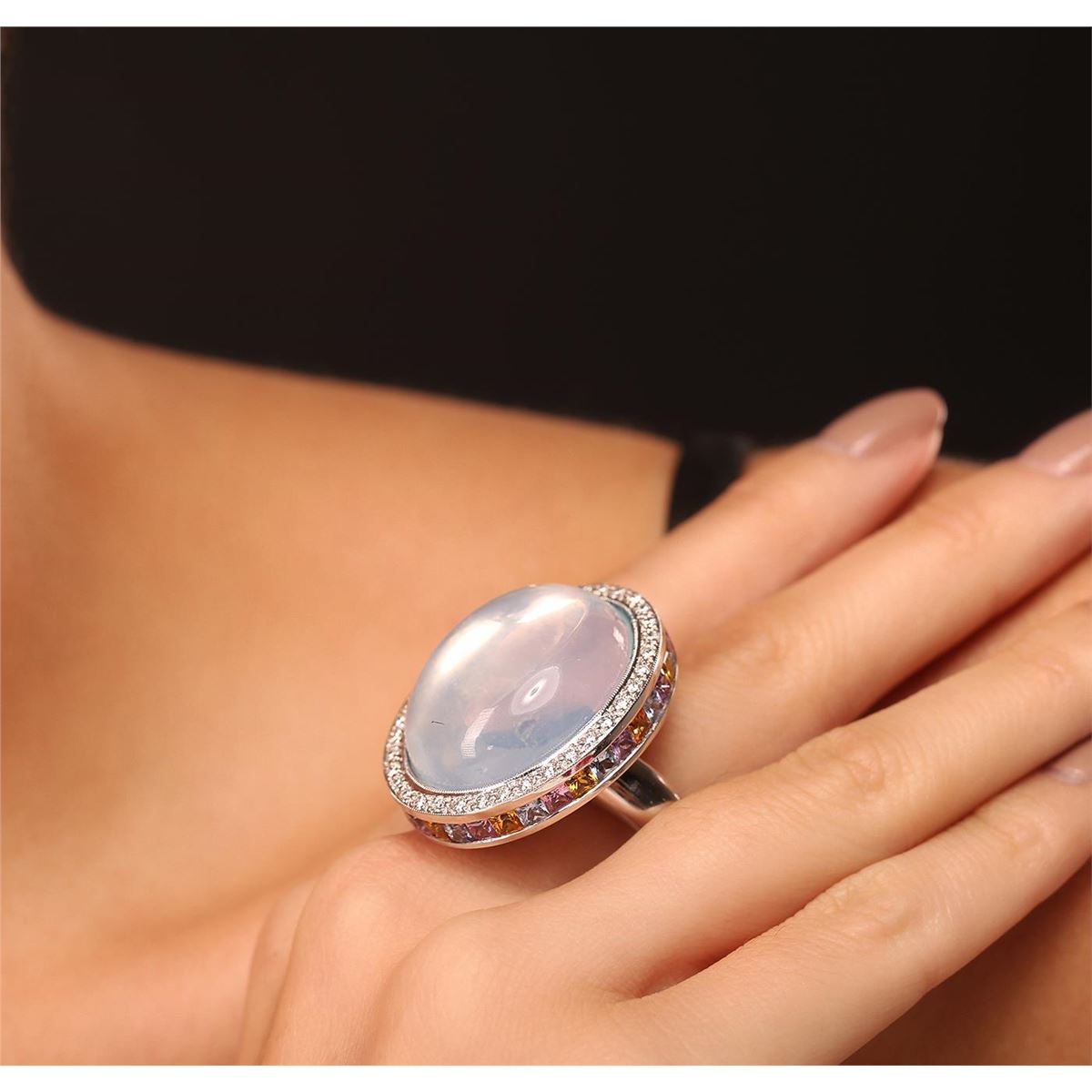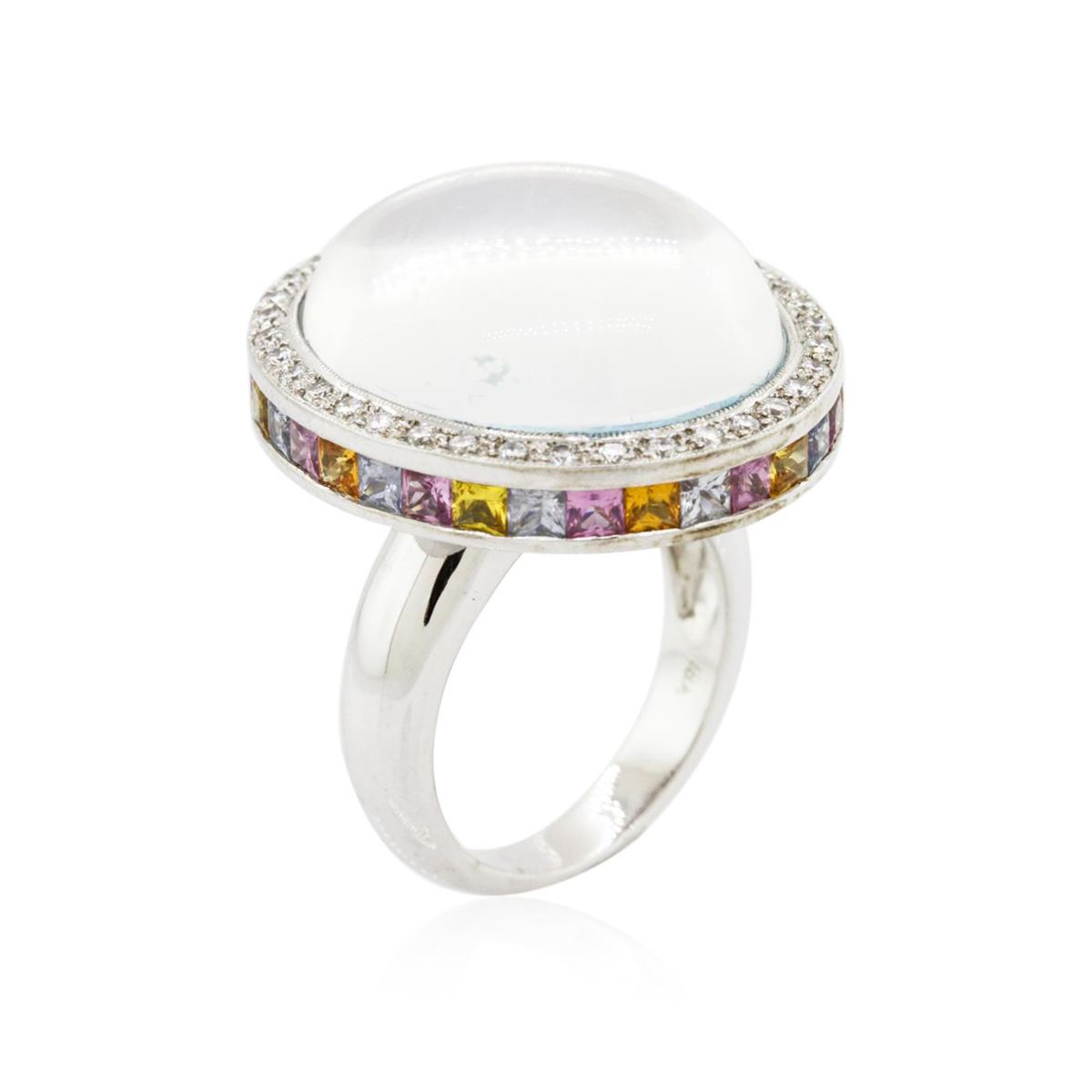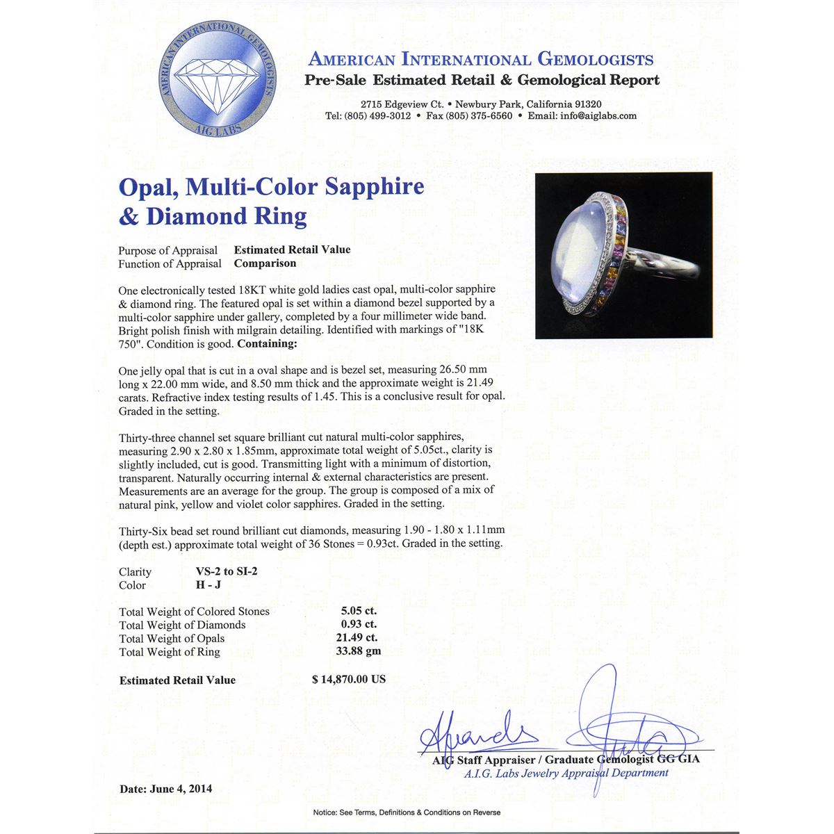 One electronically tested 18KT white gold ladies cast opal, multi-color sapphire & diamond ring. Condition is good. The featured opal is set within a diamond bezel supported by a multi-color sapphire under gallery, completed by a four millimeter wide band. Bright polish finish with milgrain detailing. Identified with markings of "18KT 750". Containing: One jelly opal that is cut in a oval shape and is bezel set, measuring 26.50 mm long x 22.00 mm wide, and 8.50 mm thick and the approximate weight is 21.49 carats. The opal has a , play of color (fire) in a pattern; a dome; a cut; in its brightness and pattern; and is. Refractive index testing results of 1.45. This is a conclusive result for opal. Graded in the setting. Thirty-three channel set square brilliant cut natural multi-color sapphires, measuring 2.90 x 2.80 x 1.85mm, approximate. Total Weight of 5.05ct., clarity is slightly included, cut is good. Transmitting light with a minimum of distortion, transparent. Naturally occurring internal & external characteristics are present. Measurements are an average for the group. The group is composed of a mix of natural pink, yellow and violet color sapphires. Graded in the setting. Thirty-Six bead set round brilliant cut diamonds, measuring 1.90 - 1.80 x 1.11mm (depth est.) approximate. Total Weight of 36 Stones = 0.93ct. Graded in the setting. Clarity: VS-2 to SI-2. Color: H - J. Total Weight of Colored Stones 5.05ct. Total Weight of Diamonds 0.93ct. Total Weight of Opals 21.49ct. Total Weight of Ring 33.88 grams. AIG Appraised at $14,870.00.