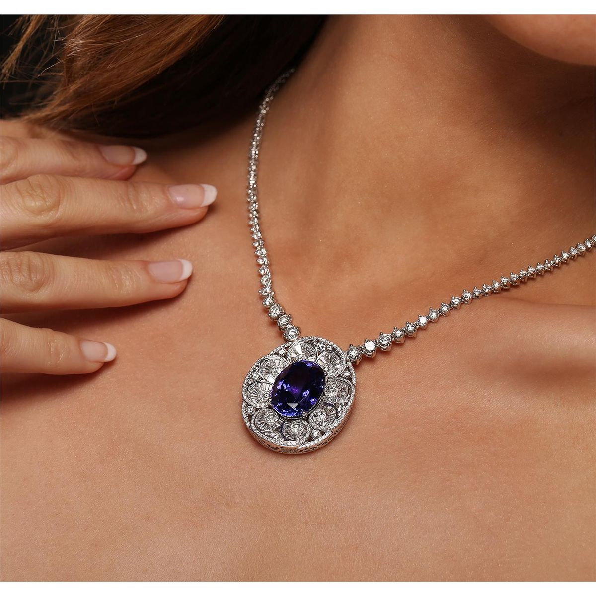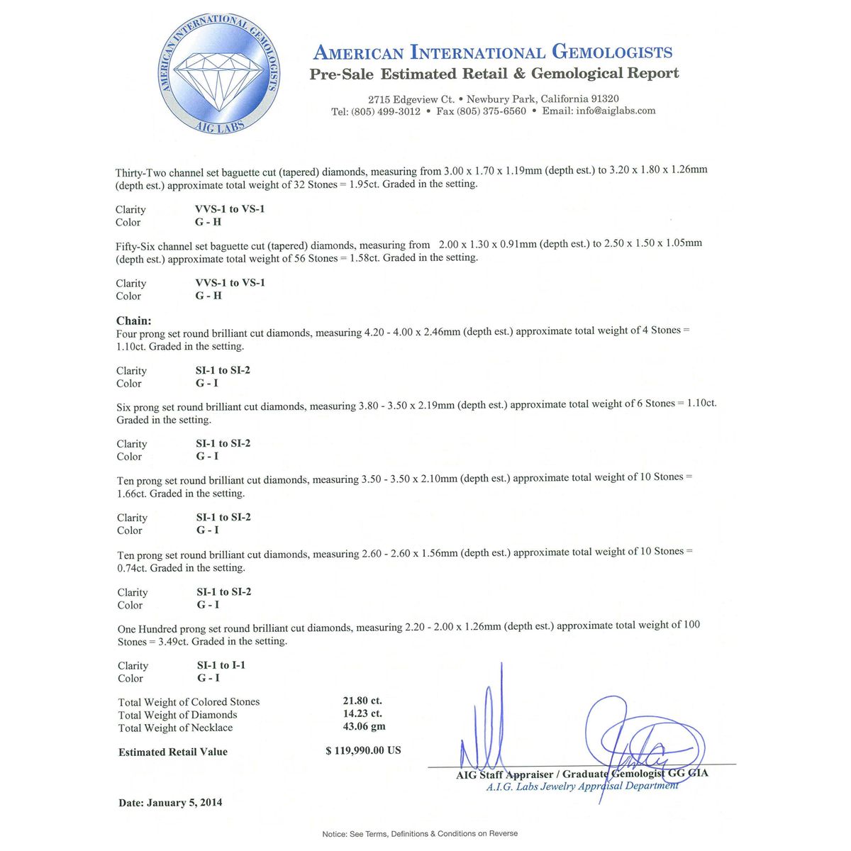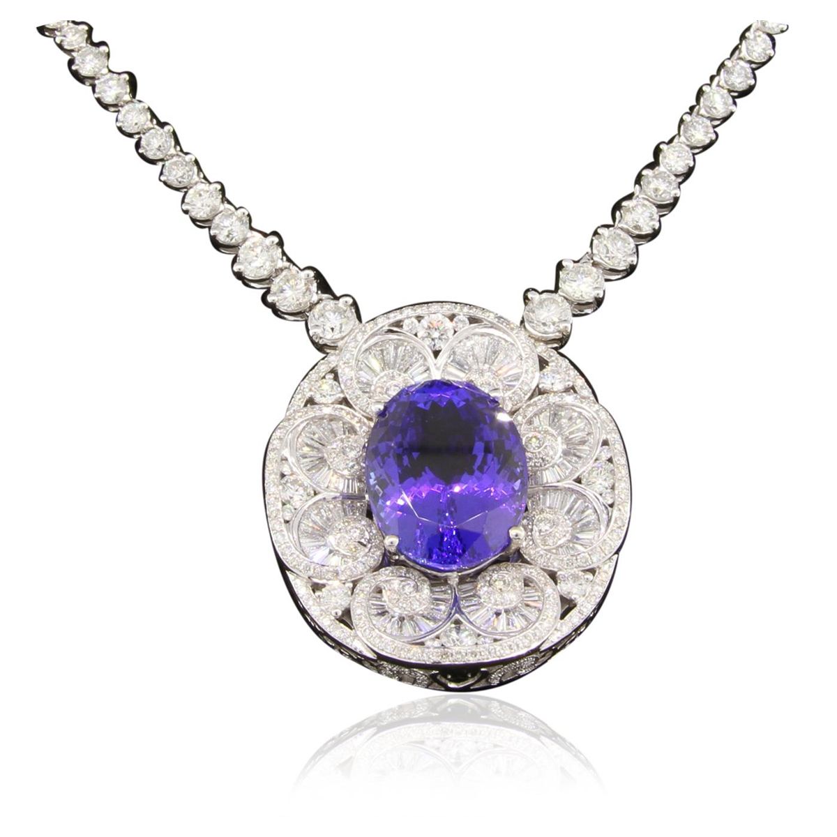 One prong set oval mixed cut natural tanzanite, measuring 18.90 x 14.20 x 10.75mm, 10%. bulge factor, approximate weight of 21.80ct., clarity is eye clean, type I, medium dark, moderately strong, violetish blue color, (GIA vB 6/4), cut is good. Transmitting light with no distortion, transparent. Colored Stone Grading Report attached. Graded in the setting. Tanzanite is a very rare gemstone that is only found in the country of Tanzania. Originally discovered in 1967. Tiffany & Company, named the stone Tanzanite. It is found in the Usumburu Mountains that border the Umba Valley of northern Tanzania. Tanzanite occurs in gray, brown, violet, blue, reddish-purple, & green. The gem is interesting because of its exceptional pleochroism. Rotated in different directions a tanzanite will exhibit multiple changes of color. Tanzanite has a low tolerance to ultrasonic cleaning, and should not be cleaned using this method. Two Hundred Two prong set round brilliant cut diamonds, measuring 1.20 - 1.00 x 0.66mm (depth est.) approximate. Total Weight of 202 Stones = 1.07ct. Graded in the setting. Clarity: SI-1 to I-1 . Color: G - I Eight tension set round brilliant cut diamonds, measuring 1.60 - 1.50 x 0.93mm (depth est.) approximate. Total Weight of 8 Stones = 0.21ct. Clarity: SI-1 to SI-2 . Color: G - H Eight bezel set round brilliant cut diamonds, measuring 1.90 - 1.80 x 1.11mm (depth est.) approximate. Total Weight of 8 Stones = 0.29ct. Clarity: SI-1 to SI-2 . Color: G - H Four prong set round brilliant cut diamonds, measuring 2.90 - 2.80 x 1.71mm (depth est.) approximate. Total Weight of 4 Stones = 0.44ct. Clarity: SI-1 to SI-2 . Color: G - H Four tension set round brilliant cut diamonds, measuring 3.30 - 3.20 x 1.95mm (depth est.) approximate. Total Weight of 4 Stones = 0.60ct. Clarity: SI-1 to SI-2 . Color: G - H Thirty-Two channel set baguette cut (tapered) diamonds, measuring from 3.00 x 1.70 x 1.19mm (depth est.) to 3.20 x 1.80 x 1.26mm (depth est.) approximate. Total Weight of 32 Stones = 1.95ct. Clarity: VVS-1 to VS-1. Color: G - H Fifty-Six channel set baguette cut (tapered) diamonds, measuring from 2.00 x 1.30 x 0.91mm (depth est.) to 2.50 x 1.50 x 1.05mm (depth est.) approximate. Total Weight of 56 Stones = 1.58ct. Clarity: VVS-1 to VS-1. Color: G - H Four prong set round brilliant cut diamonds, measuring 4.20 - 4.00 x 2.46mm (depth est.) approximate. Total Weight of 4 Stones = 1.10ct. Clarity: SI-1 to SI-2 . Color: G - I Six prong set round brilliant cut diamonds, measuring 3.80 - 3.50 x 2.19mm (depth est.) approximate. Total Weight of 6 Stones = 1.10ct. Clarity: SI-1 to SI-2 . Color: G - I Ten prong set round brilliant cut diamonds, measuring 3.50 - 3.50 x 2.10mm (depth est.) approximate. Total Weight of 10 Stones = 1.66ct. Clarity: SI-1 to SI-2 . Color: G - I Ten prong set round brilliant cut diamonds, measuring 2.60 - 2.60 x 1.56mm (depth est.) approximate. Total Weight of 10 Stones = 0.74ct. Clarity: SI-1 to SI-2 . Color: G - I One Hundred prong set round brilliant cut diamonds, measuring 2.20 - 2.00 x 1.26mm (depth est.) approximate. Total Weight of 100 Stones = 3.49ct. Clarity: SI-1 to I-1 . Color: G - I. Total Weight of Colored Stones 21.80ct.. Total Weight of Diamonds 14.23ct. AIG Appraised at $119,990.00.