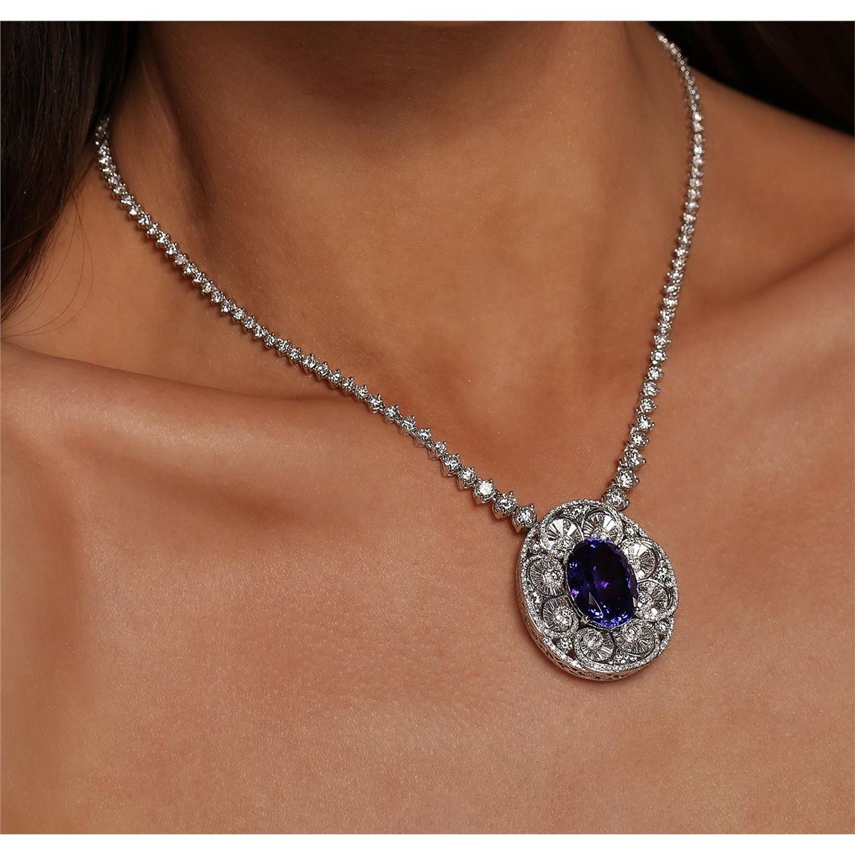 One prong set oval mixed cut natural tanzanite, measuring 18.90 x 14.20 x 10.75mm, 10%. bulge factor, approximate weight of 21.80ct., clarity is eye clean, type I, medium dark, moderately strong, violetish blue color, (GIA vB 6/4), cut is good. Transmitting light with no distortion, transparent. Colored Stone Grading Report attached. Graded in the setting. Tanzanite is a very rare gemstone that is only found in the country of Tanzania. Originally discovered in 1967. Tiffany & Company, named the stone Tanzanite. It is found in the Usumburu Mountains that border the Umba Valley of northern Tanzania. Tanzanite occurs in gray, brown, violet, blue, reddish-purple, & green. The gem is interesting because of its exceptional pleochroism. Rotated in different directions a tanzanite will exhibit multiple changes of color. Tanzanite has a low tolerance to ultrasonic cleaning, and should not be cleaned using this method. Two Hundred Two prong set round brilliant cut diamonds, measuring 1.20 - 1.00 x 0.66mm (depth est.) approximate. Total Weight of 202 Stones = 1.07ct. Graded in the setting. Clarity: SI-1 to I-1 . Color: G - I Eight tension set round brilliant cut diamonds, measuring 1.60 - 1.50 x 0.93mm (depth est.) approximate. Total Weight of 8 Stones = 0.21ct. Clarity: SI-1 to SI-2 . Color: G - H Eight bezel set round brilliant cut diamonds, measuring 1.90 - 1.80 x 1.11mm (depth est.) approximate. Total Weight of 8 Stones = 0.29ct. Clarity: SI-1 to SI-2 . Color: G - H Four prong set round brilliant cut diamonds, measuring 2.90 - 2.80 x 1.71mm (depth est.) approximate. Total Weight of 4 Stones = 0.44ct. Clarity: SI-1 to SI-2 . Color: G - H Four tension set round brilliant cut diamonds, measuring 3.30 - 3.20 x 1.95mm (depth est.) approximate. Total Weight of 4 Stones = 0.60ct. Clarity: SI-1 to SI-2 . Color: G - H Thirty-Two channel set baguette cut (tapered) diamonds, measuring from 3.00 x 1.70 x 1.19mm (depth est.) to 3.20 x 1.80 x 1.26mm (depth est.) approximate. Total Weight of 32 Stones = 1.95ct. Clarity: VVS-1 to VS-1. Color: G - H Fifty-Six channel set baguette cut (tapered) diamonds, measuring from 2.00 x 1.30 x 0.91mm (depth est.) to 2.50 x 1.50 x 1.05mm (depth est.) approximate. Total Weight of 56 Stones = 1.58ct. Clarity: VVS-1 to VS-1. Color: G - H Four prong set round brilliant cut diamonds, measuring 4.20 - 4.00 x 2.46mm (depth est.) approximate. Total Weight of 4 Stones = 1.10ct. Clarity: SI-1 to SI-2 . Color: G - I Six prong set round brilliant cut diamonds, measuring 3.80 - 3.50 x 2.19mm (depth est.) approximate. Total Weight of 6 Stones = 1.10ct. Clarity: SI-1 to SI-2 . Color: G - I Ten prong set round brilliant cut diamonds, measuring 3.50 - 3.50 x 2.10mm (depth est.) approximate. Total Weight of 10 Stones = 1.66ct. Clarity: SI-1 to SI-2 . Color: G - I Ten prong set round brilliant cut diamonds, measuring 2.60 - 2.60 x 1.56mm (depth est.) approximate. Total Weight of 10 Stones = 0.74ct. Clarity: SI-1 to SI-2 . Color: G - I One Hundred prong set round brilliant cut diamonds, measuring 2.20 - 2.00 x 1.26mm (depth est.) approximate. Total Weight of 100 Stones = 3.49ct. Clarity: SI-1 to I-1 . Color: G - I. Total Weight of Colored Stones 21.80ct.. Total Weight of Diamonds 14.23ct. AIG Appraised at $119,990.00.