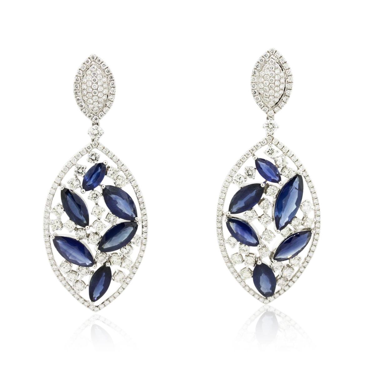 One pair electronically tested 18KT white gold ladies combination cast & assembled sapphire and diamond earrings with Omega clip backs with posts with a bright polish finish. Measurements: 2.50" in length. Trademark is AKMS. Identified with markings of "18K". Condition is new. Containing: Ten prong set marquise modified brilliant cut natural blue sapphires, measuring 12.00 x 6.00 x 3.90mm, approximate total weight of 21.30ct., clarity is eye clean, type II, medium, moderately strong, blue color, (GIA B 5/4), cut is good. Two prong set marquise modified brilliant cut natural blue sapphires, measuring 7.50 x 3.80 x 2.47mm, approximate total weight of 1.08ct., clarity is eye clean, type II, medium, moderately strong, blue color, (GIA B 5/4), cut is good. Fifty prong set round brilliant cut diamonds, measuring 3.50 - 3.00 x 1.95mm (depth est.) approximate total weight of 50 Stones = 5.15ct. Clarity: VS-2 to SI-1. Color: I - J, Cut is Very Good. One Hundred Eighty prong set round brilliant cut diamonds, measuring 1.40 - 1.30 x 0.81mm (depth est.) approximate total weight of 180 Stones = 1.62ct. Clarity: SI-1. Color: H - I, Cut is Very Good. Colored gemstones are presumed to have been subjected to commonly used enhancement processes. All diamonds and colored gemstones are graded in the mounting, unless otherwise stated. Total Weight of Colored Stones 22.38ct. Total Weight of Diamonds 6.77ct. Total Weight of Earrings 28.60 grams. GGL Appraised at $23,870.00.