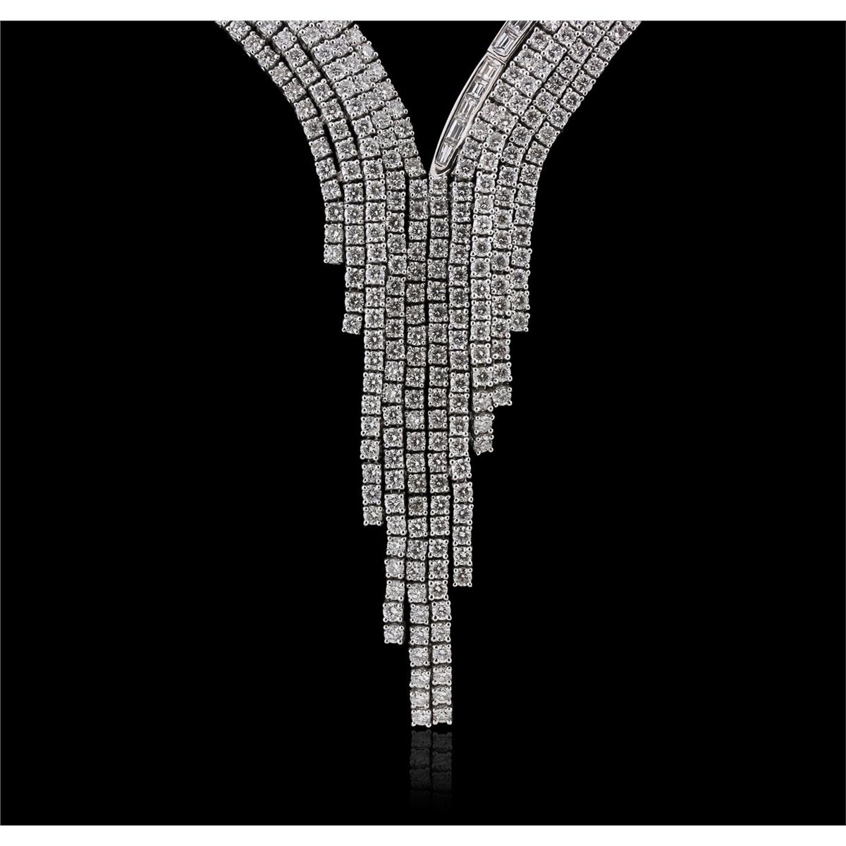 One electronically tested 18KT White Gold ladies cast & assembled diamond necklace. Twenty inch wearable length necklace features a rigid chevron of cascading diamond ribbons supported by a flexible diamond ribbon, terminating in a concealed clasp with safety. Bright polish finish. Trademark is AKMS. Identified with markings of "18K". Condition is new, good workmanship. Containing: Five Hundred Seventy-Nine prong set round brilliant cut diamonds, measuring 2.20 - 2.05 x 1.28mm (depth est.) approximate total weight of 579 Stones = 20.87ct. Graded in the setting. Clarity: VS-1 to SI-1. Color: G - I. Thirty-Two channel set baguette cut diamonds, measuring from 2.50 x 1.80 x 1.26mm (depth est.) to 3.00 x 2.00 x 1.40mm (depth est.) approximate total weight of 32 Stones = 1.74ct. Graded in the setting. Clarity: VVS-2 to VS-2. Color: G - I. Total Weight of Diamonds 22.61ct. Total Weight of Necklace 63.96 grams. AIG Appraised at $88,765.00.