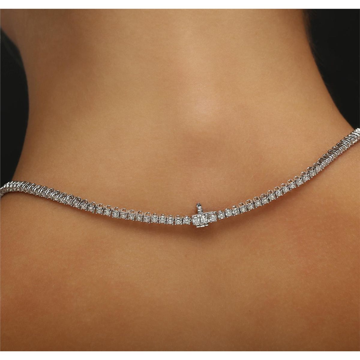 One electronically tested 18KT White Gold ladies cast & assembled diamond necklace. Twenty inch wearable length necklace features a rigid chevron of cascading diamond ribbons supported by a flexible diamond ribbon, terminating in a concealed clasp with safety. Bright polish finish. Trademark is AKMS. Identified with markings of "18K". Condition is new, good workmanship. Containing: Five Hundred Seventy-Nine prong set round brilliant cut diamonds, measuring 2.20 - 2.05 x 1.28mm (depth est.) approximate total weight of 579 Stones = 20.87ct. Graded in the setting. Clarity: VS-1 to SI-1. Color: G - I. Thirty-Two channel set baguette cut diamonds, measuring from 2.50 x 1.80 x 1.26mm (depth est.) to 3.00 x 2.00 x 1.40mm (depth est.) approximate total weight of 32 Stones = 1.74ct. Graded in the setting. Clarity: VVS-2 to VS-2. Color: G - I. Total Weight of Diamonds 22.61ct. Total Weight of Necklace 63.96 grams. AIG Appraised at $88,765.00.