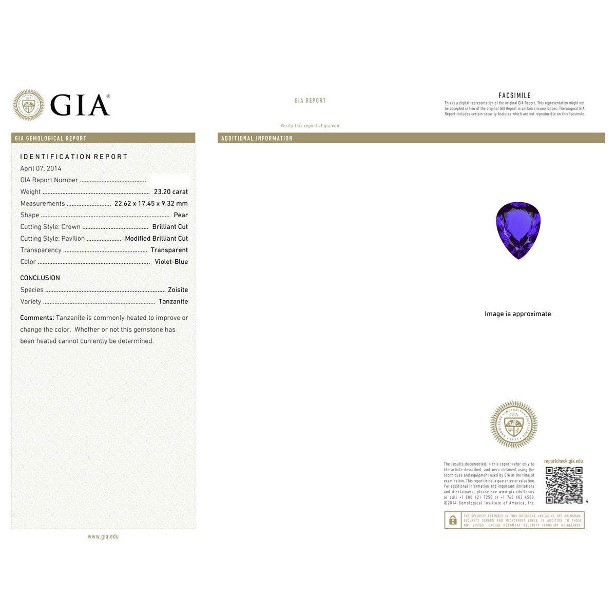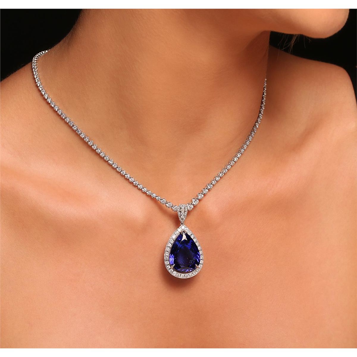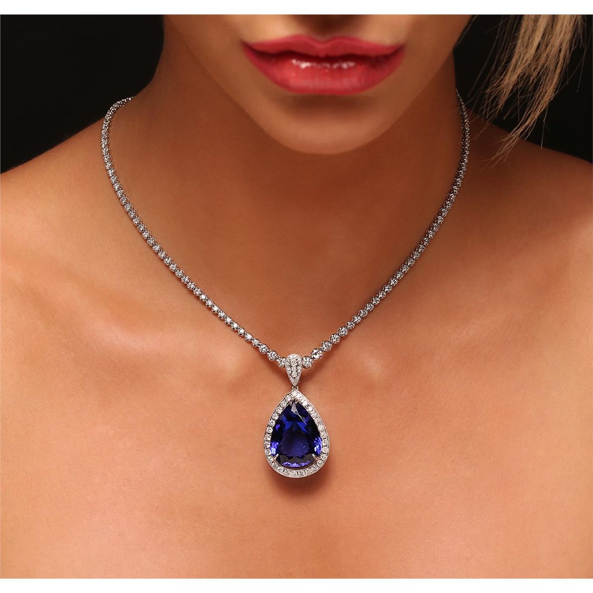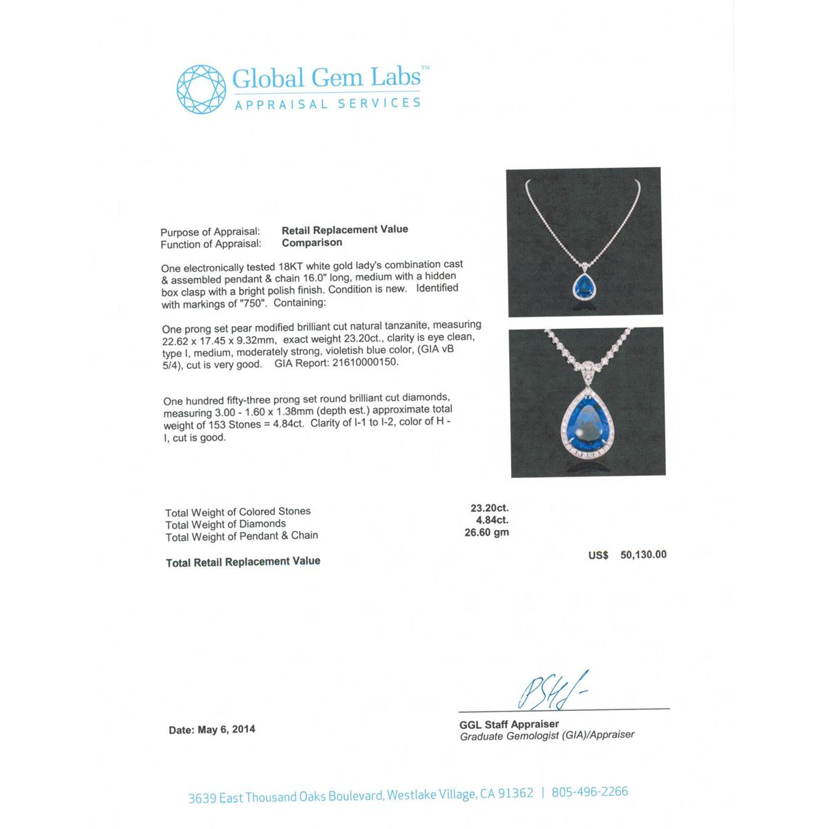 One electronically tested 18KT white gold Ladies combination cast & assembled pendant & chain 16.0 inch long, medium with a hidden box clasp with a bright polish finish. Condition is new. Identified with markings of "750". Containing: One prong set pear modified brilliant cut natural tanzanite, measuring 22.62 x 17.45 x 9.32mm, exact weight 23.20ct., clarity is eye clean, type I, medium, moderately strong, violetish blue color, (GIA vB 5/4), cut is very good. GIA Report: 21610000150. One Hundred Fifty-Three prong set round brilliant cut diamonds, measuring 3.00 - 1.60 x 1.38mm (depth est.) approximate. Total Weight of 153 Stones = 4.84ct. Clarity: I-1 to I-2. Color: H - I, Cut is Good. Total Weight of Colored Stones 23.20ct. Total Weight of Diamonds 4.84ct. Total Weight of Pendant & Chain 26.60 grams. GGL Appraised at $50,130.00.
