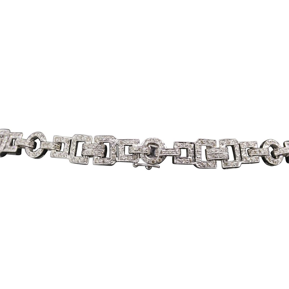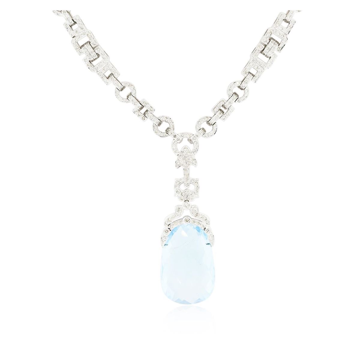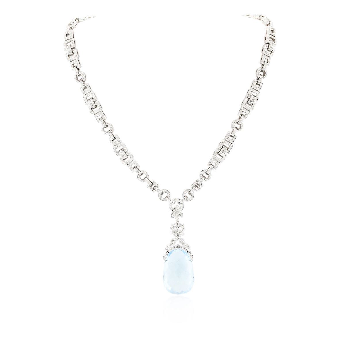 One electronically tested 18KT white gold Ladies combination cast & assembled necklace with a hidden box clasp with a bright polish finish. Condition is new. Measurements: 15" in length. Identified with markings of "750". Containing: One fantasy cut cut natural blue topaz, measuring 28.00 x 18.00 x 10.60mm, approximate weight of 24.00ct., clarity is eye clean, type I, light, very slightly grayish, blue color, (GIA B 3/3), cut is very good. Colored gemstones are presumed to have been subjected to commonly used color/clarity enhancement processes. Eight bezel set round brilliant cut diamonds, measuring 2.00 - 2.00 x 1.20mm (depth est.) approximate. Total Weight of 8 Stones = 0.23ct. Clarity: SI-2. Color: K, Cut is Good. Seven Hundred Fifty-Four prong set round brilliant cut diamonds, measuring 1.50 - 1.30 x 0.84mm (depth est.) approximate. Total Weight of 754 Stones = 7.54ct. Clarity: SI-2 to I-2. Color: J - L, Cut is Good. Total Weight of Colored Stones 24.00ct. Total Weight of Diamonds 7.77ct. Total Weight of Necklace 63.80 grams. GGL Appraised at $45,610.00.