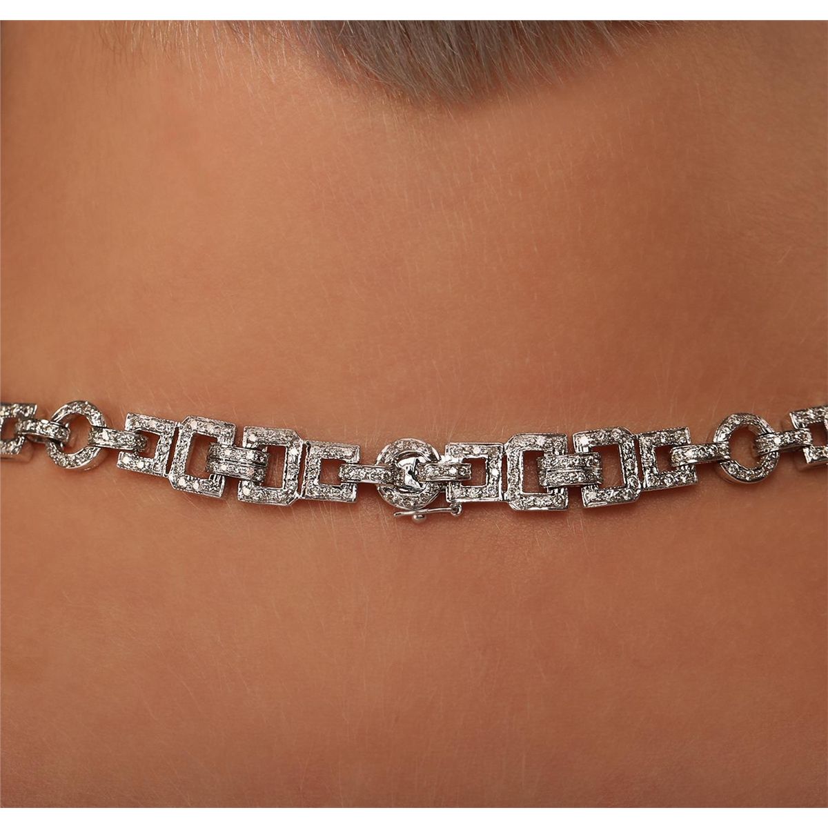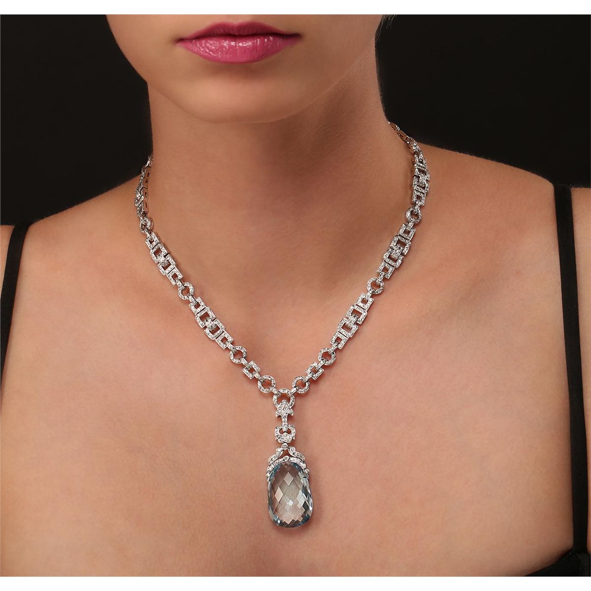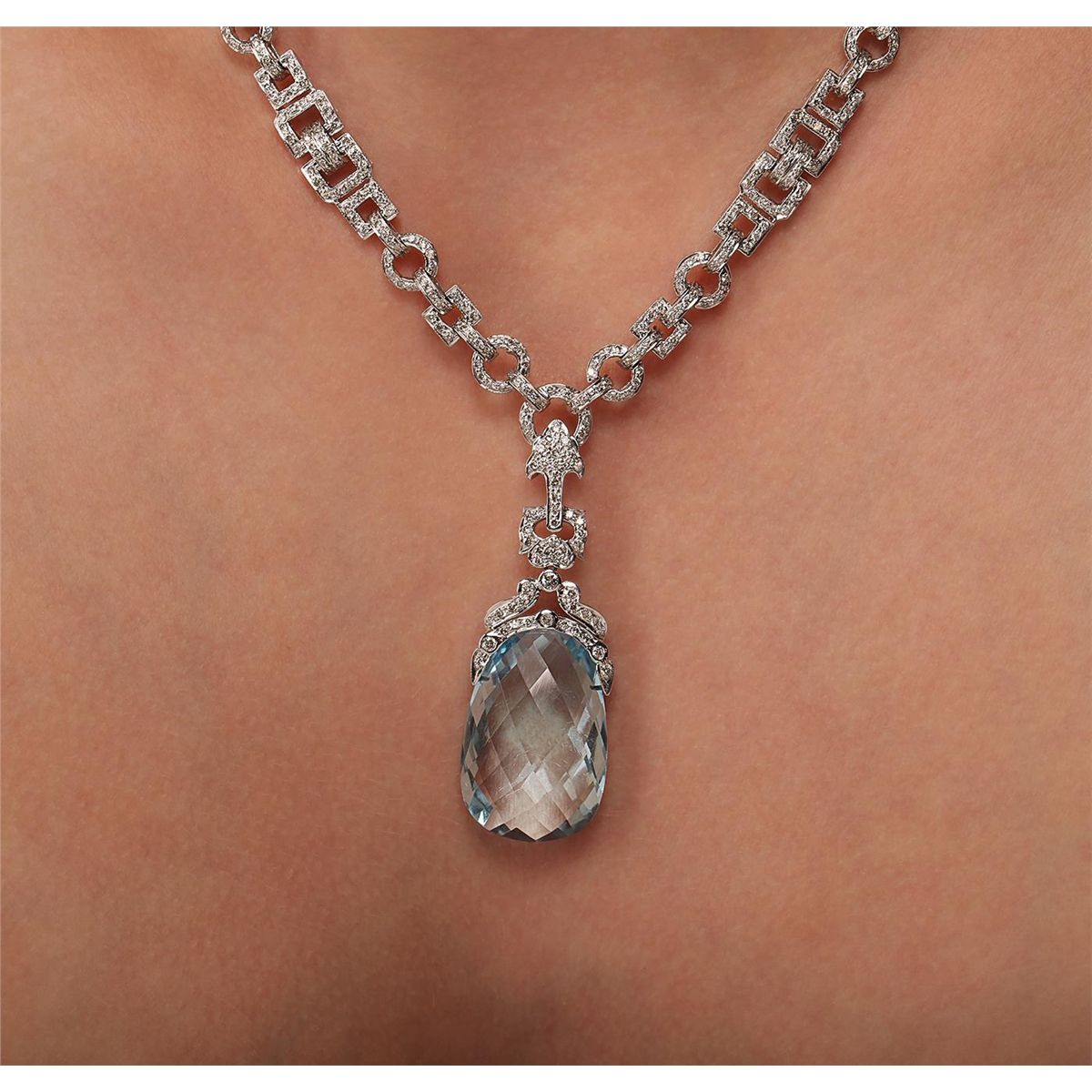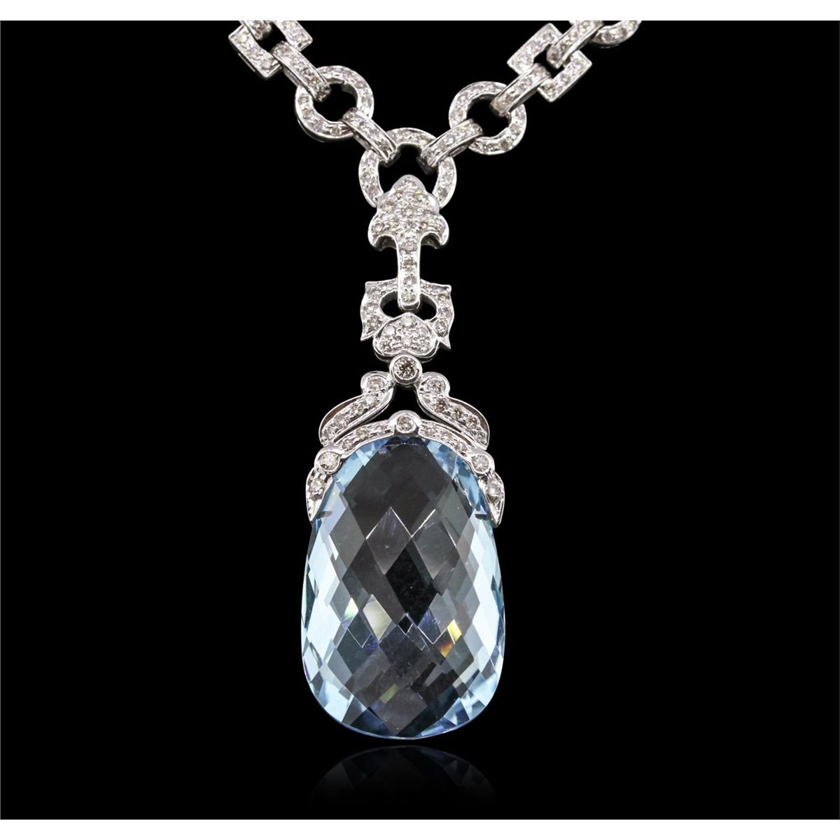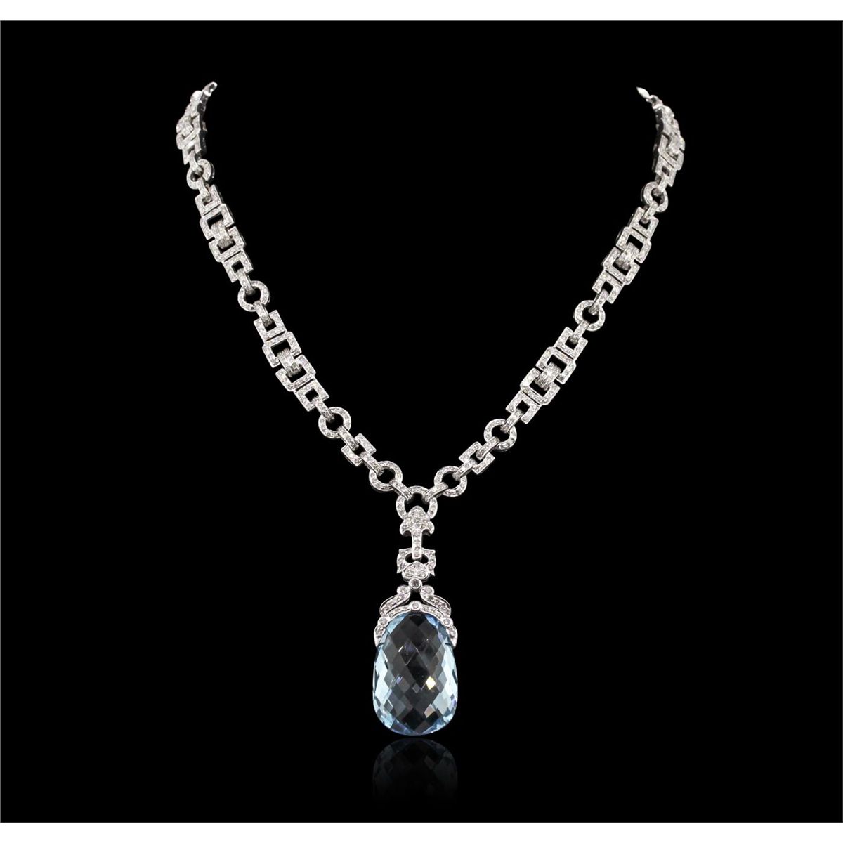 One electronically tested 18KT white gold Ladies combination cast & assembled necklace with a hidden box clasp with a bright polish finish. Condition is new. Measurements: 15" in length. Identified with markings of "750". Containing: One fantasy cut cut natural blue topaz, measuring 28.00 x 18.00 x 10.60mm, approximate weight of 24.00ct., clarity is eye clean, type I, light, very slightly grayish, blue color, (GIA B 3/3), cut is very good. Colored gemstones are presumed to have been subjected to commonly used color/clarity enhancement processes. Eight bezel set round brilliant cut diamonds, measuring 2.00 - 2.00 x 1.20mm (depth est.) approximate. Total Weight of 8 Stones = 0.23ct. Clarity: SI-2. Color: K, Cut is Good. Seven Hundred Fifty-Four prong set round brilliant cut diamonds, measuring 1.50 - 1.30 x 0.84mm (depth est.) approximate. Total Weight of 754 Stones = 7.54ct. Clarity: SI-2 to I-2. Color: J - L, Cut is Good. Total Weight of Colored Stones 24.00ct. Total Weight of Diamonds 7.77ct. Total Weight of Necklace 63.80 grams. GGL Appraised at $45,610.00.