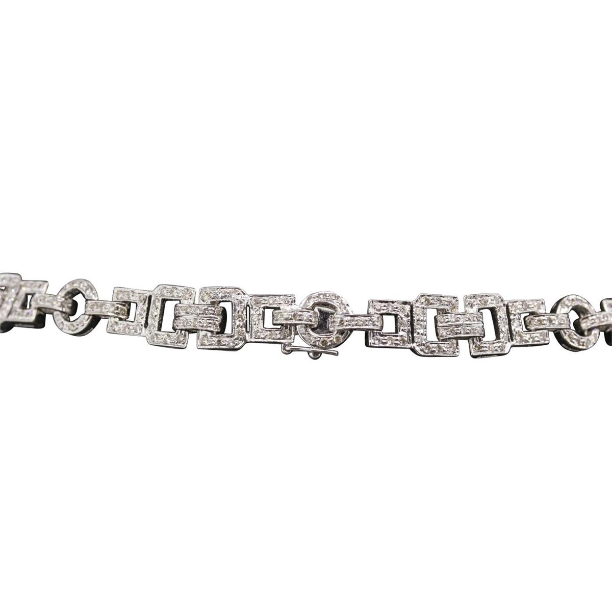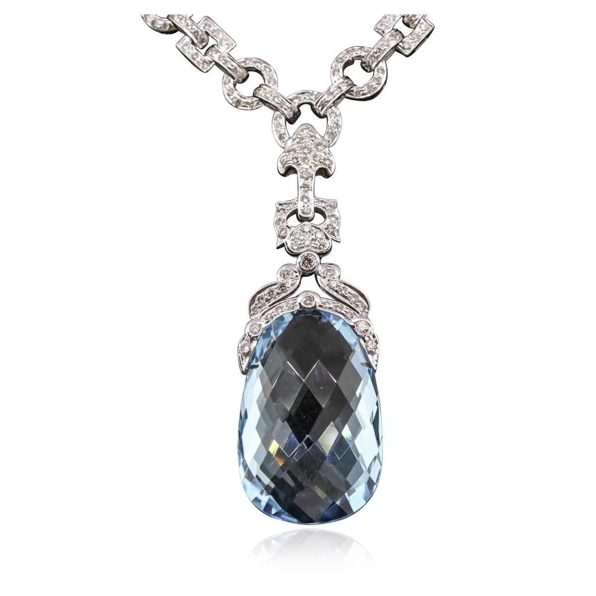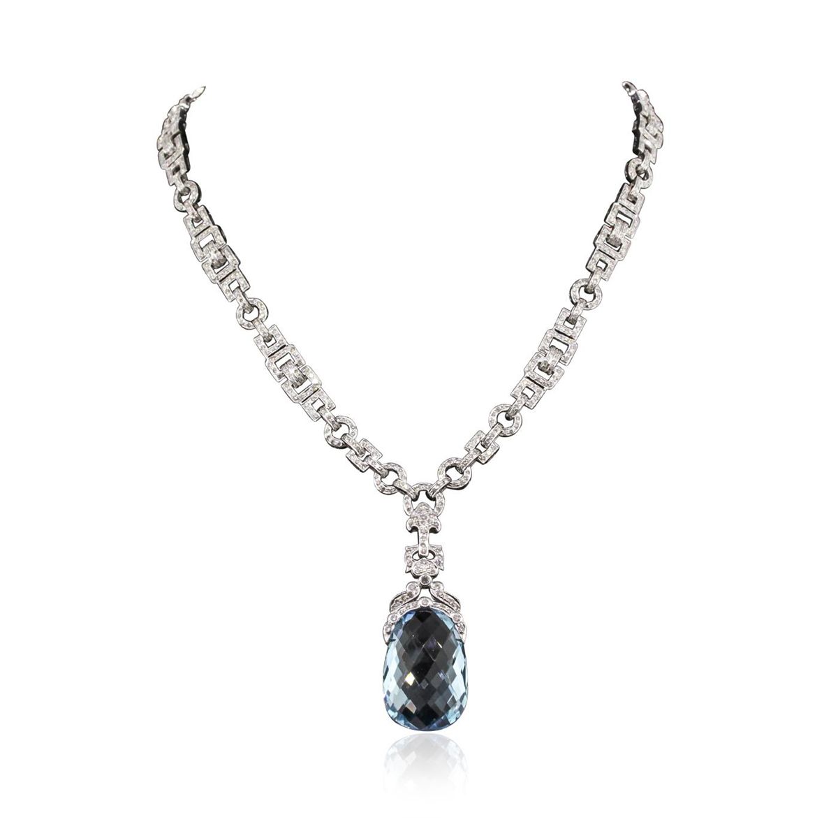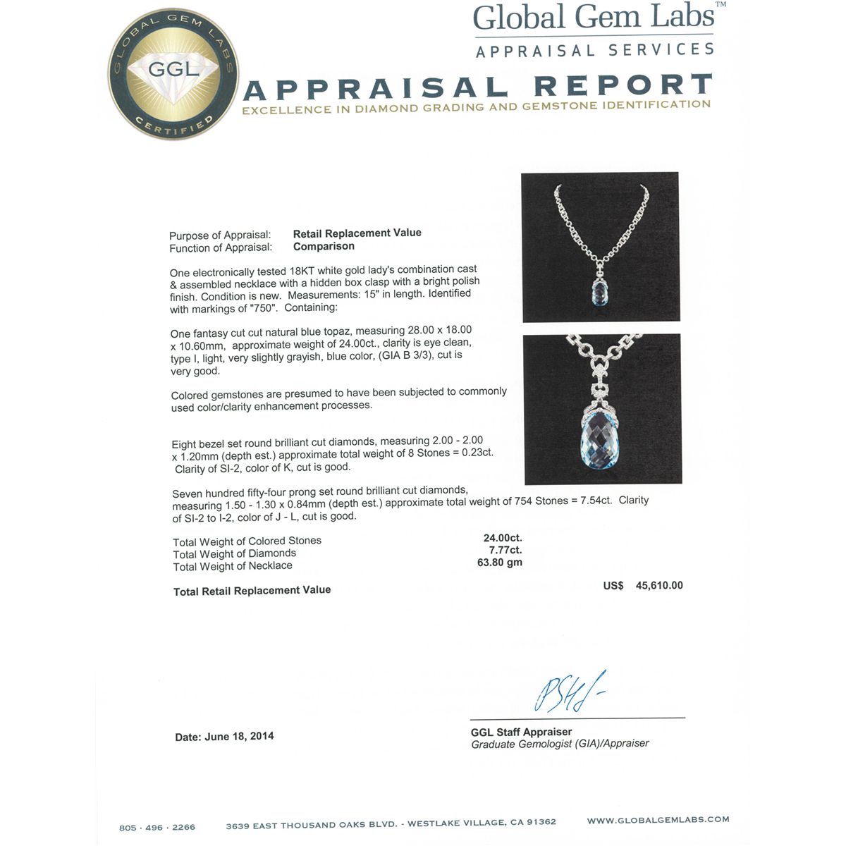 One electronically tested 18KT white gold Ladies combination cast & assembled necklace with a hidden box clasp with a bright polish finish. Condition is new. Measurements: 15" in length. Identified with markings of "750". Containing: One fantasy cut cut natural blue topaz, measuring 28.00 x 18.00 x 10.60mm, approximate weight of 24.00ct., clarity is eye clean, type I, light, very slightly grayish, blue color, (GIA B 3/3), cut is very good. Colored gemstones are presumed to have been subjected to commonly used color/clarity enhancement processes. Eight bezel set round brilliant cut diamonds, measuring 2.00 - 2.00 x 1.20mm (depth est.) approximate. Total Weight of 8 Stones = 0.23ct. Clarity: SI-2. Color: K, Cut is Good. Seven Hundred Fifty-Four prong set round brilliant cut diamonds, measuring 1.50 - 1.30 x 0.84mm (depth est.) approximate. Total Weight of 754 Stones = 7.54ct. Clarity: SI-2 to I-2. Color: J - L, Cut is Good. Total Weight of Colored Stones 24.00ct. Total Weight of Diamonds 7.77ct. Total Weight of Necklace 63.80 grams. GGL Appraised at $45,610.00.