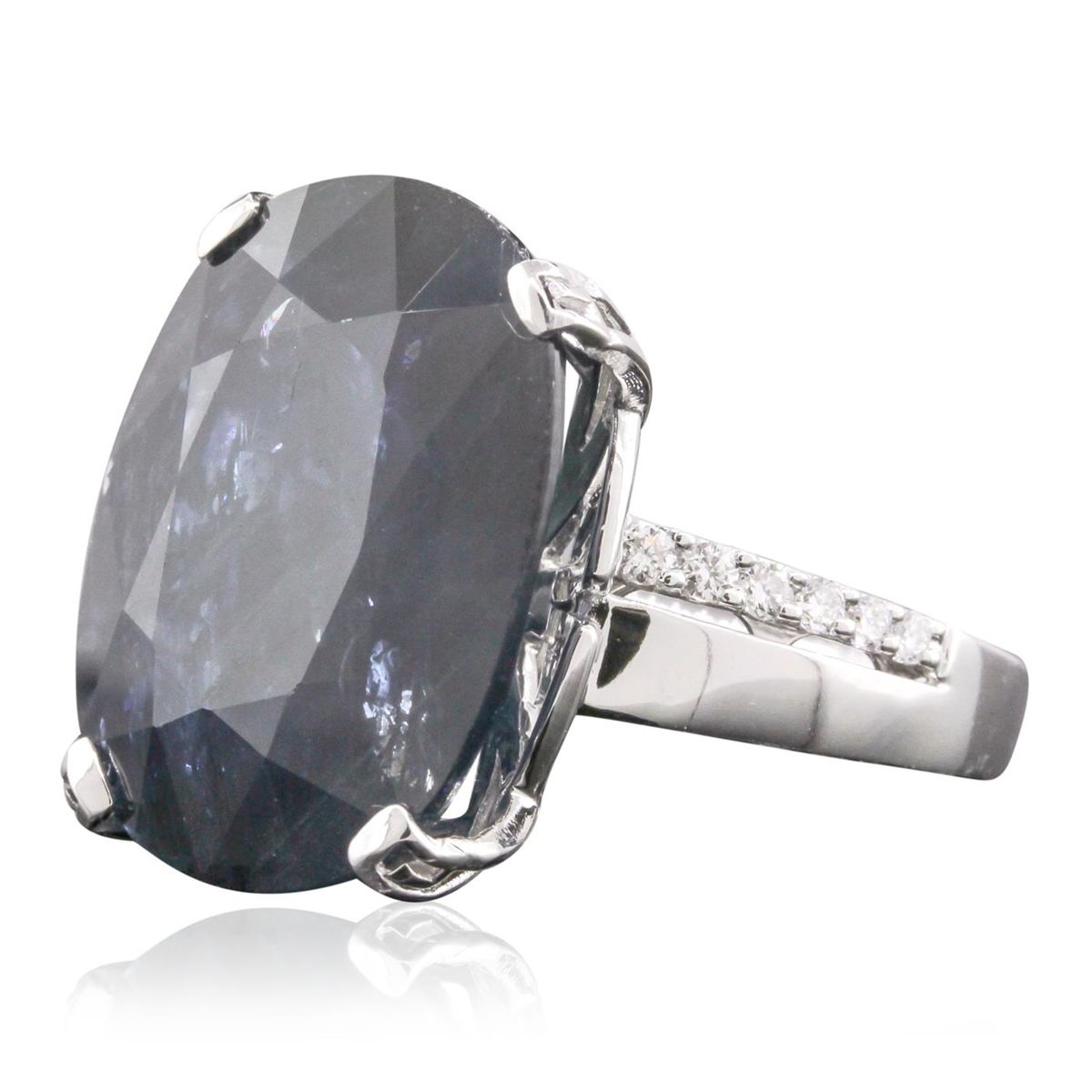 One electronically tested 18KT white gold Ladies combination cast & assembled ring with a bright polish finish. Condition is new. Identified with markings of "18K". Containing: One prong set oval modified mixed cut natural blue sapphire, measuring 20.95 x 16.63 x 9.20mm, approximate weight of 25.99ct., clarity is heavily included, type II, dark, strong, blue color, (GIA B 7/5), cut is good. Colored gemstones are presumed to have been subjected to commonly used color/clarity enhancement processes. Twelve prong set round brilliant cut diamonds, measuring 1.60 - 1.60 x 0.96mm (depth est.) approximate. Total Weight of 12 Stones = 0.18ct. Clarity: SI-2 to I-1. Color: H - I, Cut is Good. Total Weight of Colored Stones 25.99ct. Total Weight of Diamonds 0.18ct. Total Weight of Ring 13.40 grams. GGL Appraised at $14,745.00.