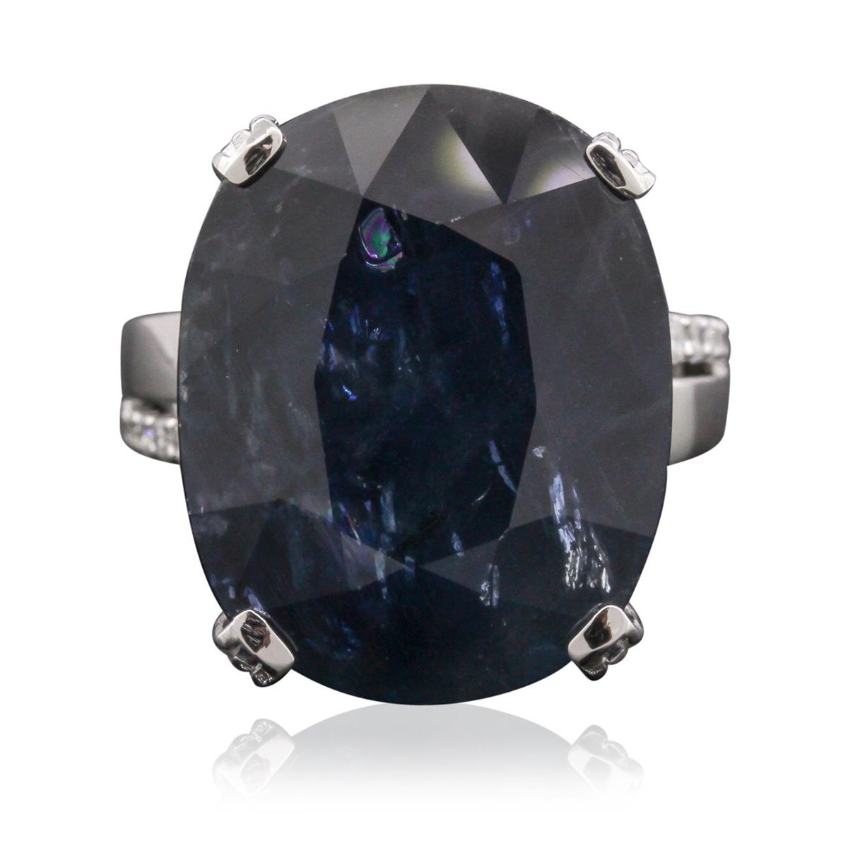One electronically tested 18KT white gold Ladies combination cast & assembled ring with a bright polish finish. Condition is new. Identified with markings of "18K". Containing: One prong set oval modified mixed cut natural blue sapphire, measuring 20.95 x 16.63 x 9.20mm, approximate weight of 25.99ct., clarity is heavily included, type II, dark, strong, blue color, (GIA B 7/5), cut is good. Colored gemstones are presumed to have been subjected to commonly used color/clarity enhancement processes. Twelve prong set round brilliant cut diamonds, measuring 1.60 - 1.60 x 0.96mm (depth est.) approximate. Total Weight of 12 Stones = 0.18ct. Clarity: SI-2 to I-1. Color: H - I, Cut is Good. Total Weight of Colored Stones 25.99ct. Total Weight of Diamonds 0.18ct. Total Weight of Ring 13.40 grams. GGL Appraised at $14,745.00.