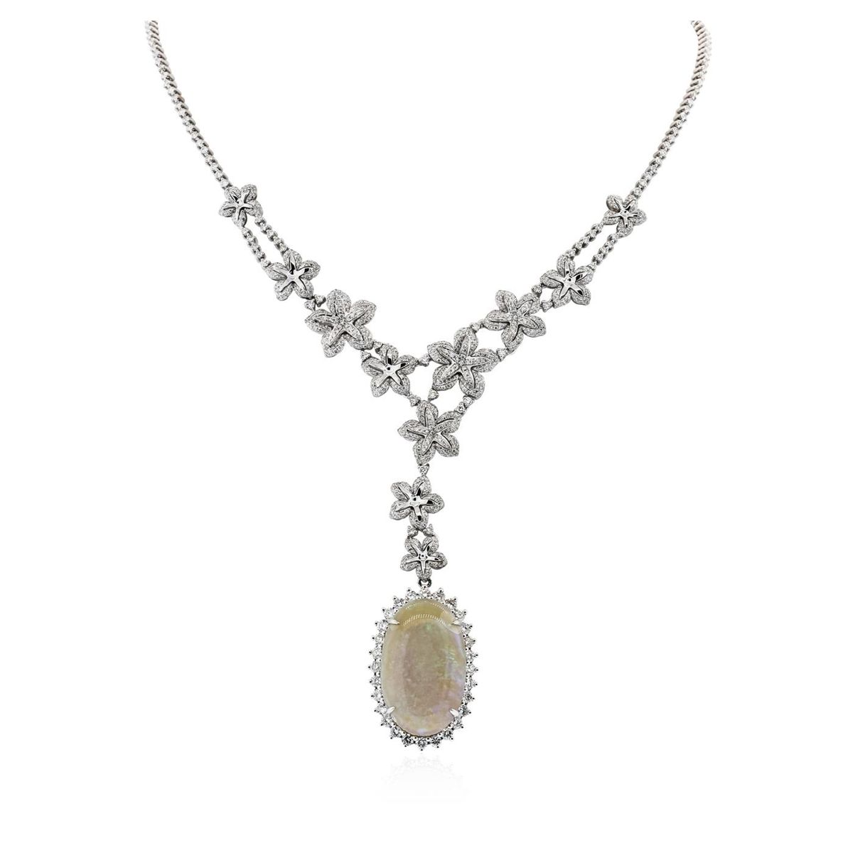 One polished, stamped, and electronically tested solid 18KT white gold "Michael Christoff" designer necklace mounted with: 1 genuine opal weighing 29.11cts and 1,149 genuine round diamonds weighing 10.09cts. The necklace is finished with a tension lock clasp and safety clasp. This item weighs approximately 49.60 grams. Condition is new, excellent workmanship. AIGL Appraised at $104,567.00.