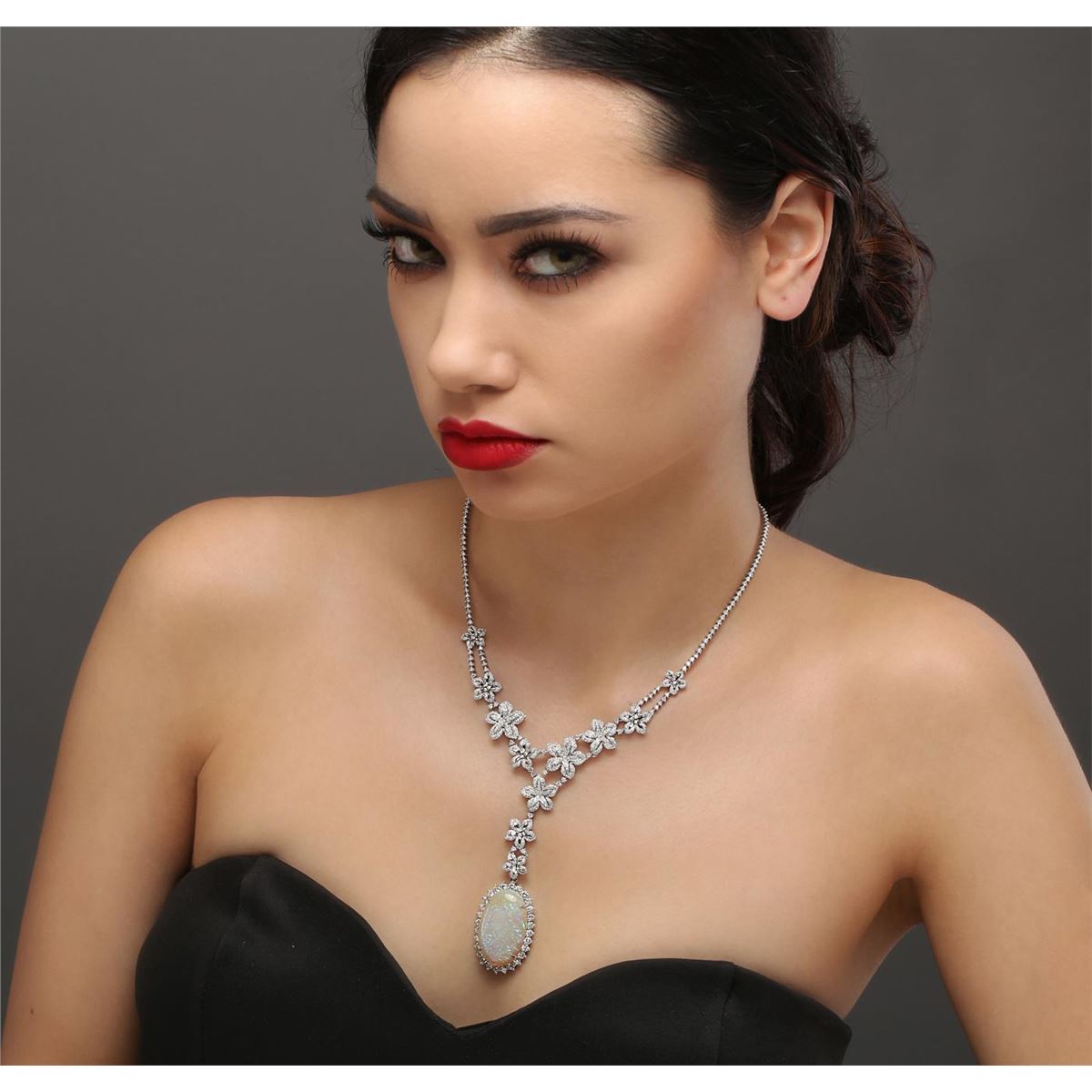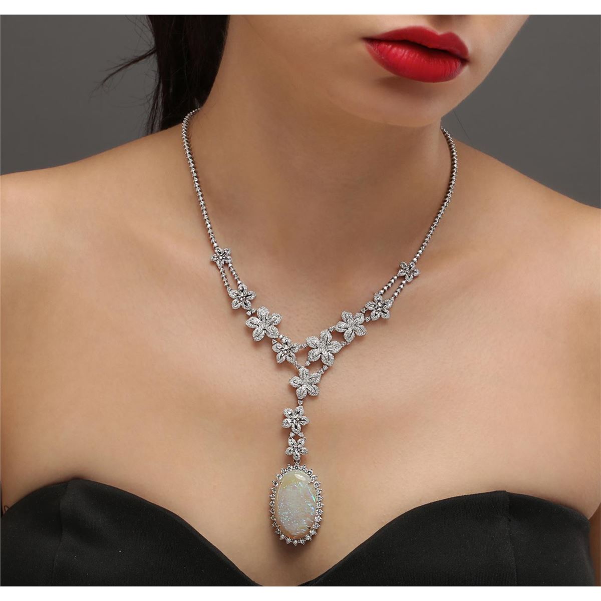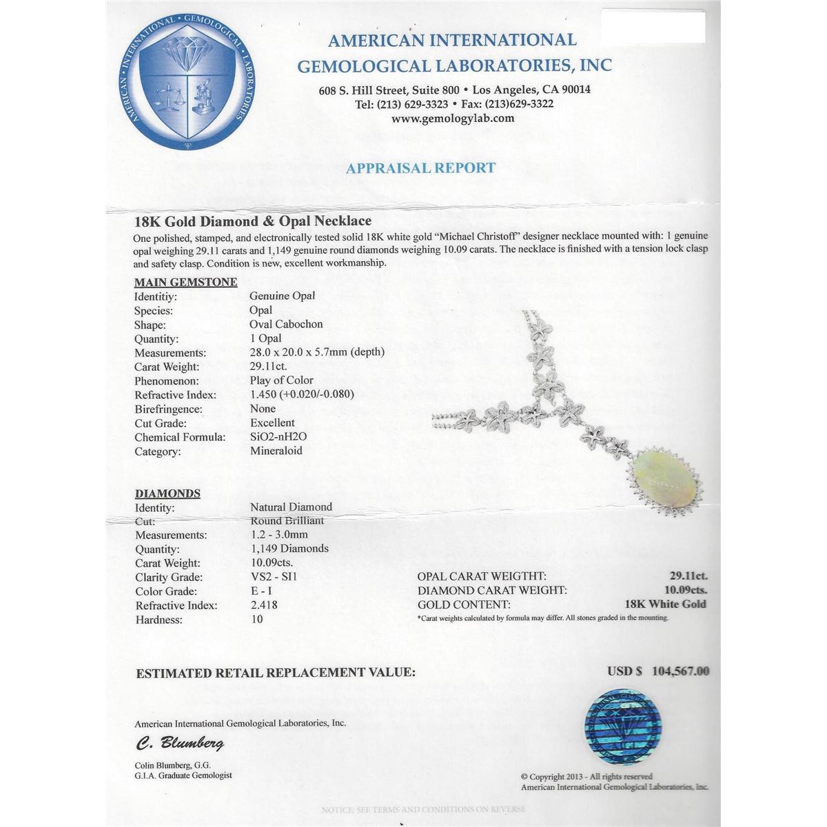 One polished, stamped, and electronically tested solid 18KT white gold "Michael Christoff" designer necklace mounted with: 1 genuine opal weighing 29.11cts and 1,149 genuine round diamonds weighing 10.09cts. The necklace is finished with a tension lock clasp and safety clasp. This item weighs approximately 49.60 grams. Condition is new, excellent workmanship. AIGL Appraised at $104,567.00.