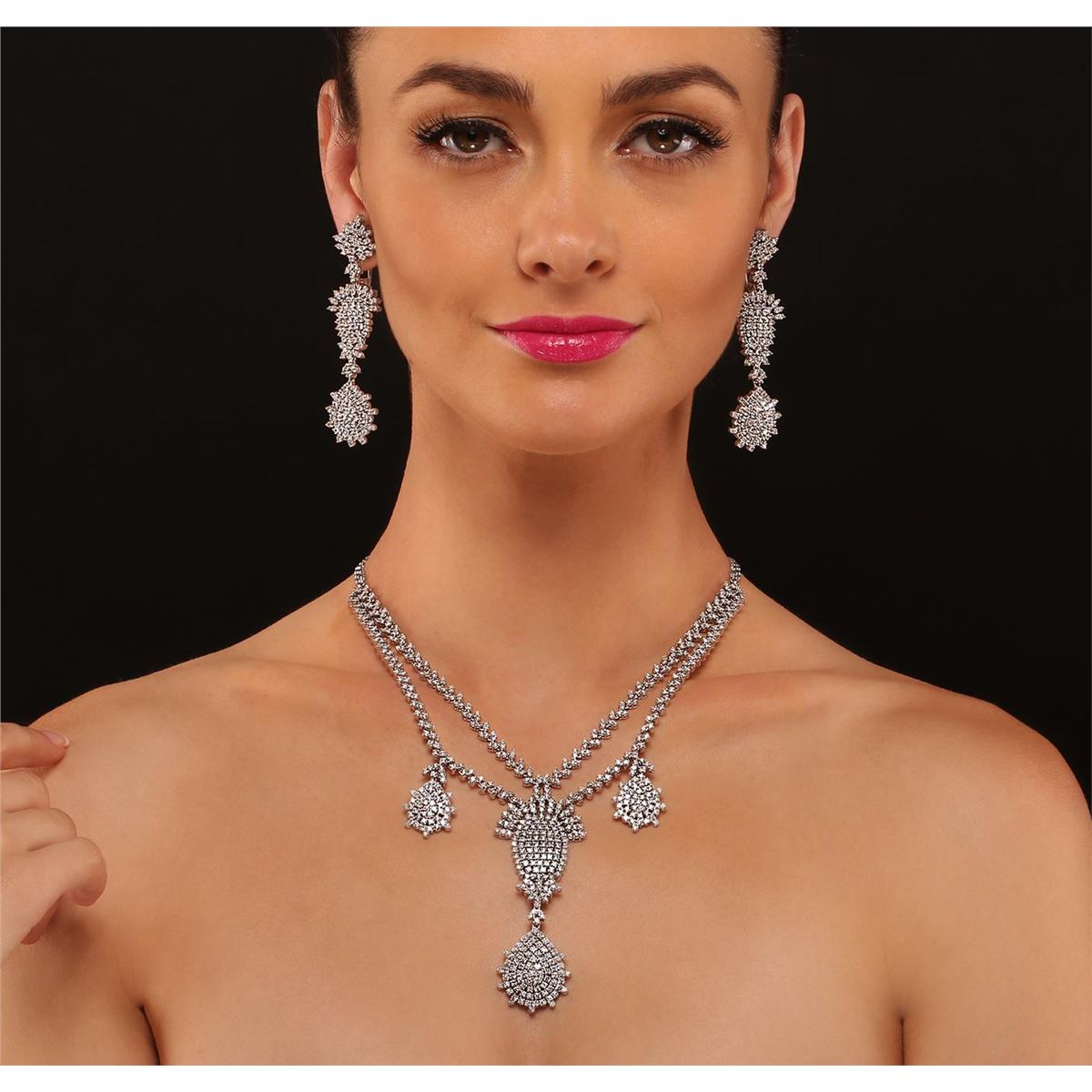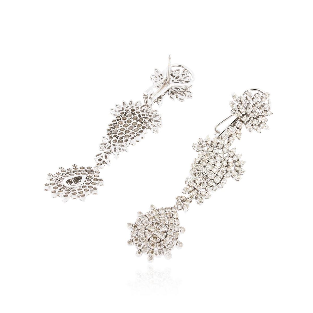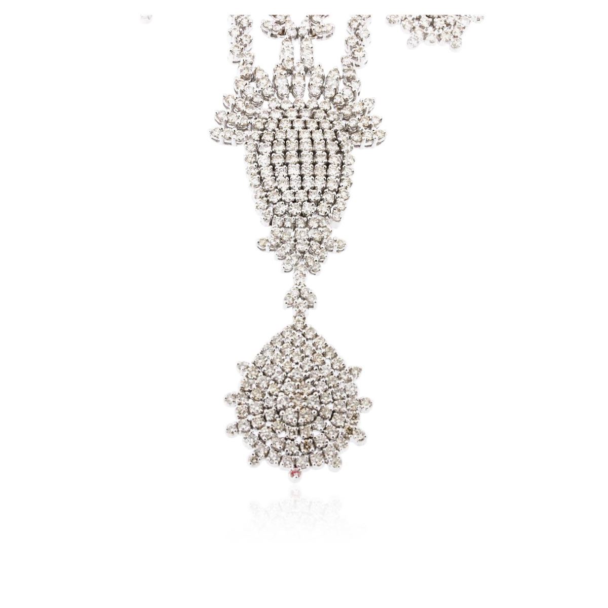 One electronically tested 18KT White Gold ladies cast & assembled diamond suite with a bright polish finish. Condition is Good. The suite features one diamond necklace and a pair of matching diamond earrings. The necklace features a dangling floral diamond cluster center, supported by a stationary floral diamond cluster followed by two ribbons of diamonds with a floral diamond cluster dangle on each side completed by an alternating bar link and panther design chain measuring seventeen and one half inch length with an adjustable hook clasp. The suite is completed by a pair of earrings featuring three dangling floral diamond clusters with omega backs. Identified with markings of "18K". Containing: Sixty prong set round brilliant cut diamonds, measuring 2.40 - 2.30 x 1.43mm (depth est.) approximate total weight of 60 Stones = 3.01ct. Faint brown secondary color throughout. Graded in the setting. Clarity: SI-2 to I-1. Color: K - M. Nine Hundred Seventy-Seven prong set round brilliant cut diamonds, measuring 2.00 - 1.80 x 1.24mm (depth est.) approximate total weight of 977 Stones = 26.87ct. Faint brown secondary color throughout. Graded in the setting. Clarity: SI-2 to I-1. Color: K - M. Total Weight of Diamonds 29.88ct. Total Weight of Suite 113.23 grams. AIG Appraised at $90,820.00.