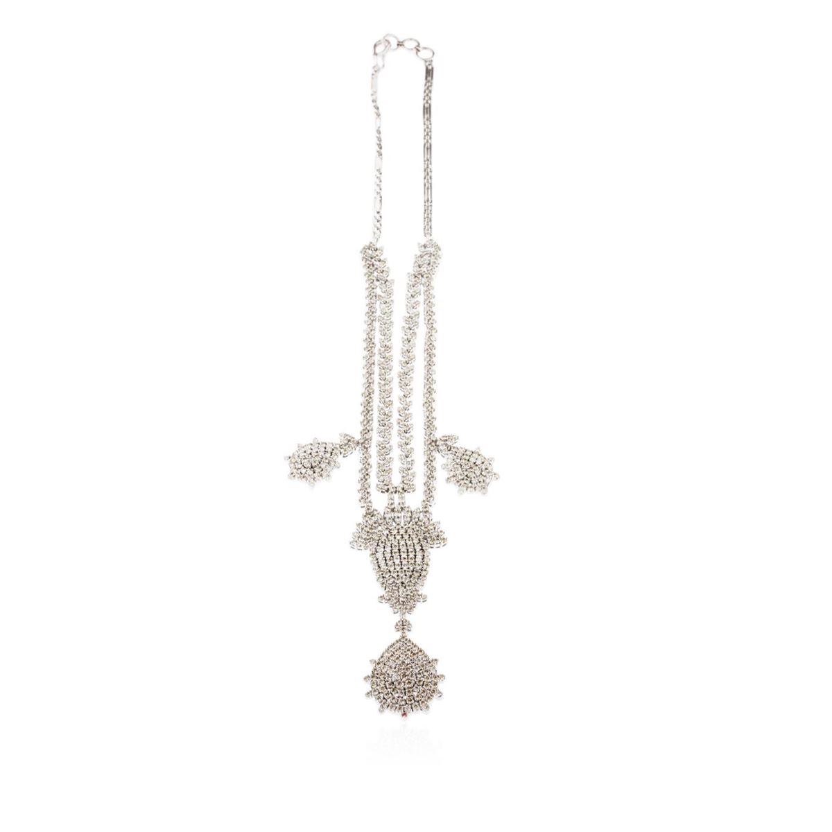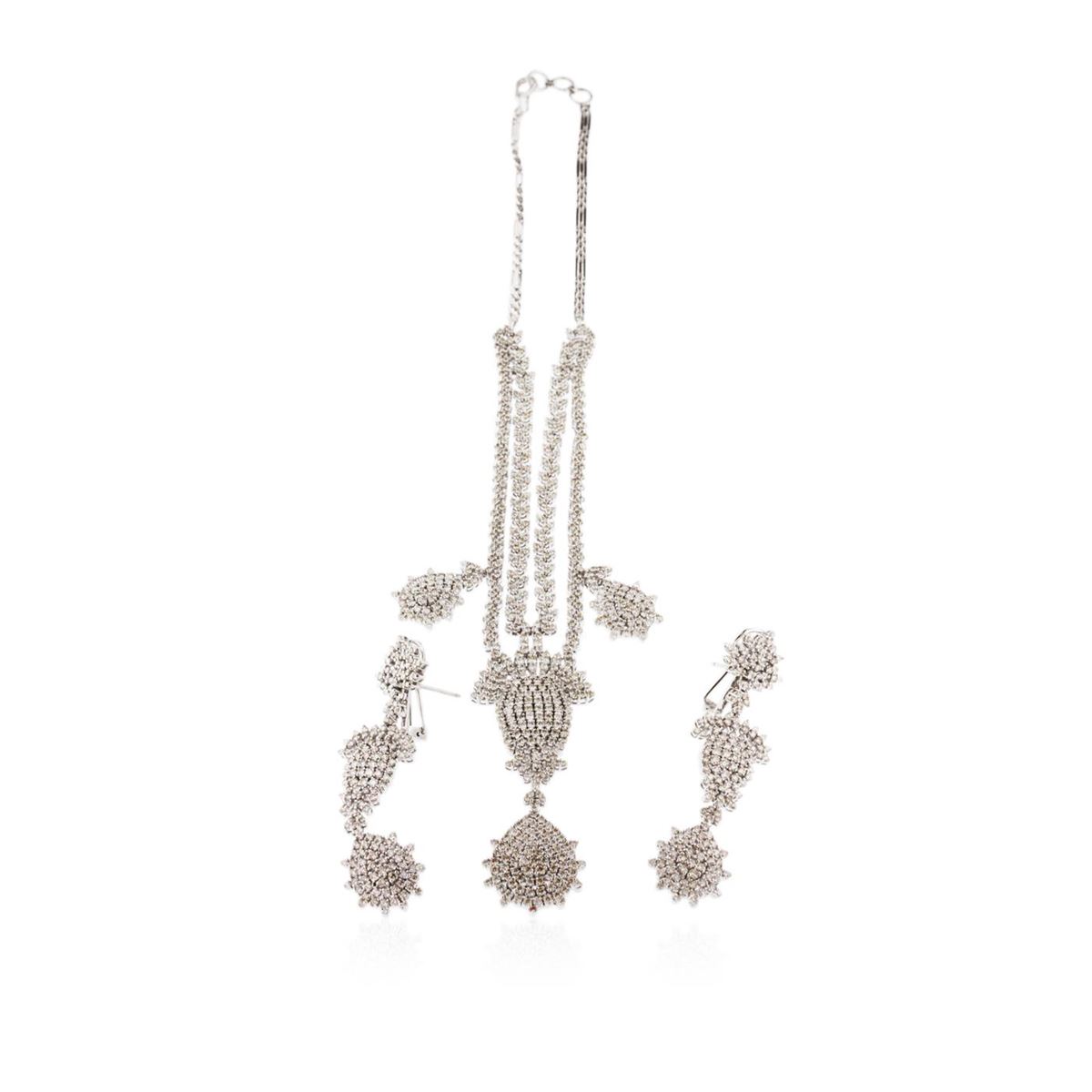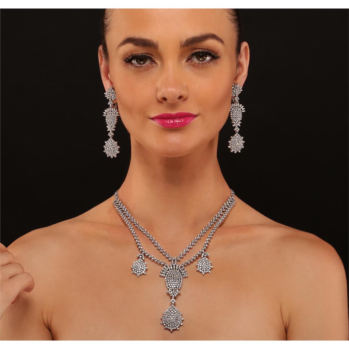 One electronically tested 18KT White Gold ladies cast & assembled diamond suite with a bright polish finish. Condition is Good. The suite features one diamond necklace and a pair of matching diamond earrings. The necklace features a dangling floral diamond cluster center, supported by a stationary floral diamond cluster followed by two ribbons of diamonds with a floral diamond cluster dangle on each side completed by an alternating bar link and panther design chain measuring seventeen and one half inch length with an adjustable hook clasp. The suite is completed by a pair of earrings featuring three dangling floral diamond clusters with omega backs. Identified with markings of "18K". Containing: Sixty prong set round brilliant cut diamonds, measuring 2.40 - 2.30 x 1.43mm (depth est.) approximate total weight of 60 Stones = 3.01ct. Faint brown secondary color throughout. Graded in the setting. Clarity: SI-2 to I-1. Color: K - M. Nine Hundred Seventy-Seven prong set round brilliant cut diamonds, measuring 2.00 - 1.80 x 1.24mm (depth est.) approximate total weight of 977 Stones = 26.87ct. Faint brown secondary color throughout. Graded in the setting. Clarity: SI-2 to I-1. Color: K - M. Total Weight of Diamonds 29.88ct. Total Weight of Suite 113.23 grams. AIG Appraised at $90,820.00.