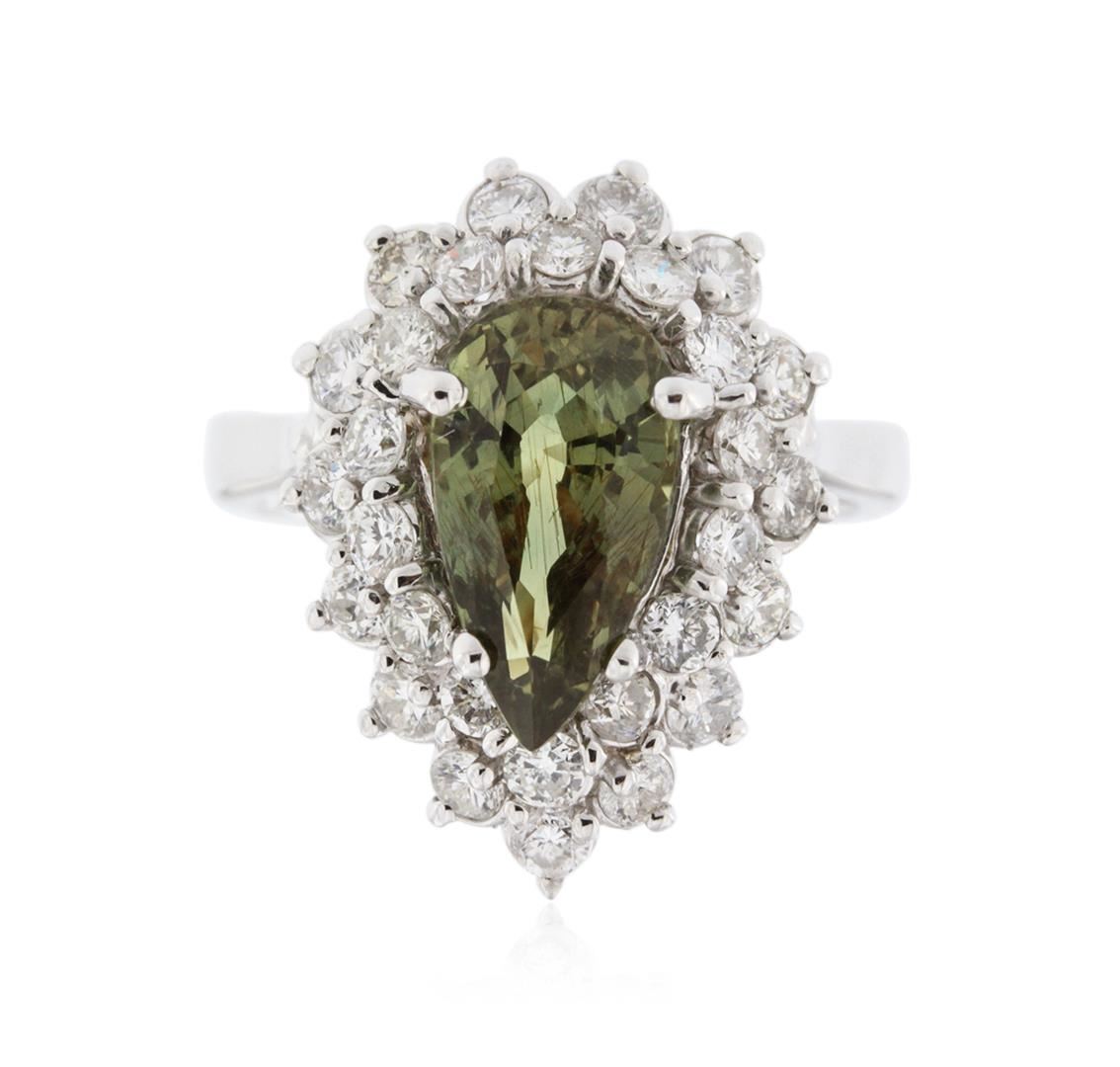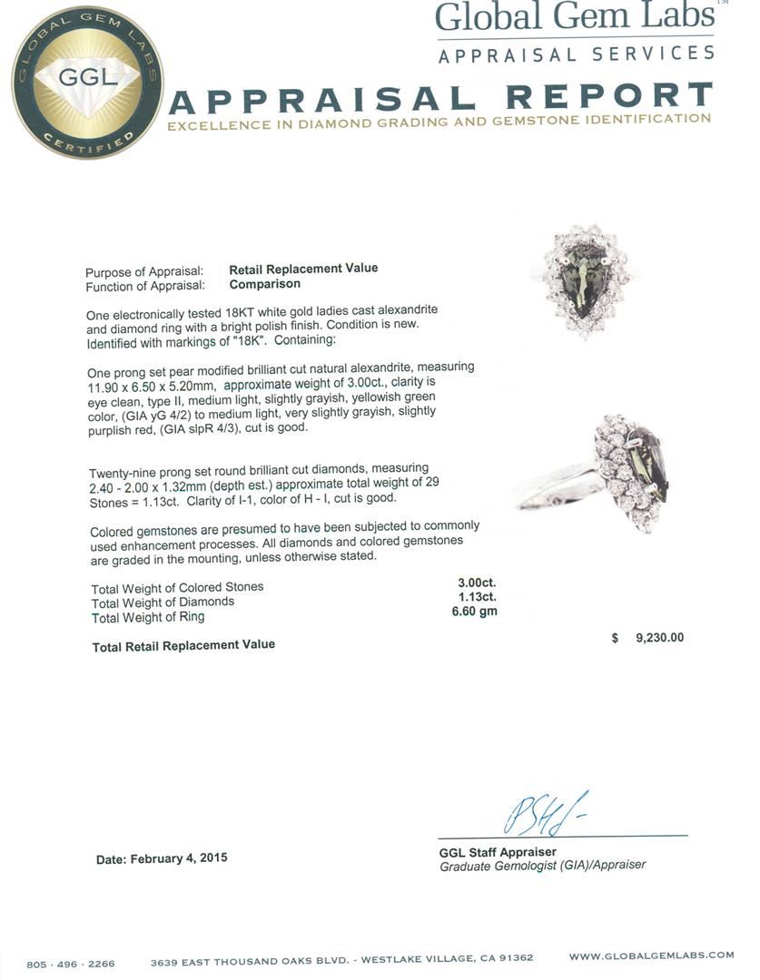 One electronically tested 18KT white gold ladies cast alexandrite and diamond ring with a bright polish finish. Identified with markings of "18K". Condition is new. Containing: One prong set pear modified brilliant cut natural alexandrite, measuring 11.90 x 6.50 x 5.20mm, approximate weight of 3.00ct., clarity is eye clean, type II, medium light, slightly grayish, yellowish green color, (GIA yG 4/2) to medium light, very slightly grayish, slightly purplish red, (GIA slpR 4/3), cut is good. Twenty-Nine prong set round brilliant cut diamonds, measuring 2.40 - 2.00 x 1.32mm (depth est.) approximate total weight of 29 Stones = 1.13ct. Clarity: I-1. Color: H - I, Cut is Good. Colored gemstones are presumed to have been subjected to commonly used enhancement processes. All diamonds and colored gemstones are graded in the mounting, unless otherwise stated. Total Weight of Colored Stones 3.00ct. Total Weight of Diamonds 1.13ct. Total Weight of Ring 6.60 grams. GGL Appraised at $9,230.00.