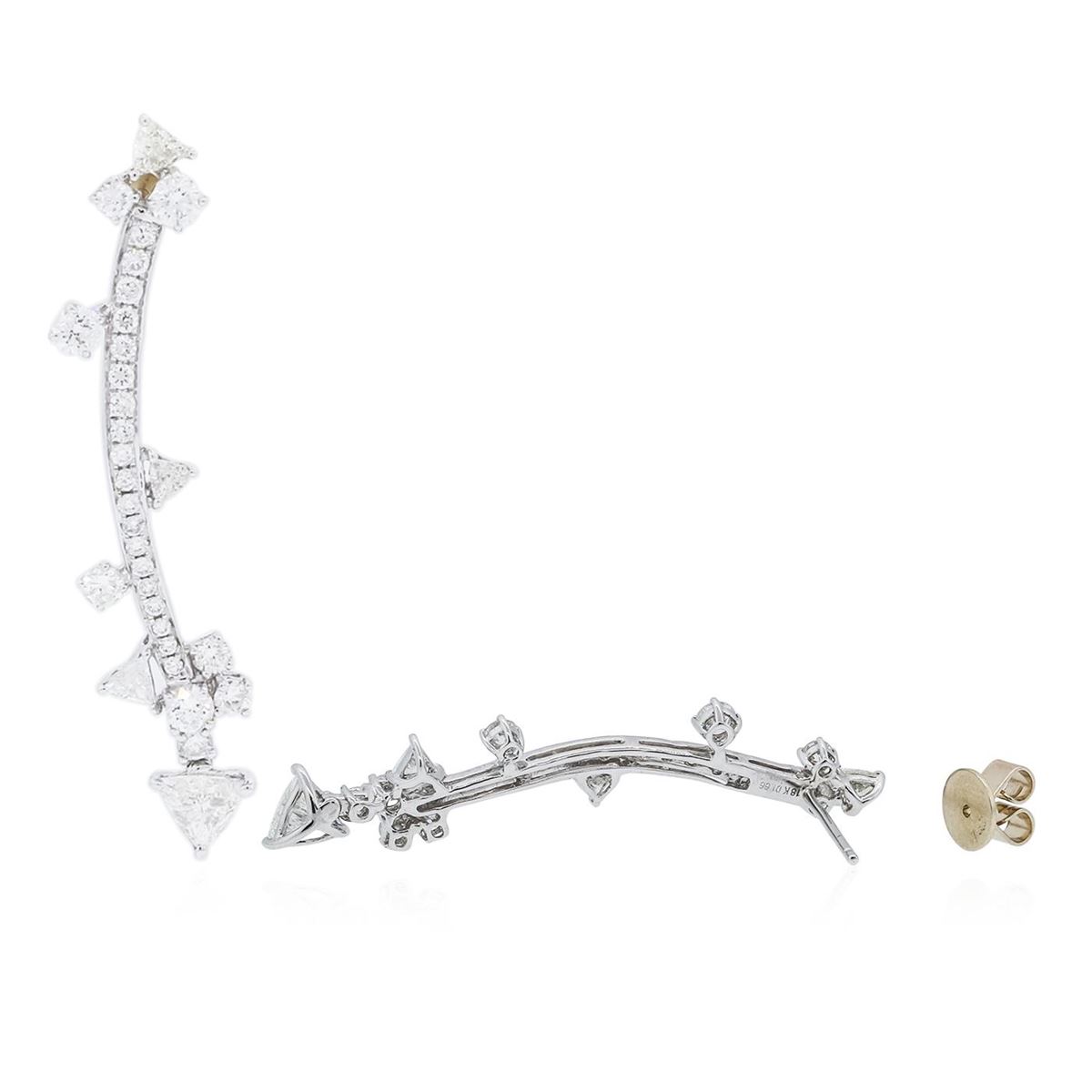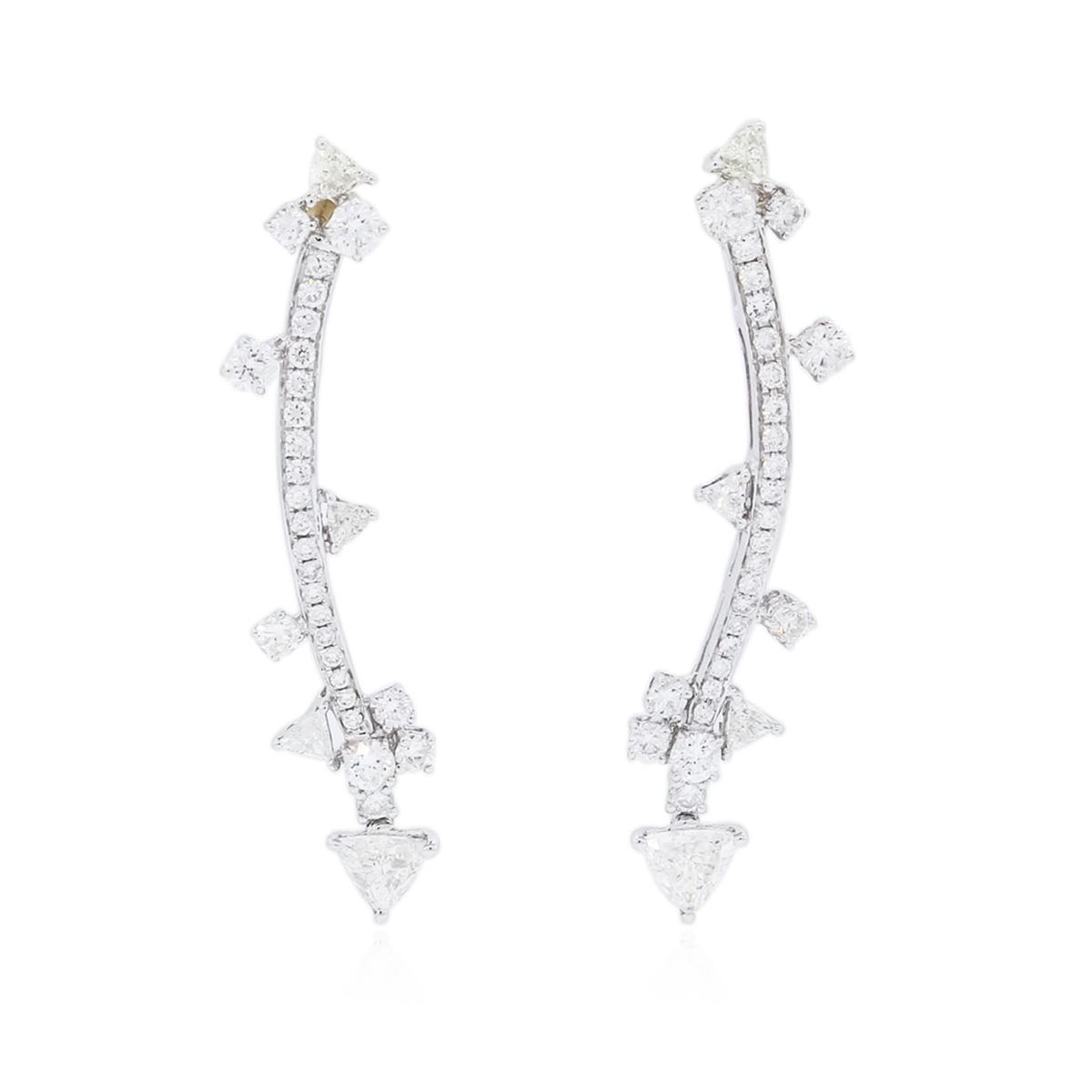 One pair of earrings featuring: 18KT white gold weighing 5.60 grams containing eight trilliant cut diamonds with a total weight of 1.34ct and 54 round diamonds with a total weight of 1.66ct.