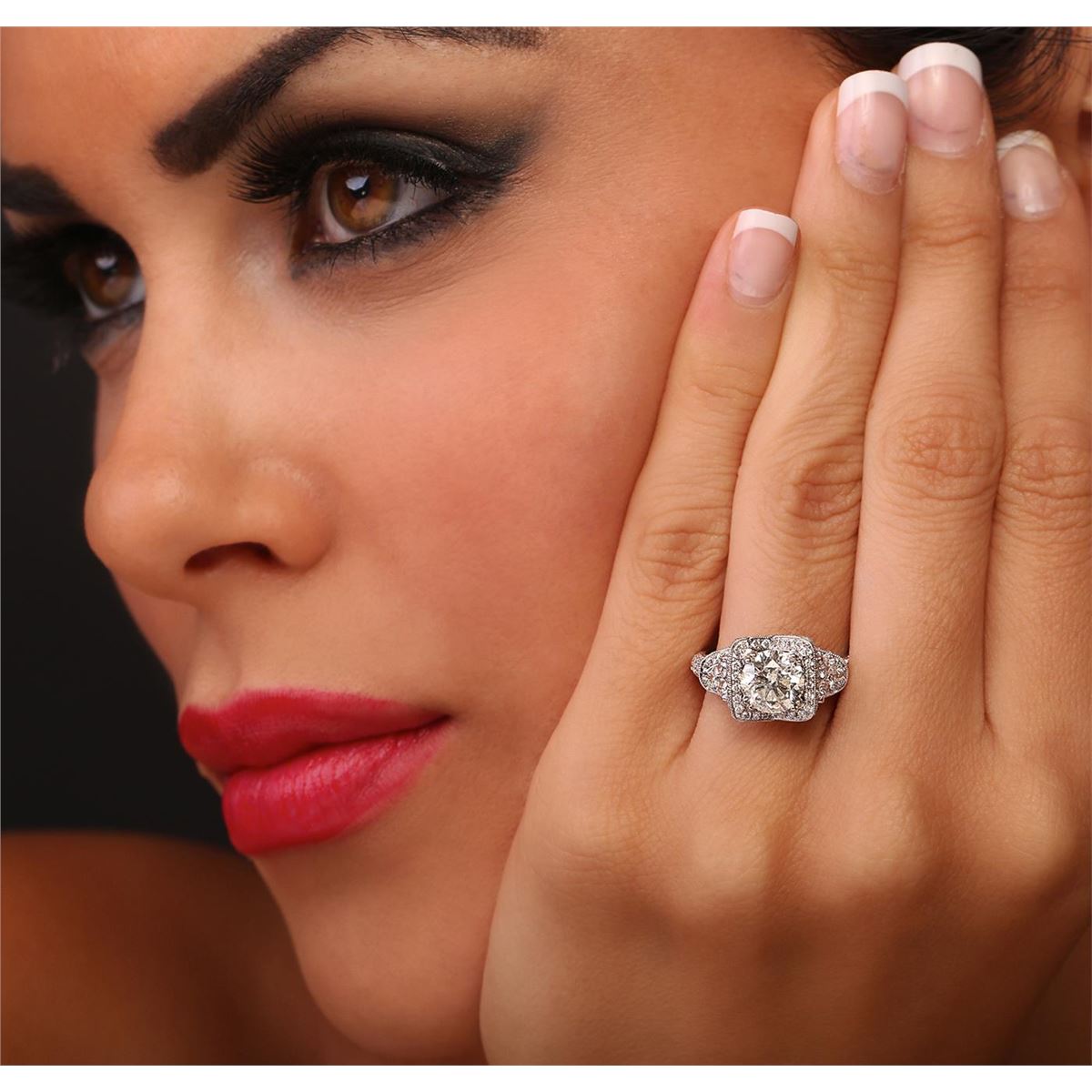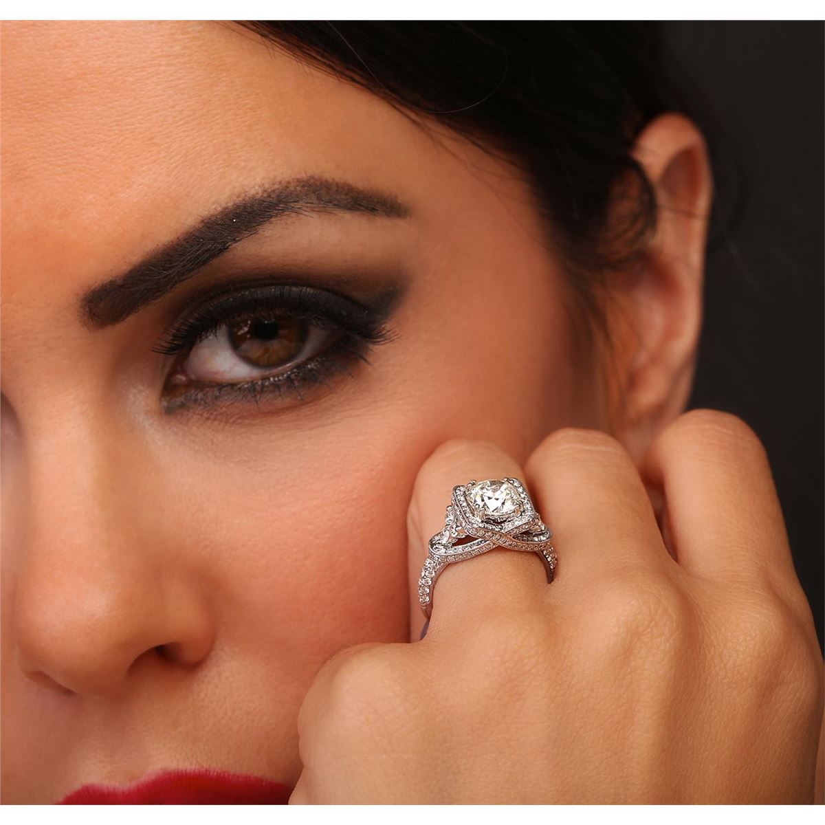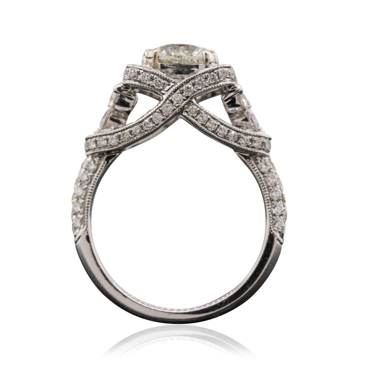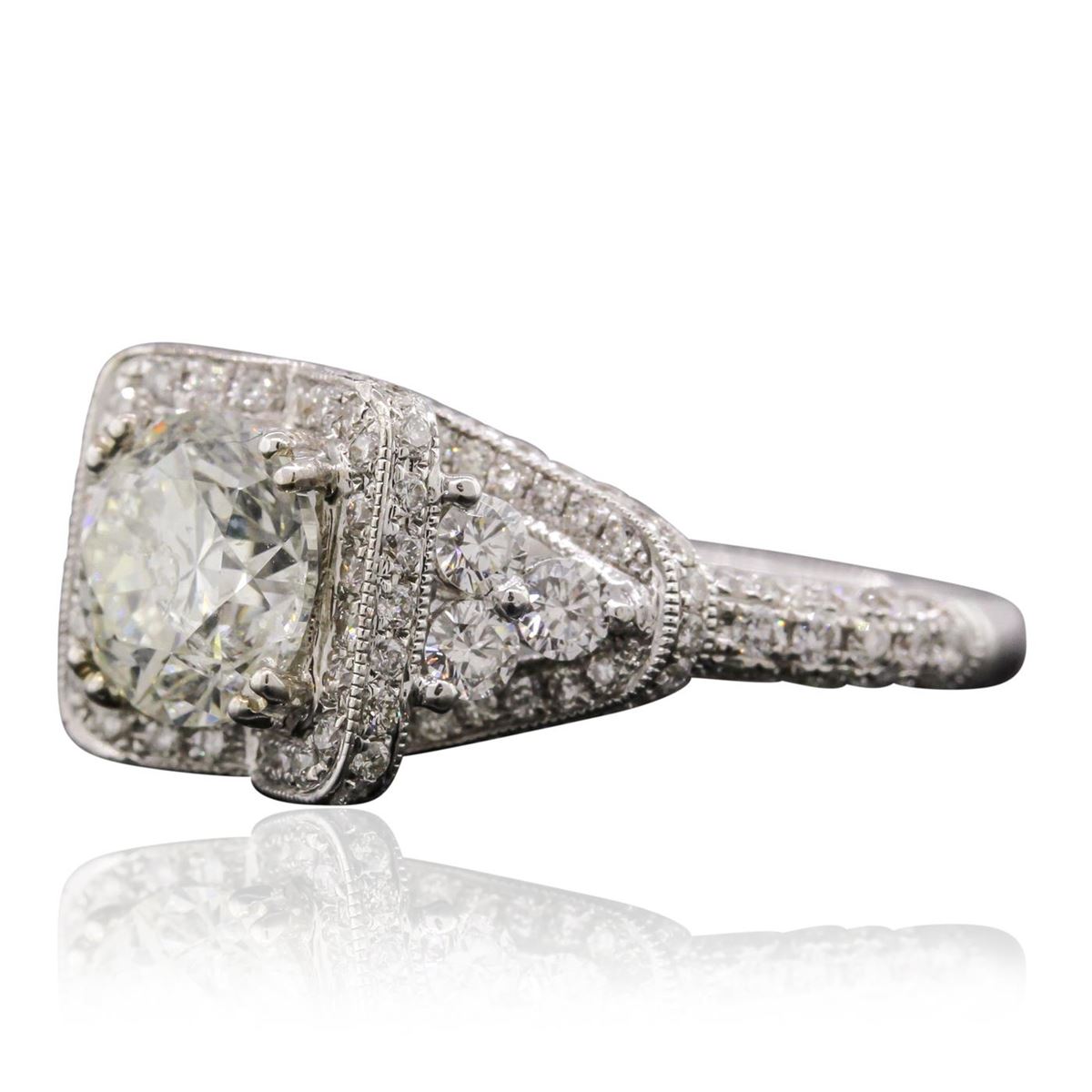 One electronically tested 18KT white gold Ladies combination cast & assembled engagement ring with a bright polish finish. Condition is new. Identified with markings of "18K". Containing: One prong set round brilliant cut diamond, measuring 7.70 - 7.60 x 5.00mm (depth est.) approximate weight of 1.79ct. Clarity: I-1. Color: L, Cut is Good. Six prong set round brilliant cut diamonds, measuring 2.40 - 2.40 x 1.44mm (depth est.) approximate. Total Weight of 6 Stones = 0.30ct. Clarity: SI-2. Color: H - I, Cut is Good. One Hundred Forty-Six bead set round brilliant cut diamonds, measuring 1.20 - 1.20 x 0.72mm (depth est.) approximate. Total Weight of 146 Stones = 0.92ct. Clarity: I-1. Color: H - I, Cut is Good. Total Weight of Diamonds 3.01ct. Total Weight of Engagement Ring 7.30 grams. GGL Appraised at $31,765.00.