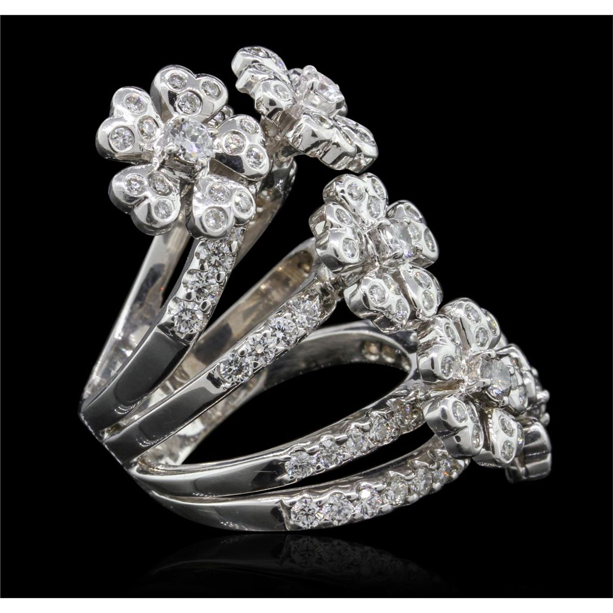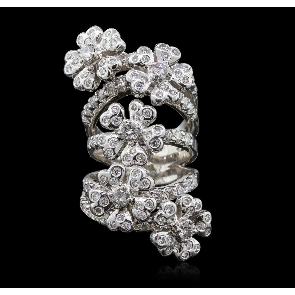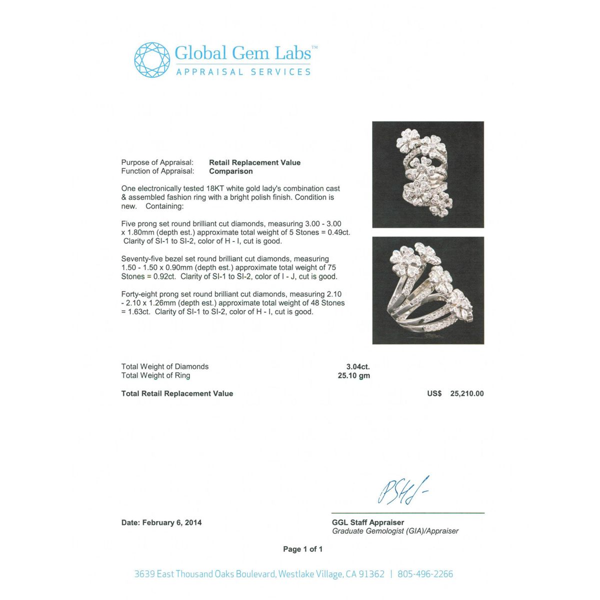 One electronically tested 18KT white gold Ladies combination cast & assembled fashion ring with a bright polish finish. Condition is new. Containing: Five prong set round brilliant cut diamonds, measuring 3.00 - 3.00 x 1.80mm (depth est.) approximate total weight of 5 Stones = 0.49ct. Clarity of SI-1 to SI-2, Color of H - I, Cut is Good. Seventy-Five bezel set round brilliant cut diamonds, measuring 1.50 - 1.50 x 0.90mm (depth est.) approximate total weight of 75 Stones = 0.92ct. Clarity of SI-1 to SI-2, Color of I - J, Cut is Good. Forty-Eight prong set round brilliant cut diamonds, measuring 2.10 - 2.10 x 1.26mm (depth est.) approximate total weight of 48 Stones = 1.63ct. Clarity of SI-1 to SI-2, Color of H - I, Cut is Good. Total Weight of Diamonds 3.04ct. Total Weight of Ring 25.10gm. GGL Appraised at $25,210.00.