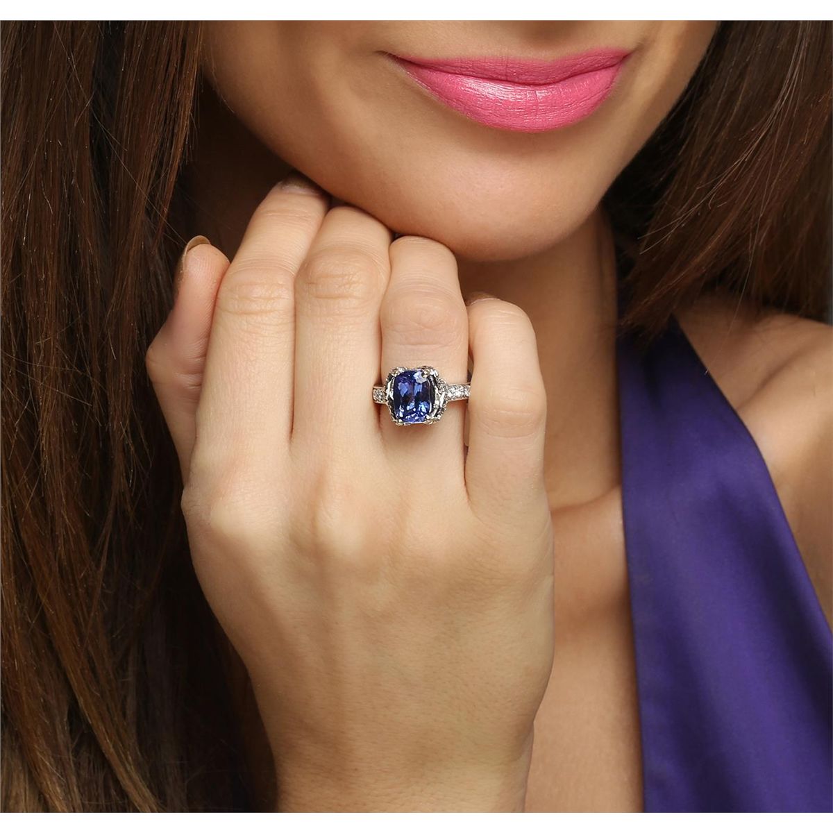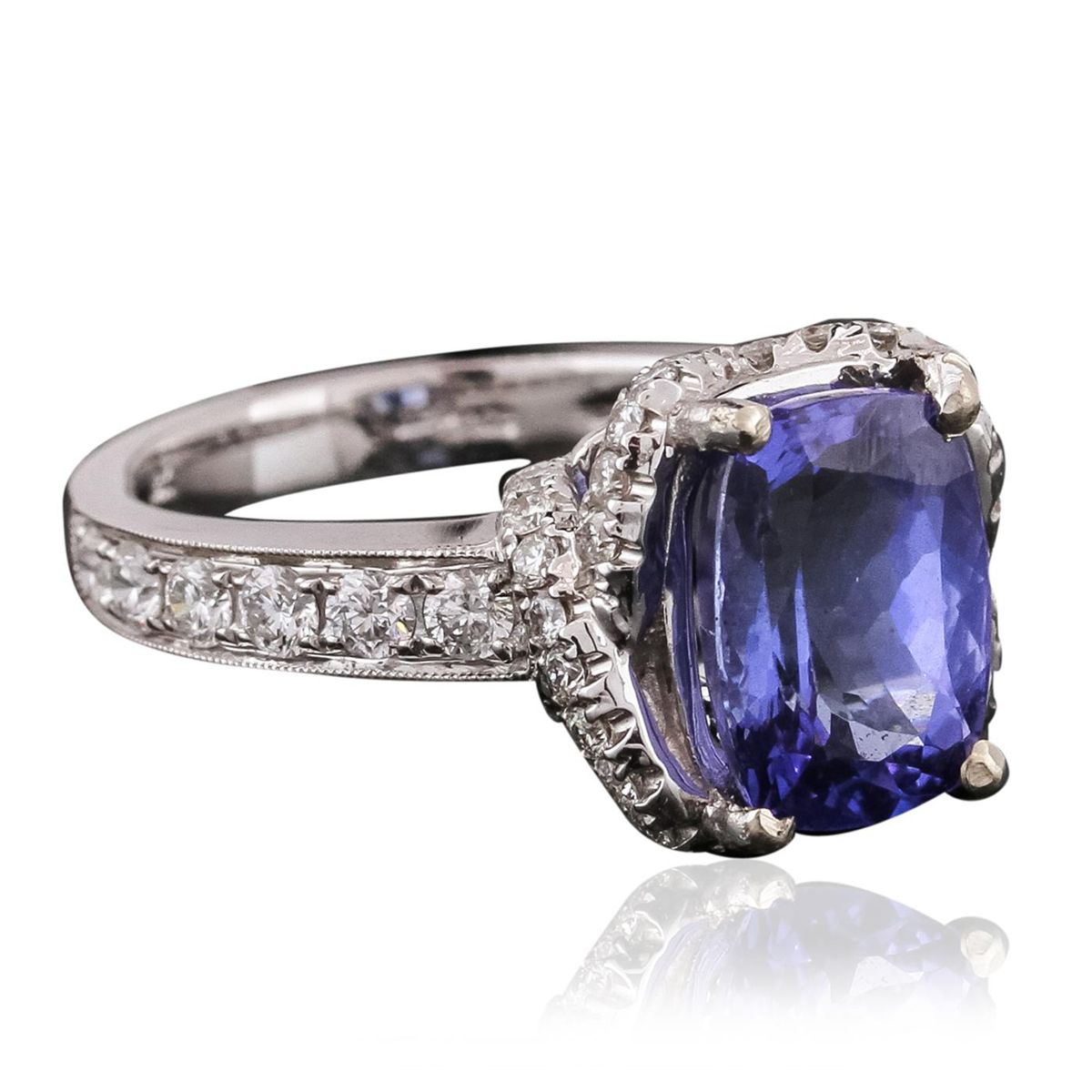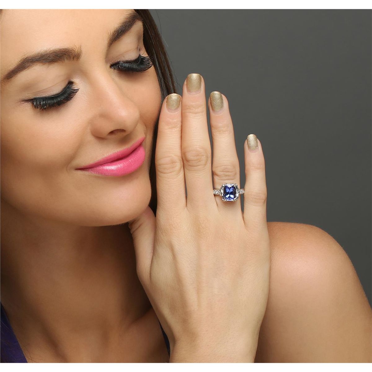 One electronically tested 18KT white gold ladies combination cast & assembled engagement ring with a bright polish finish. Identified with markings of "18K". Condition is new. Containing: One prong set rectangular cushion modified brilliant cut natural tanzanite, measuring 10.47 x 7.56 x 4.92mm, approximate weight of 3.06ct., clarity is eye clean, type I, medium, moderately strong, bluish violet color, (GIA bV 5/4), cut is good. Twelve prong set round brilliant cut diamonds, measuring 2.20 - 2.20 x 1.32mm (depth est.) approximate total weight of 12 Stones = 0.57ct. Clarity: SI-1 to I-1. Color: I - J, Cut is Good. Forty prong set round brilliant cut diamonds, measuring 1.30 - 1.30 x 0.78mm (depth est.) approximate total weight of 40 Stones = 0.42ct. Clarity: SI-2 to I-1. Color: H - I, Cut is Good. Colored gemstones are presumed to have been subjected to commonly used enhancement processes. All diamonds and colored gemstones are graded in the mounting, unless otherwise stated. Total Weight of Colored Stones 3.06ct. Total Weight of Diamonds 0.99ct. Total Weight of Ring 7.50 grams. GGL Appraised at $10,080.00.