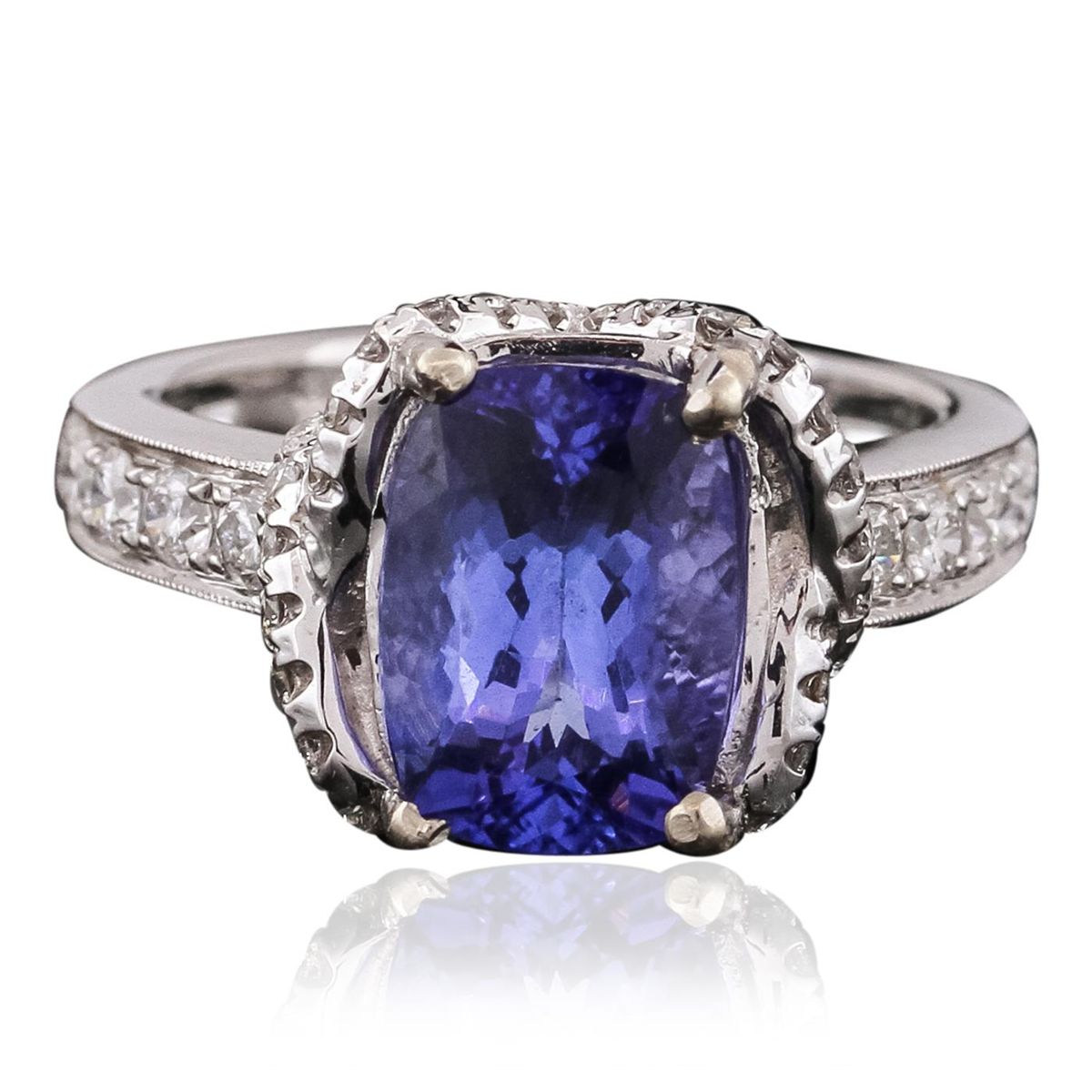 One electronically tested 18KT white gold ladies combination cast & assembled engagement ring with a bright polish finish. Identified with markings of "18K". Condition is new. Containing: One prong set rectangular cushion modified brilliant cut natural tanzanite, measuring 10.47 x 7.56 x 4.92mm, approximate weight of 3.06ct., clarity is eye clean, type I, medium, moderately strong, bluish violet color, (GIA bV 5/4), cut is good. Twelve prong set round brilliant cut diamonds, measuring 2.20 - 2.20 x 1.32mm (depth est.) approximate total weight of 12 Stones = 0.57ct. Clarity: SI-1 to I-1. Color: I - J, Cut is Good. Forty prong set round brilliant cut diamonds, measuring 1.30 - 1.30 x 0.78mm (depth est.) approximate total weight of 40 Stones = 0.42ct. Clarity: SI-2 to I-1. Color: H - I, Cut is Good. Colored gemstones are presumed to have been subjected to commonly used enhancement processes. All diamonds and colored gemstones are graded in the mounting, unless otherwise stated. Total Weight of Colored Stones 3.06ct. Total Weight of Diamonds 0.99ct. Total Weight of Ring 7.50 grams. GGL Appraised at $10,080.00.
