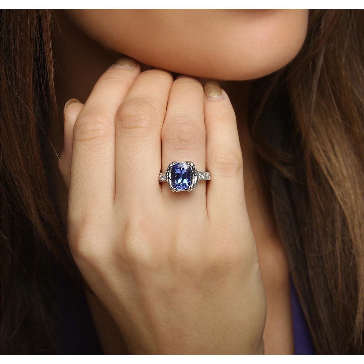 One electronically tested 18KT white gold ladies combination cast & assembled engagement ring with a bright polish finish. Identified with markings of "18K". Condition is new. Containing: One prong set rectangular cushion modified brilliant cut natural tanzanite, measuring 10.47 x 7.56 x 4.92mm, approximate weight of 3.06ct., clarity is eye clean, type I, medium, moderately strong, bluish violet color, (GIA bV 5/4), cut is good. Twelve prong set round brilliant cut diamonds, measuring 2.20 - 2.20 x 1.32mm (depth est.) approximate total weight of 12 Stones = 0.57ct. Clarity: SI-1 to I-1. Color: I - J, Cut is Good. Forty prong set round brilliant cut diamonds, measuring 1.30 - 1.30 x 0.78mm (depth est.) approximate total weight of 40 Stones = 0.42ct. Clarity: SI-2 to I-1. Color: H - I, Cut is Good. Colored gemstones are presumed to have been subjected to commonly used enhancement processes. All diamonds and colored gemstones are graded in the mounting, unless otherwise stated. Total Weight of Colored Stones 3.06ct. Total Weight of Diamonds 0.99ct. Total Weight of Ring 7.50 grams. GGL Appraised at $10,080.00.