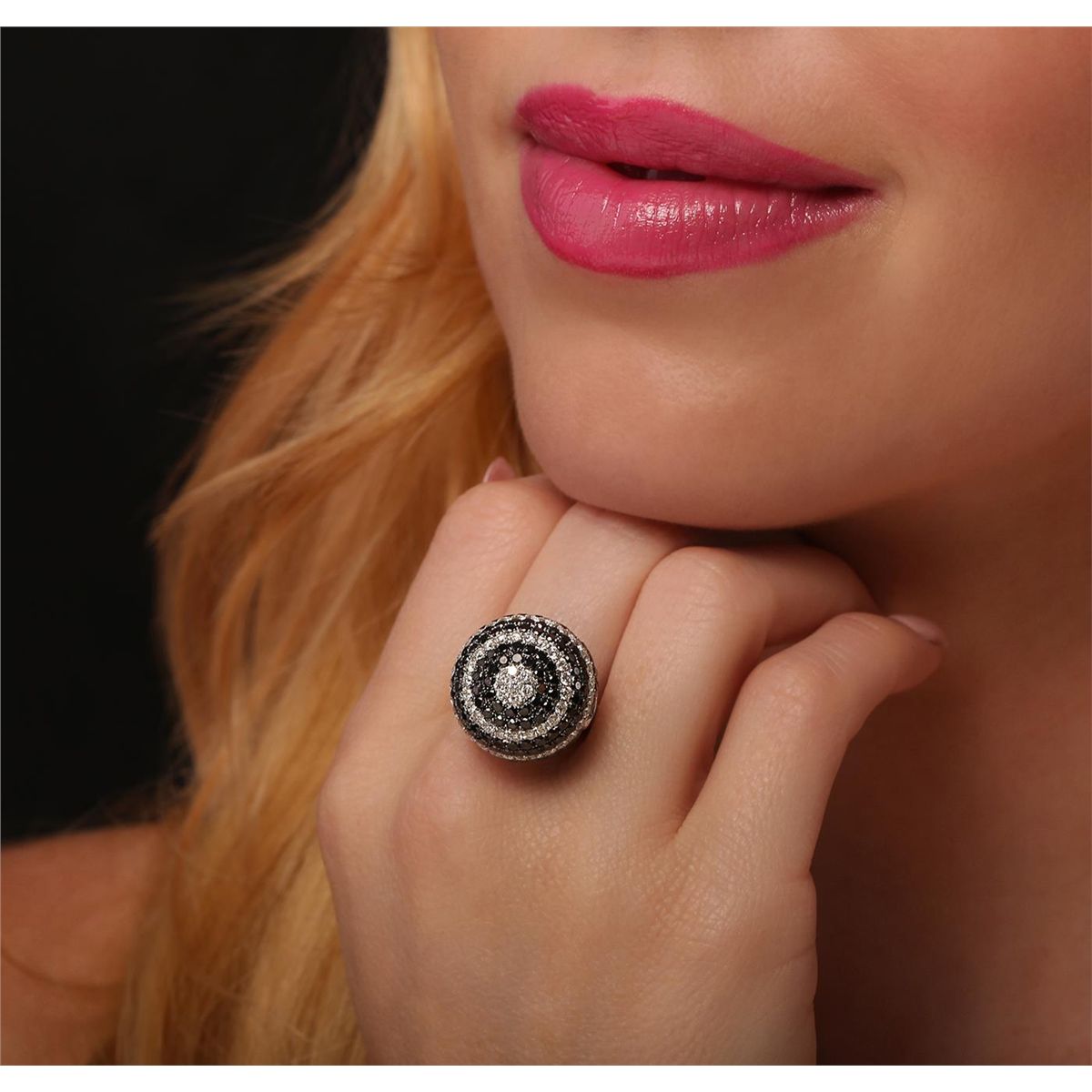 One electronically tested 18KT white gold ladies cast black and white diamond ring. Condition is new, good workmanship. The ring features a sphere of black and white diamond ribbons supported by a floral motif lattice under gallery, completed by a two and one-half millimeter wide band. Bright and anodized finish with milgrain detailing. Identified with markings of "750". Containing: Sixty prong set round brilliant cut diamonds, measuring 1.80 - 1.70 x 1.05mm (depth est.) approximate. Total Weight of 60 Stones = 1.27ct. Graded in the setting. Clarity: VS-1 to SI-1. Color: G - I One Hundred Fourteen prong set round brilliant cut diamonds, measuring 1.80 - 1.40 x 0.96mm (depth est.) approximate. Total Weight of 114 Stones = 1.80ct. Indications of multiple laboratory enhancements. The specific gravity of black diamond is 3.120 to 3.165. Diamond tester results are non-reactive. Graded in the setting. Clarity Déclassé‚. Color: Fancy Black; Irradiated. Total Weight of Diamonds 3.07ct. Total Weight of Ring 8.85 grams. AIG Appraised at $8,570.00.