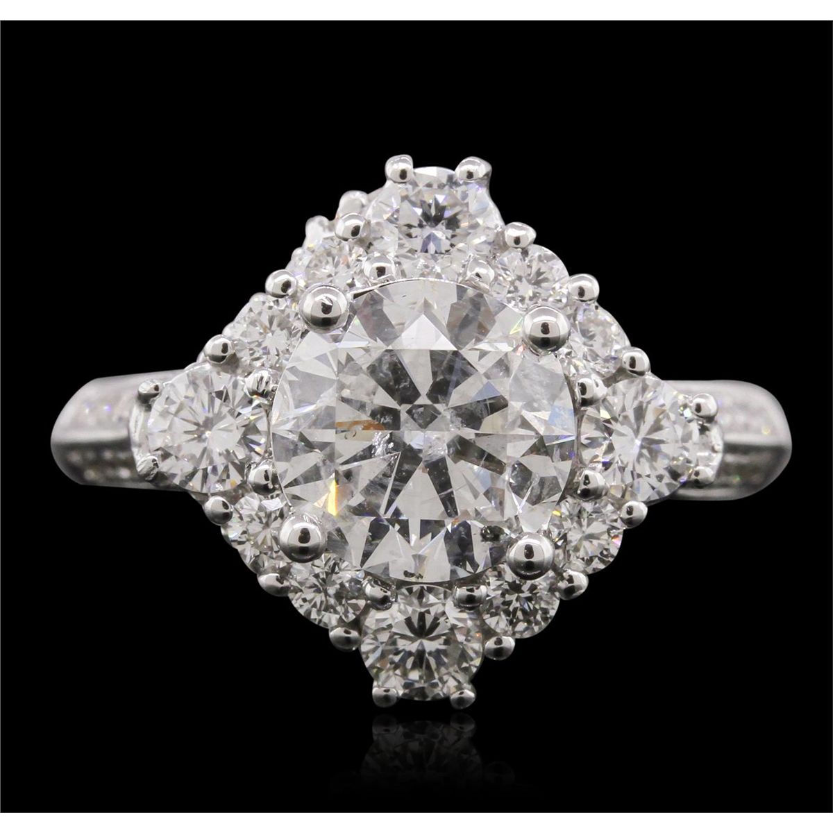 One electronically tested 18KT white gold Ladies combination cast & assembled engagement ring with a bright polish finish. Condition is new. Identified with markings of "18K". Containing: One prong set round brilliant cut diamond, measuring 7.90 - 7.90 x 5.30mm (depth est.) approximate weight of 2.02ct. Clarity: I-1. Color: H, Cut is Good. Four prong set round brilliant cut diamonds, measuring 3.20 - 3.20 x 1.92mm (depth est.) approximate. Total Weight of 4 Stones = 0.48ct. Clarity: SI-1 to SI-2. Color: H - I, Cut is Good. Eight prong set round brilliant cut diamonds, measuring 2.00 - 2.00 x 1.20mm (depth est.) approximate. Total Weight of 8 Stones = 0.23ct. Clarity: SI-2. Color: I, Cut is Good. Seventy-Four bead set round brilliant cut diamonds, measuring 1.10 - 1.10 x 0.66mm (depth est.) approximate. Total Weight of 74 Stones = 0.36ct. Clarity: I-1. Color: H - I, Cut is Good. Total Weight of Diamonds 3.09ct. Total Weight of Engagement Ring 8.00 grams. GGL Appraised at $40,030.00.