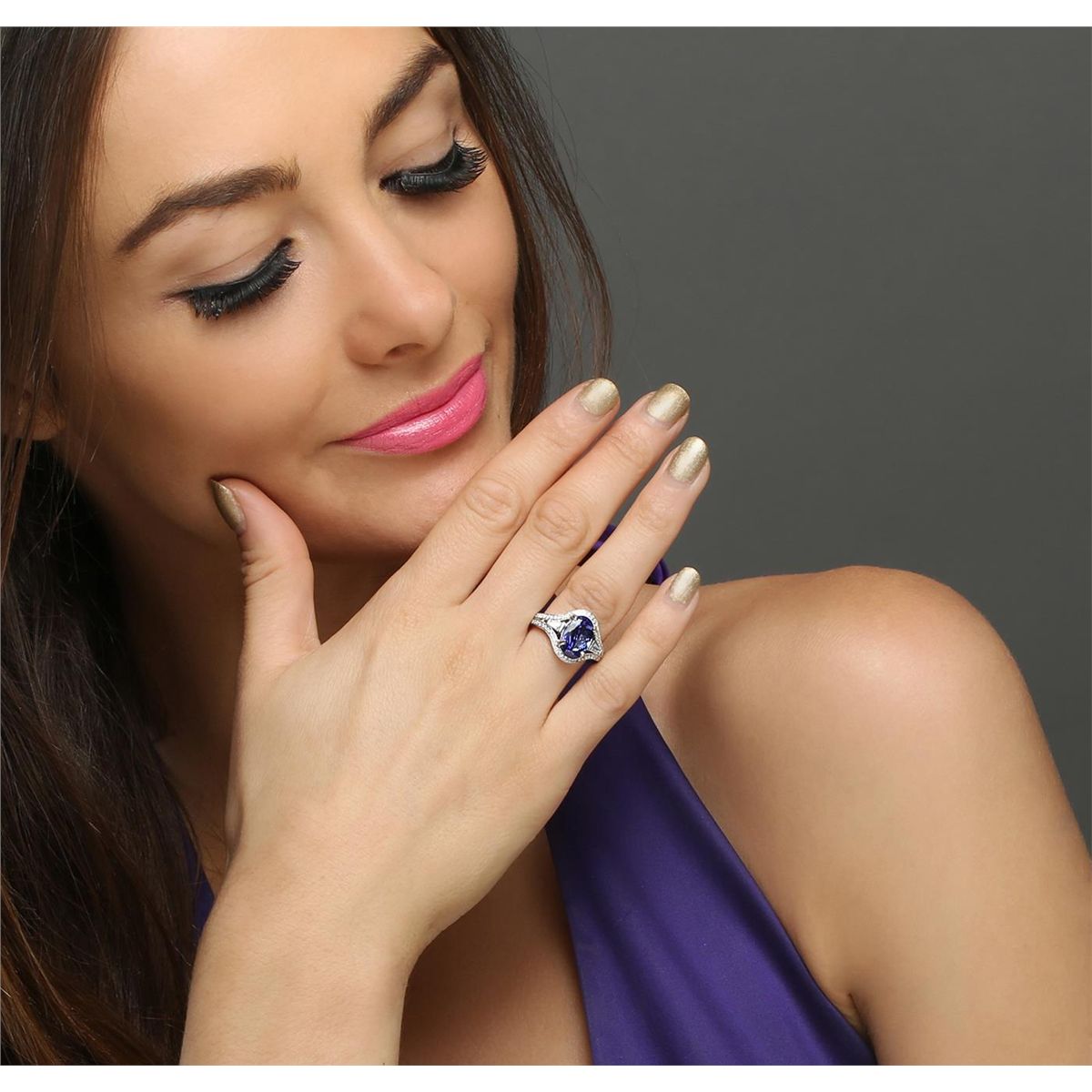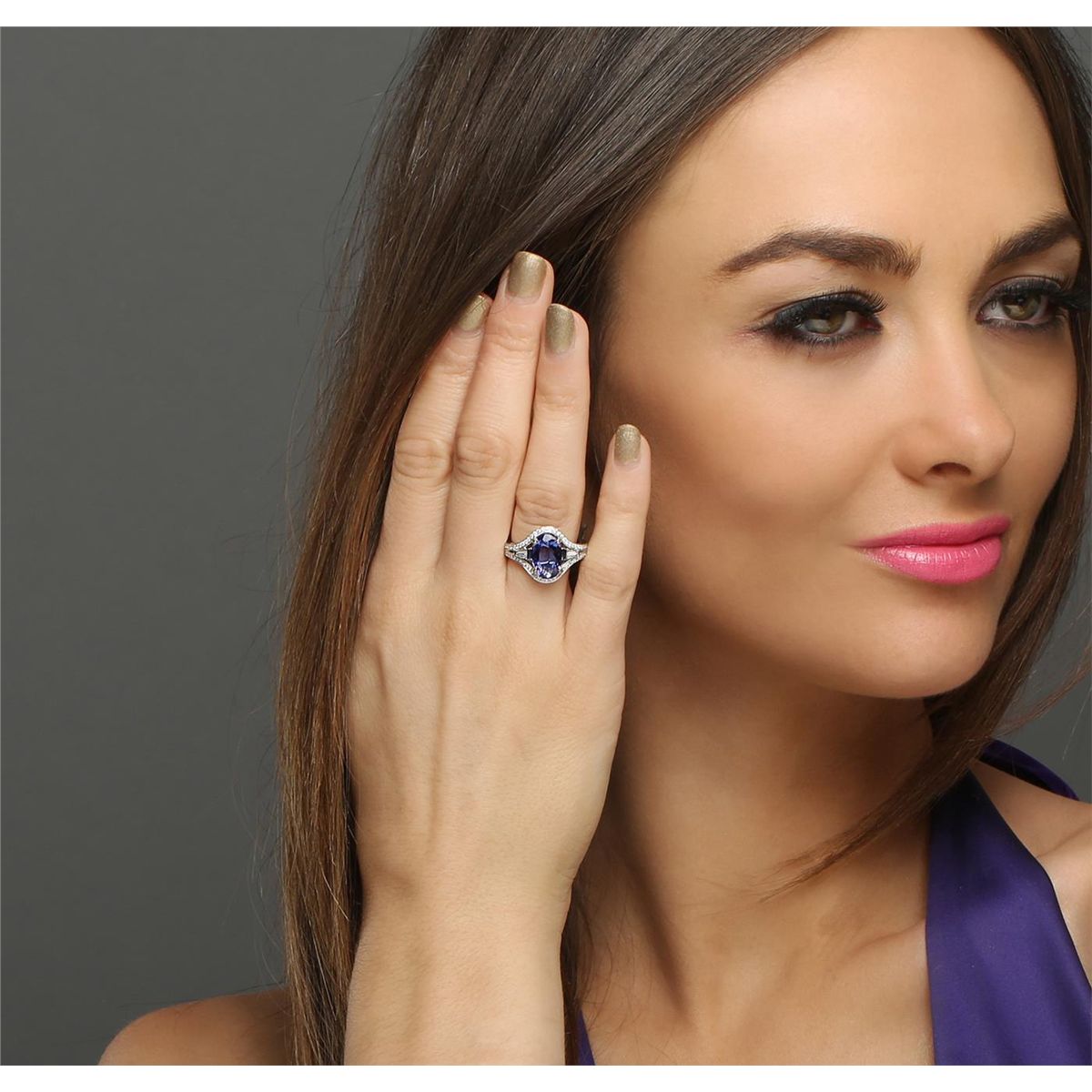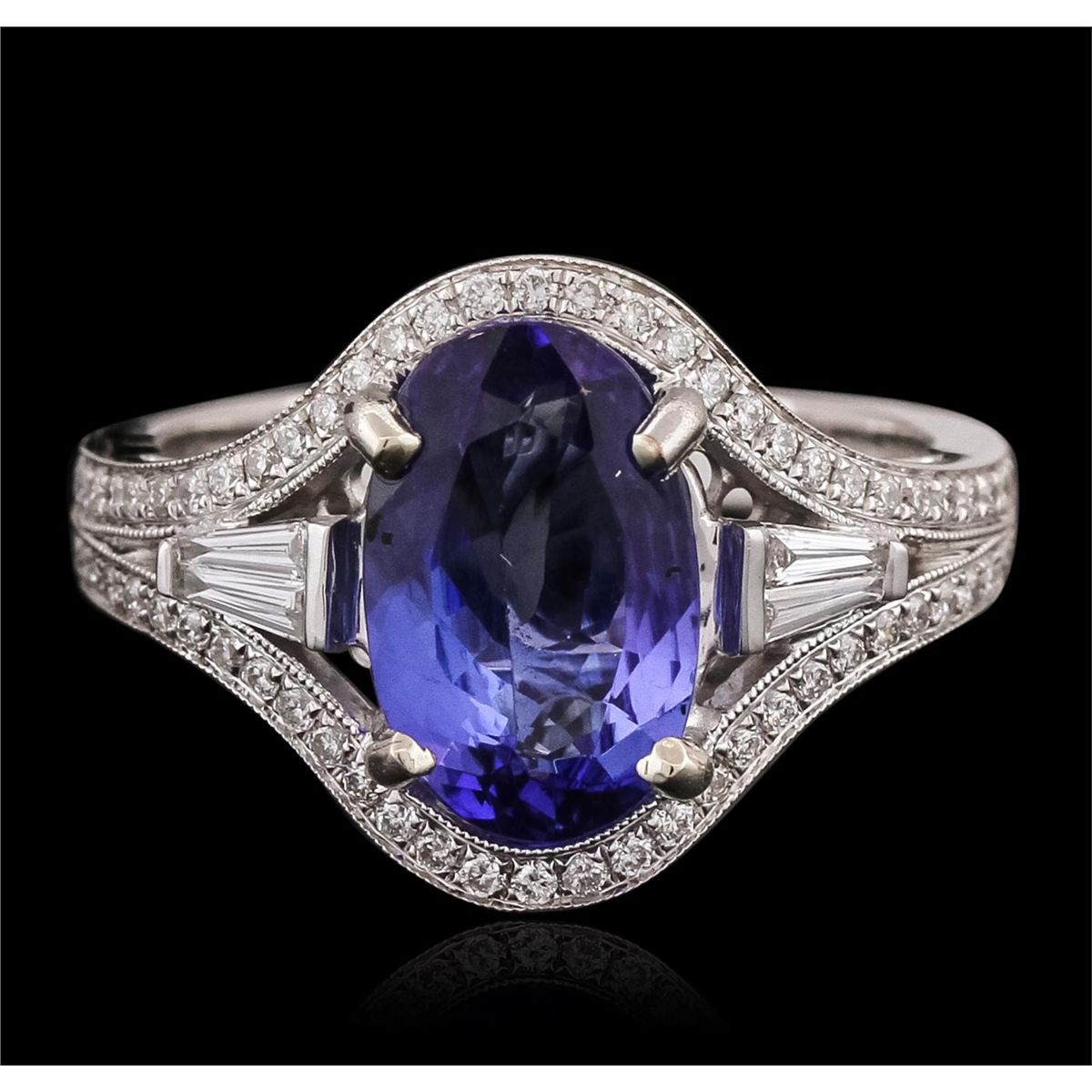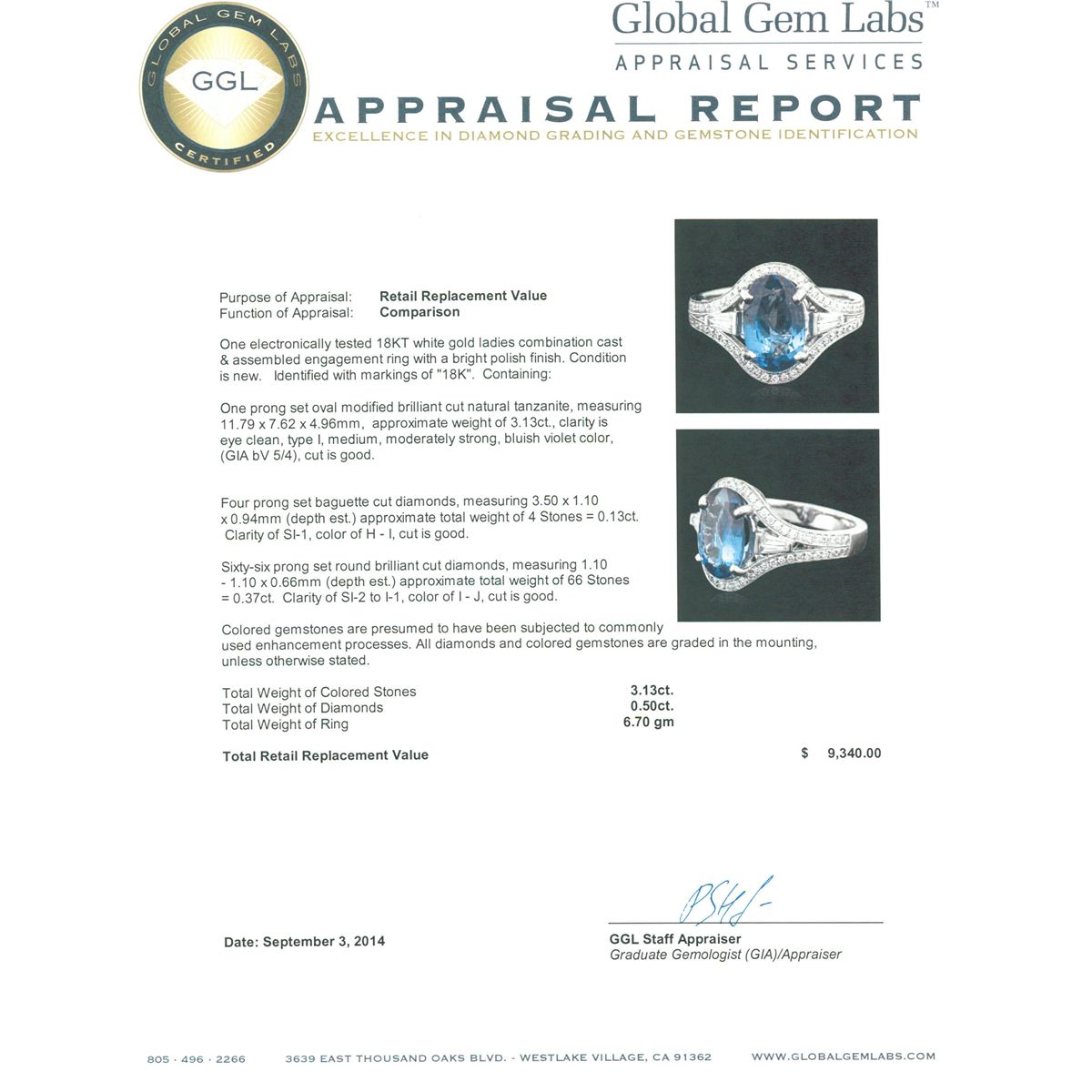 One electronically tested 18KT white gold ladies combination cast & assembled engagement ring with a bright polish finish. Identified with markings of "18K". Condition is new. Containing: One prong set oval modified brilliant cut natural tanzanite, measuring 11.79 x 7.62 x 4.96mm, approximate weight of 3.13ct., clarity is eye clean, type I, medium, moderately strong, bluish violet color, (GIA bV 5/4), cut is good. Four prong set baguette cut diamonds, measuring 3.50 x 1.10 x 0.94mm (depth est.) approximate total weight of 4 Stones = 0.13ct. Clarity: SI-1. Color: H - I, Cut is Good. Sixty-Six prong set round brilliant cut diamonds, measuring 1.10 - 1.10 x 0.66mm (depth est.) approximate total weight of 66 Stones = 0.37ct. Clarity: SI-2 to I-1. Color: I - J, Cut is Good. Colored gemstones are presumed to have been subjected to commonly used enhancement processes. All diamonds and colored gemstones are graded in the mounting, unless otherwise stated. Total Weight of Colored Stones 3.13ct. Total Weight of Diamonds 0.50ct. Total Weight of Ring 6.70 grams. GGL Appraised at $9,340.00.