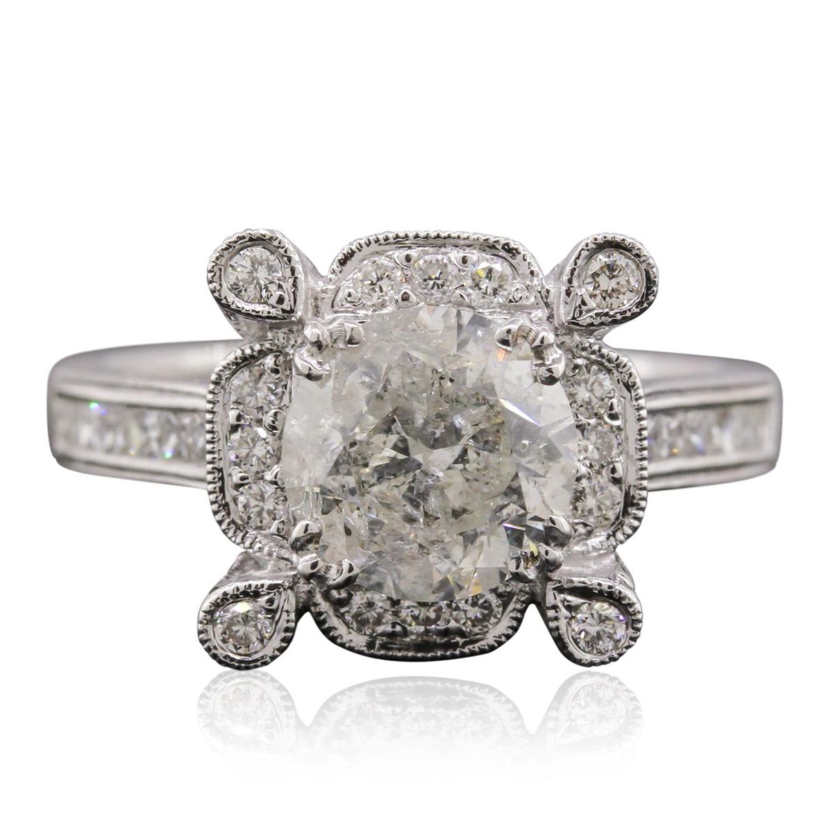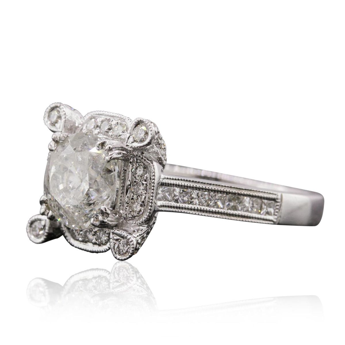 One electronically tested 18KT white gold Ladies combination cast & assembled engagement ring with a bright polish finish. Condition is new. Identified with markings of "18K". Containing: One prong set round brilliant cut diamond, measuring 8.00 - 8.00 x 5.20mm (depth est.) approximate weight of 2.03ct. Clarity: I-3. Color: J, Cut is Good. Fourteen channel set princess cut diamonds, measuring 1.70 x 1.70 x 1.28mm (depth est.) approximate. Total Weight of 14 Stones = 0.42ct. Clarity: SI-1 to SI-2. Color: I - J, Cut is Good. Eighty-Four bead set round brilliant cut diamonds, measuring 1.30 - 1.30 x 0.78mm (depth est.) approximate. Total Weight of 84 Stones = 0.67ct. Clarity: SI-1 to I-1. Color: I - J, Cut is Good. Total Weight of Diamonds 3.13ct. Total Weight of Engagement Ring 6.50 grams. GGL Appraised at $22,690.00.