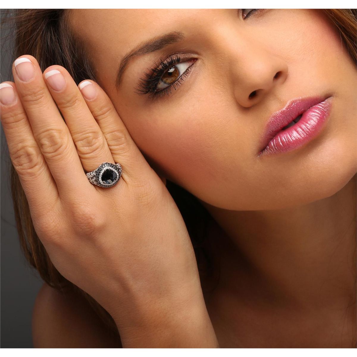 One 18KT white gold ring containing one natural pear rose cut fancy black diamond, enhanced for color, with a total weight of 1.48ct. The ring also contains black side stones: fancy black (color enhanced), and white side stones: H-I / SI2-I1 weighing 0.83ct and 0.83ct respectively. Total weight of the ring is 7.50 grams. EGL Appraised at $4,760.00.