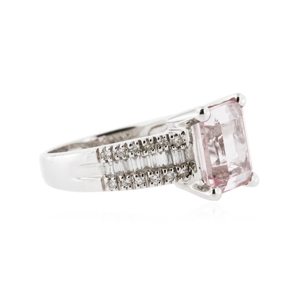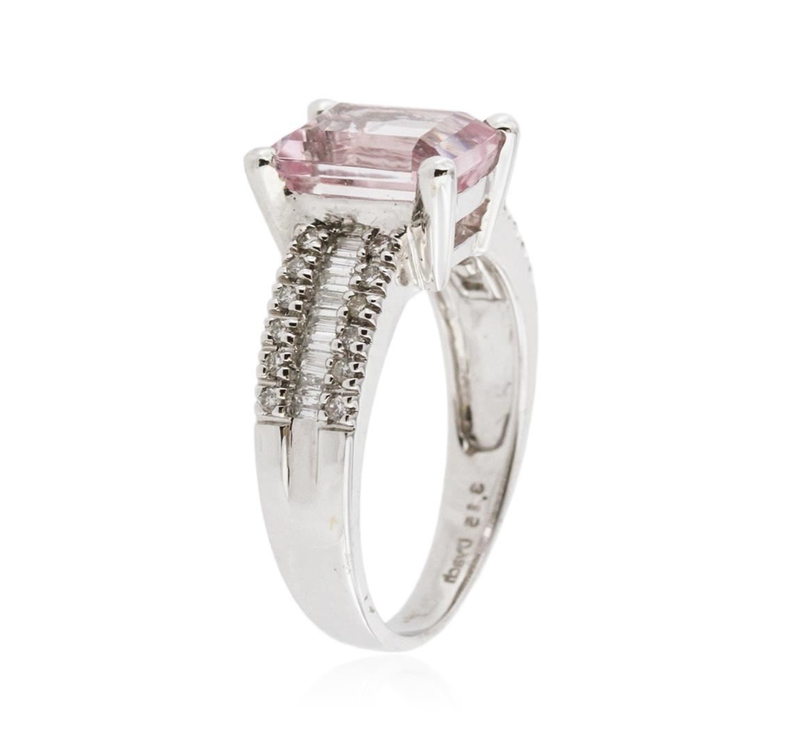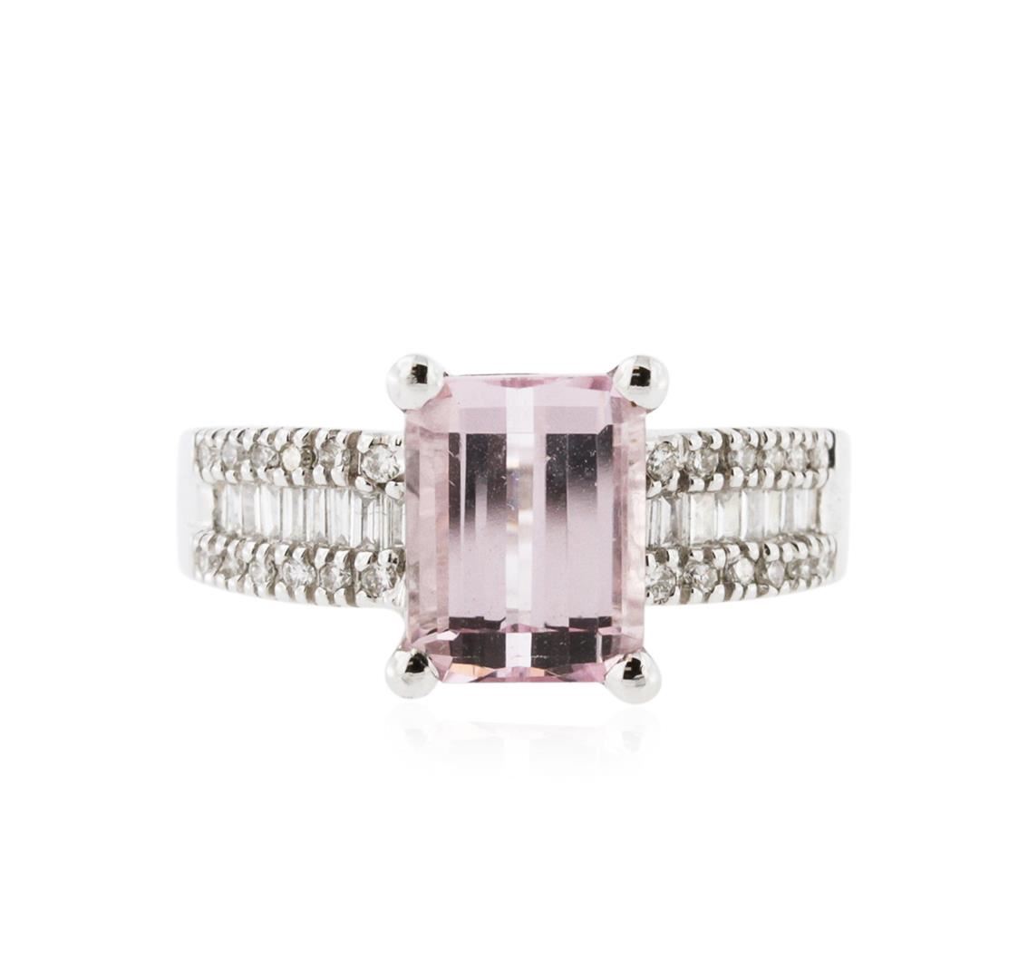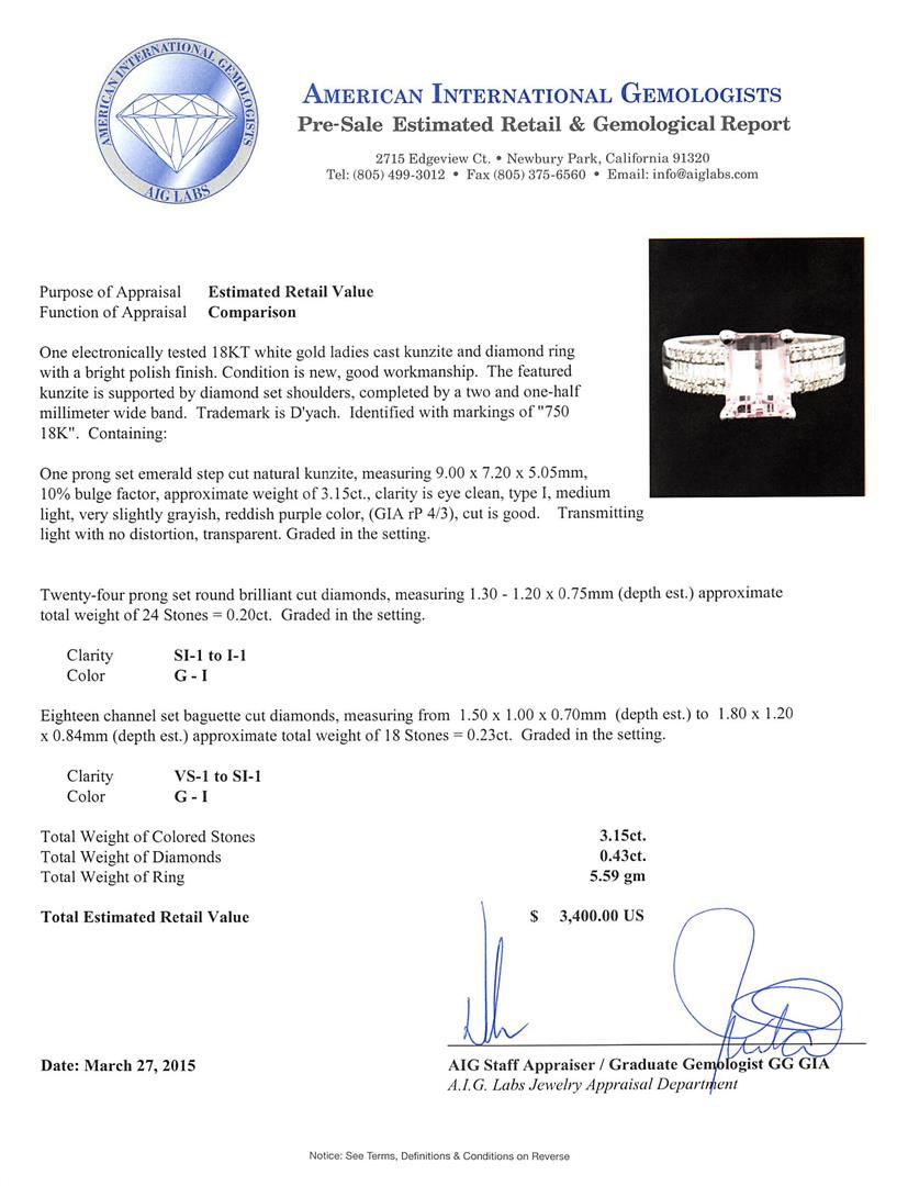 One electronically tested 18KT white gold ladies cast kunzite and diamond ring with a bright polish finish. The featured kunzite is supported by diamond set shoulders, completed by a two and one-half millimeter wide band. Trademark is D'yach. Identified with markings of "750 18K". Condition is new, good workmanship. Containing: One prong set emerald step cut natural kunzite, measuring 9.00 x 7.20 x 5.05mm, 10% bulge factor, approximate weight of 3.15ct., clarity is eye clean, type I, medium light, very slightly grayish, reddish purple color, (GIA rP 4/3), cut is good. Transmitting light with no distortion, transparent. Graded in the setting. Twenty-Four prong set round brilliant cut diamonds, measuring 1.30 - 1.20 x 0.75mm (depth est.) approximate total weight of 24 Stones = 0.20ct. Graded in the setting. Clarity: SI-1 to I-1. Color: G - I Eighteen channel set baguette cut diamonds, measuring from 1.50 x 1.00 x 0.70mm (depth est.) to 1.80 x 1.20 x 0.84mm (depth est.) approximate total weight of 18 Stones = 0.23ct. Graded in the setting. Clarity: VS-1 to SI-1. Color: G - I. Total Weight of Colored Stones 3.15ct. Total Weight of Diamonds 0.43ct. Total Weight of Ring 5.59 grams. AIG Appraised at $3,400.00.