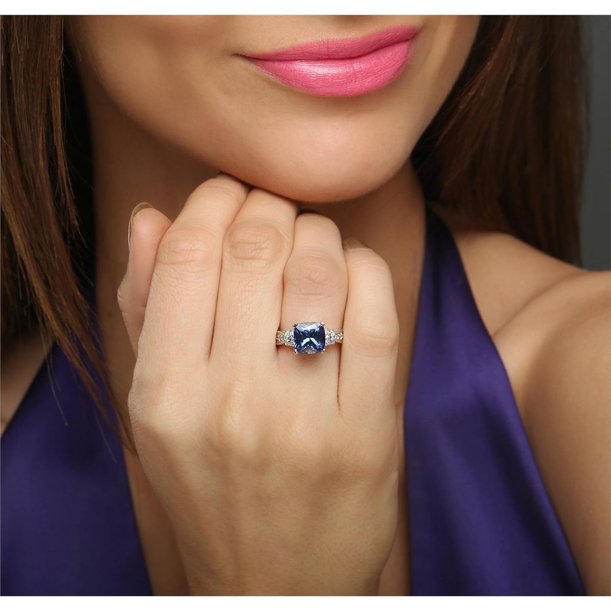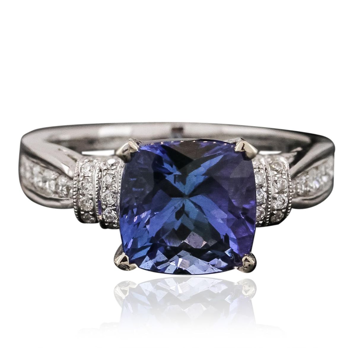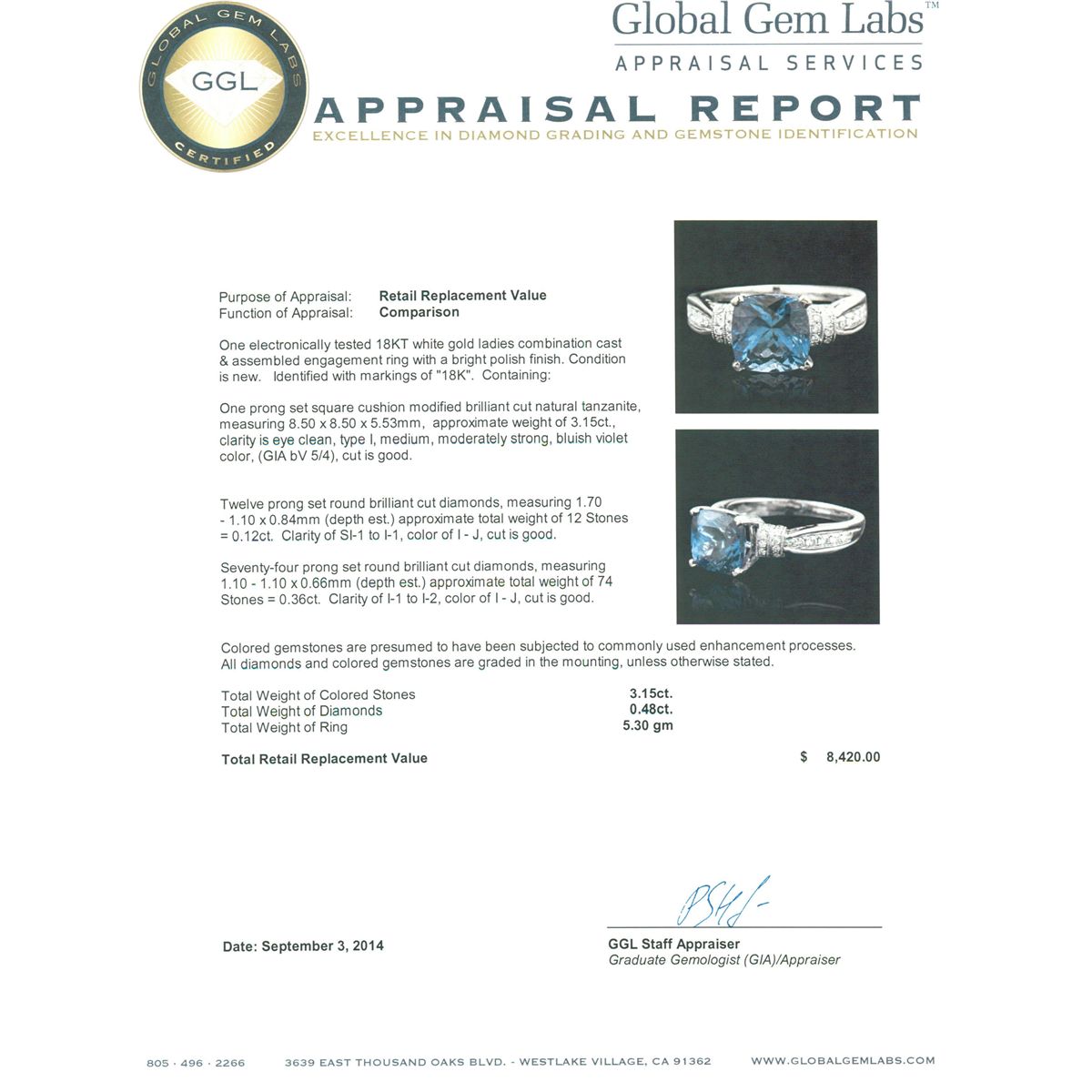 One electronically tested 18KT white gold ladies combination cast & assembled engagement ring with a bright polish finish. Identified with markings of "18K". Condition is new. Containing: One prong set square cushion modified brilliant cut natural tanzanite, measuring 8.50 x 8.50 x 5.53mm, approximate weight of 3.15ct., clarity is eye clean, type I, medium, moderately strong, bluish violet color, (GIA bV 5/4), cut is good. Twelve prong set round brilliant cut diamonds, measuring 1.70 - 1.10 x 0.84mm (depth est.) approximate total weight of 12 Stones = 0.12ct. Clarity: SI-1 to I-1. Color: I - J, Cut is Good. Seventy-Four prong set round brilliant cut diamonds, measuring 1.10 - 1.10 x 0.66mm (depth est.) approximate total weight of 74 Stones = 0.36ct. Clarity: I-1 to I-2. Color: I - J, Cut is Good. Colored gemstones are presumed to have been subjected to commonly used enhancement processes. All diamonds and colored gemstones are graded in the mounting, unless otherwise stated. Total Weight of Colored Stones 3.15ct. Total Weight of Diamonds 0.48ct. Total Weight of Ring 5.30 grams. GGL Appraised at $8,420.00.