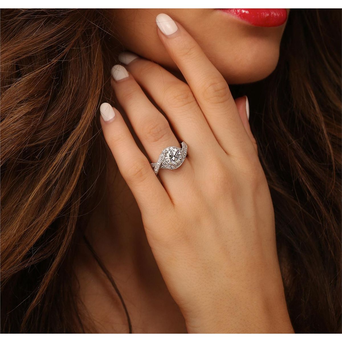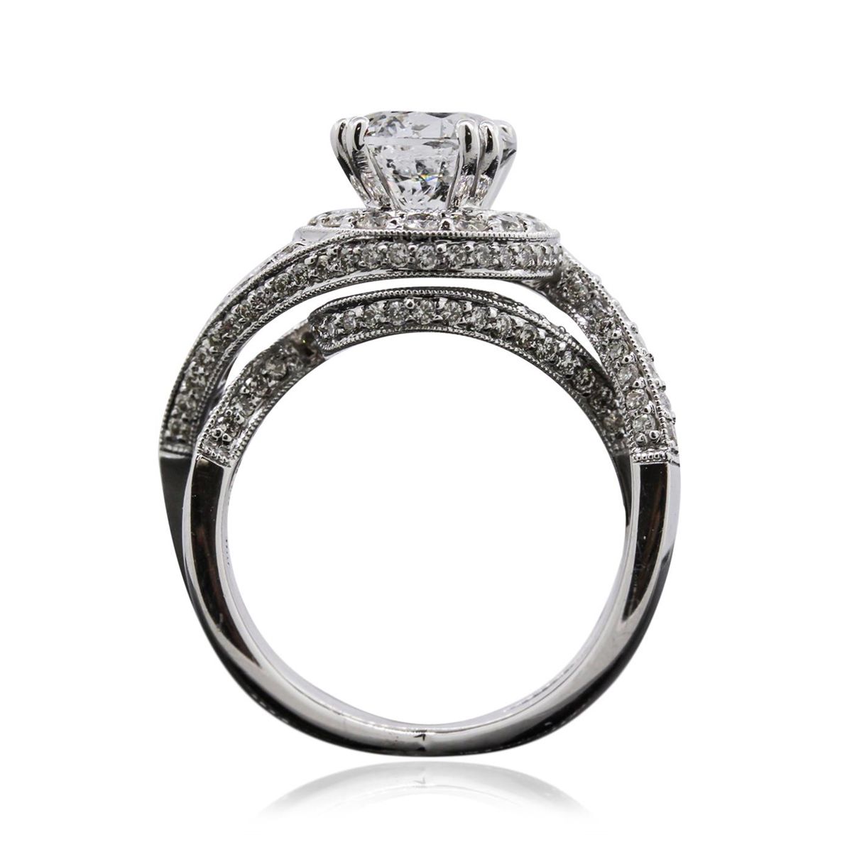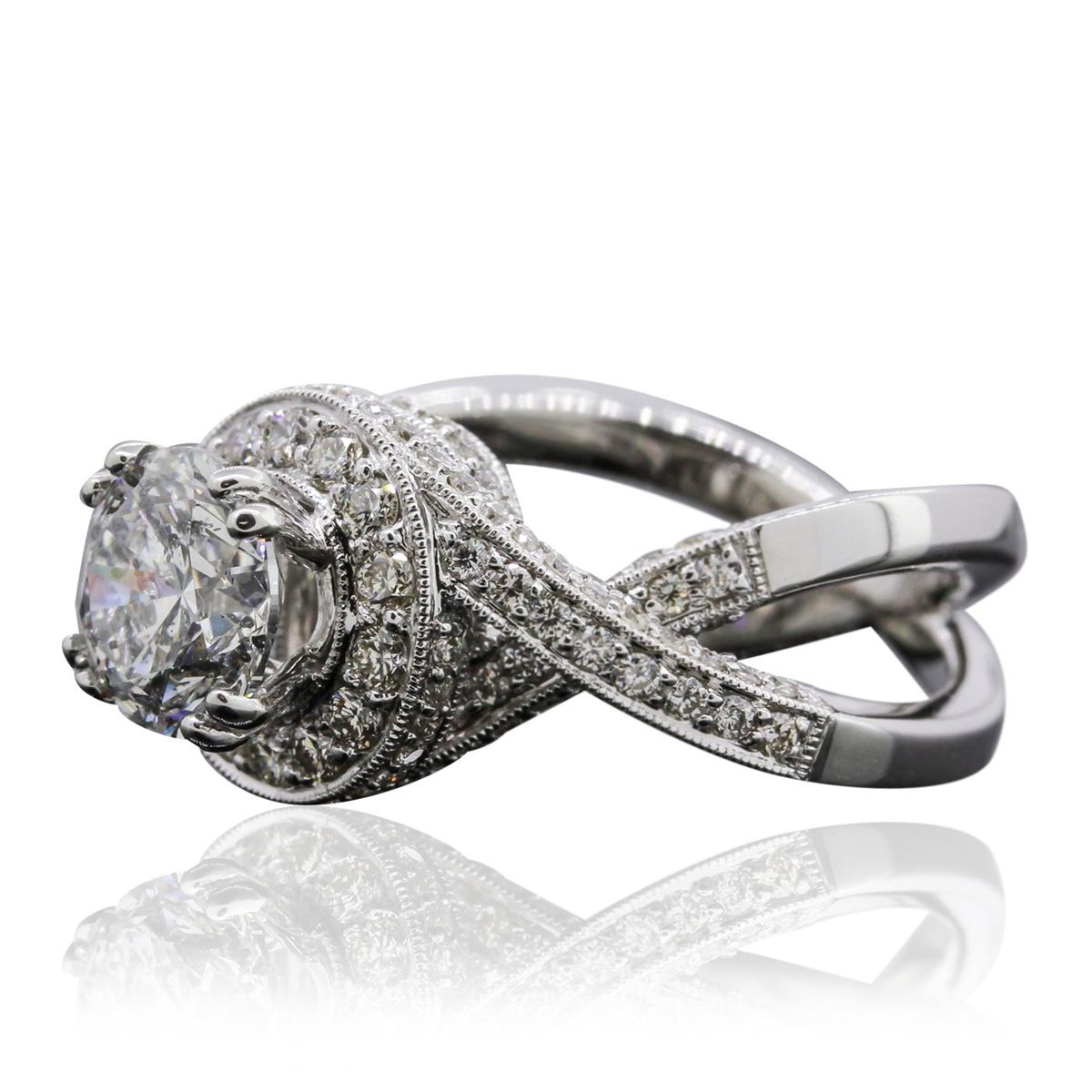One electronically tested 18KT White Gold ladies cast diamond ring. Condition is new, good workmanship. The featured diamond is set within a diamond bezel, supported by diamond set intertwined shoulders completed by a converging three millimeter wide band. Bright polish finish with milgrain detailing throughout. Identified with markings of "18K". Containing: One prong set round brilliant cut diamond, measuring 8.00 - 7.92 x 5.09mm exact weight 2.07ct. EGL Grading Report attached. Graded in the EGL Laboratory, Report #US 908549918D. Clarity I-1 Color D Depth 63.9% Table 61.0% Pavil Depth 44.1%. One hundred forty bead set round brilliant cut diamonds, measuring 1.80 - 1.00 x 0.84mm (depth est.) approximate total weight of 140 Stones = 1.10ct. Graded in the setting. Clarity VVS-2 to VS-2. Color G-I. Total Weight of Diamonds 3.17ct. Total Weight of Ring 9.30 grams. AIG Appraised at $47,110.00.