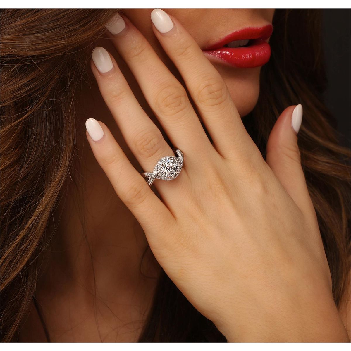One electronically tested 18KT White Gold ladies cast diamond ring. Condition is new, good workmanship. The featured diamond is set within a diamond bezel, supported by diamond set intertwined shoulders completed by a converging three millimeter wide band. Bright polish finish with milgrain detailing throughout. Identified with markings of "18K". Containing: One prong set round brilliant cut diamond, measuring 8.00 - 7.92 x 5.09mm exact weight 2.07ct. EGL Grading Report attached. Graded in the EGL Laboratory, Report #US 908549918D. Clarity I-1 Color D Depth 63.9% Table 61.0% Pavil Depth 44.1%. One hundred forty bead set round brilliant cut diamonds, measuring 1.80 - 1.00 x 0.84mm (depth est.) approximate total weight of 140 Stones = 1.10ct. Graded in the setting. Clarity VVS-2 to VS-2. Color G-I. Total Weight of Diamonds 3.17ct. Total Weight of Ring 9.30 grams. AIG Appraised at $47,110.00.