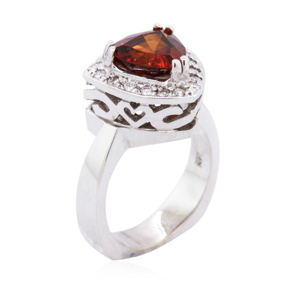 One electronically tested 18KT white gold ladies combination cast & assembled garnet and diamond ring with a flat shank with a bright polish finish. Identified with markings of "18K". Condition is new. Containing: One prong set triangle modified brilliant cut natural pyrope garnet, measuring 9.00 x 9.00 x 5.85mm, approximate weight of 3.18ct., clarity is eye clean, type II, dark, very slightly brownish, brownish red color, (GIA slpR 7/3), cut is very good. Eighteen prong set round brilliant cut diamonds, measuring 1.50 - 1.50 x 0.90mm (depth est.) approximate total weight of 18 Stones = 0.22ct. Clarity: SI-2 to I-1. Color: I - J, Cut is Good. All diamonds and colored gemstones are graded in the mounting, unless otherwise stated. Colored gemstones are presumed to have been subjected to commonly used enhancement processes. Total Weight of Colored Stones 3.18ct. Total Weight of Diamonds 0.22ct. Total Weight of Ring 11.20 grams. GGL Appraised at $6,000.00.